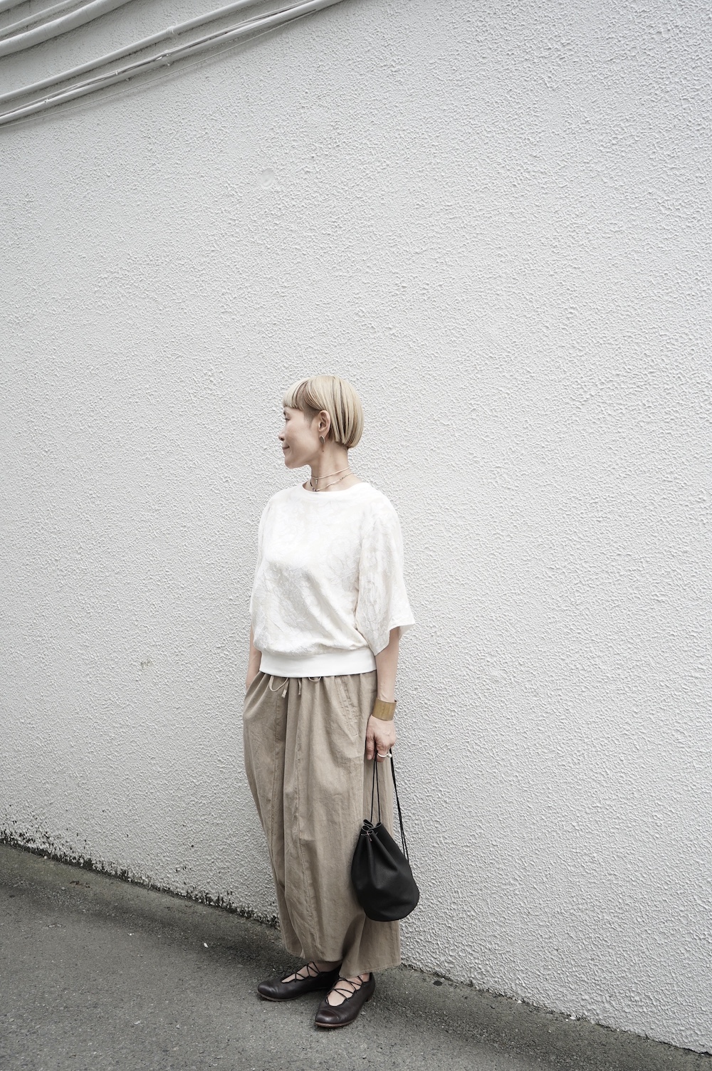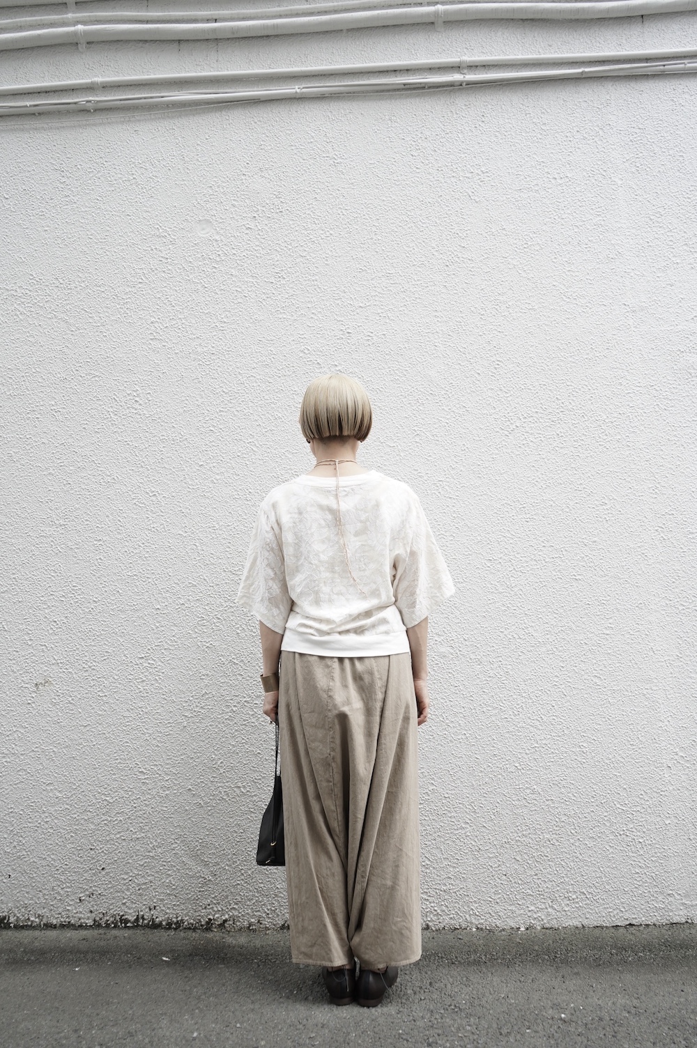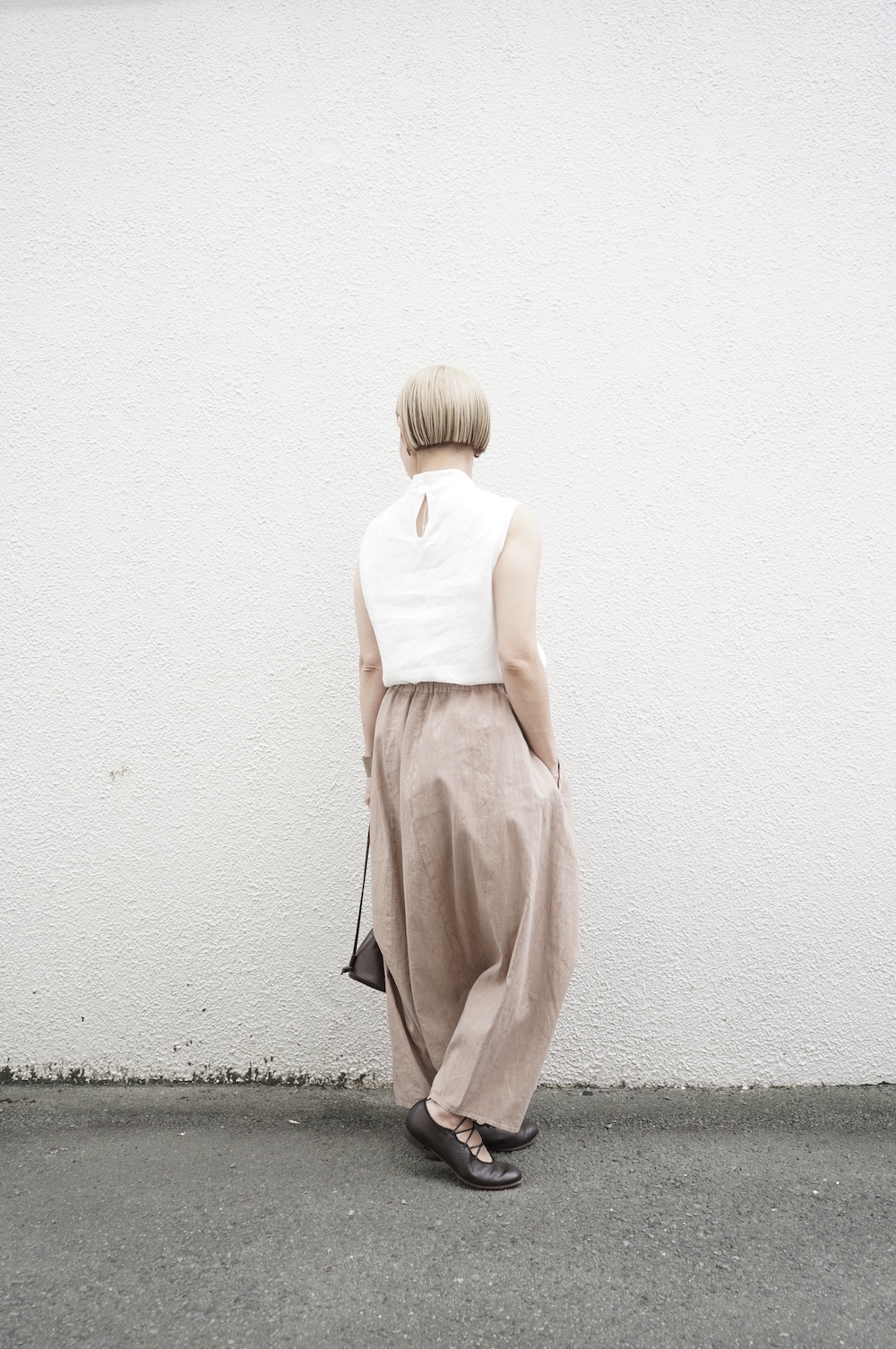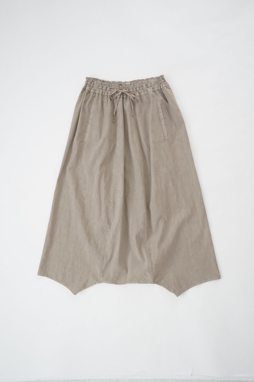 デザインは股上が裾の位置に近いところまであり、一見スカートのようなシルエットに見えます。サルエルパンツというと股下の生地のたまり方やボリュームが気になるところ、こちらは綺麗な収まり方でボリュームが程良く、スッキリと穿いていただけます。ウェストはゴムとヒモです。