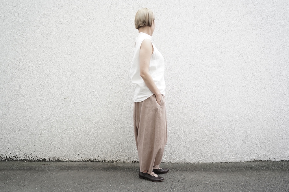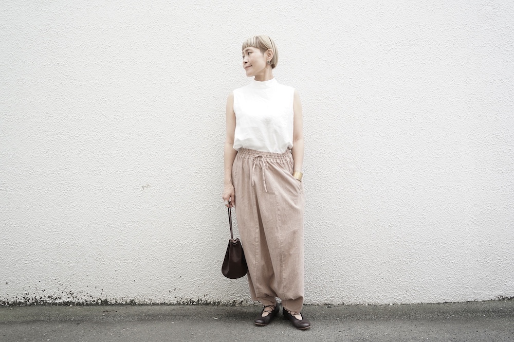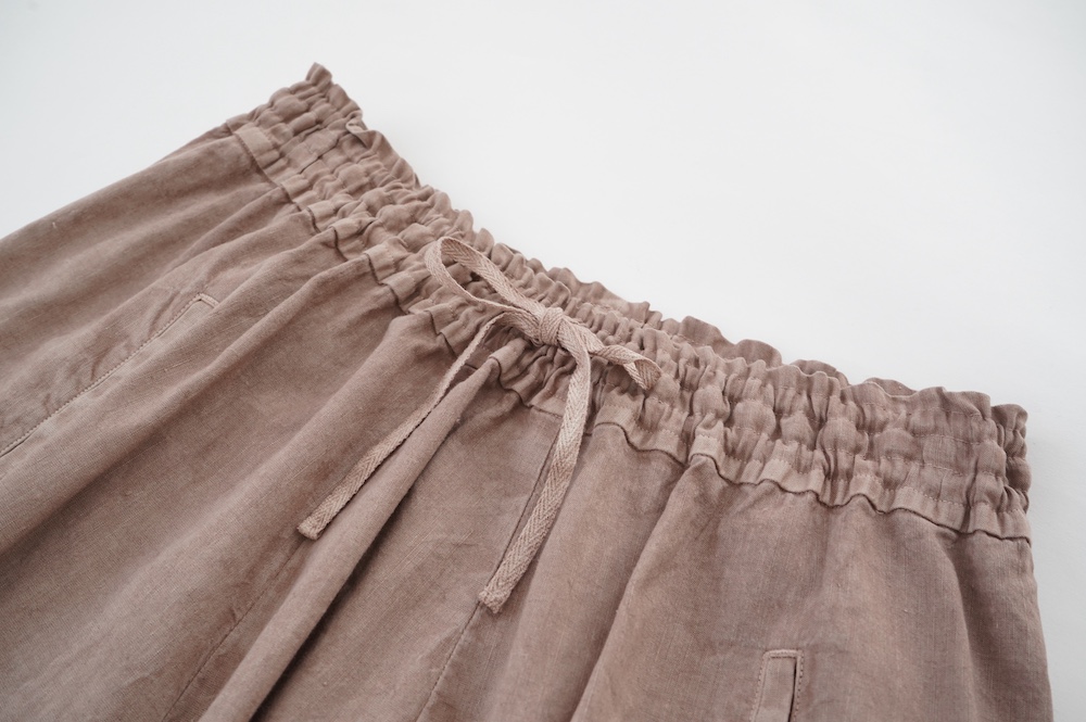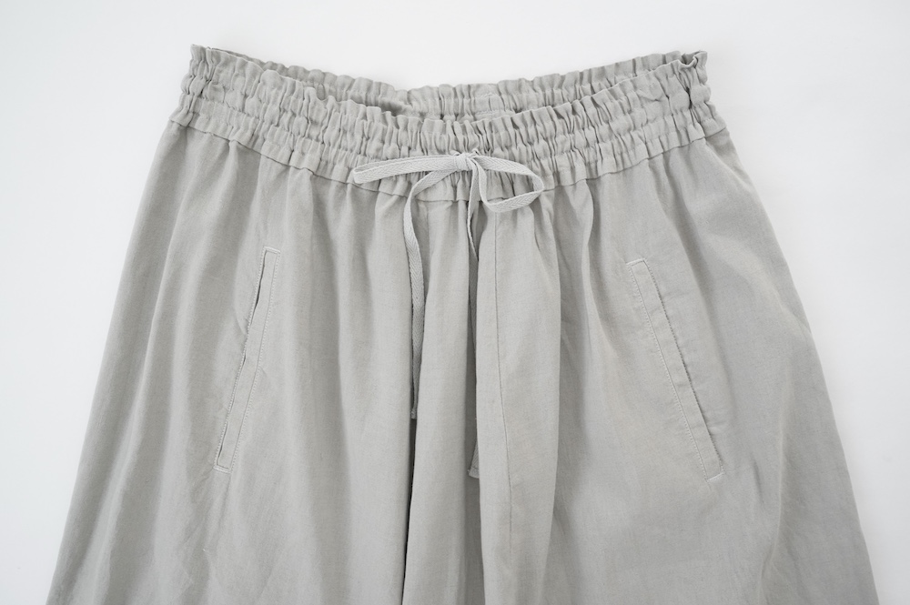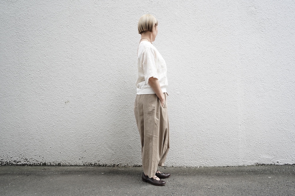 ”ファクトリー”のパンツ。パリッとハリ感のあるコットンリネン生地を使用。これからの季節に心地よいさらさらな手触りです。
