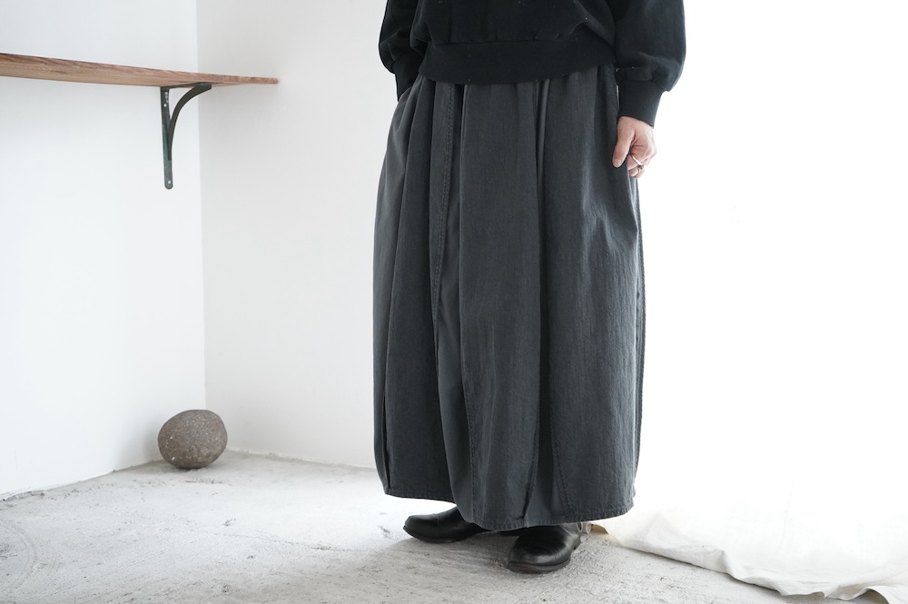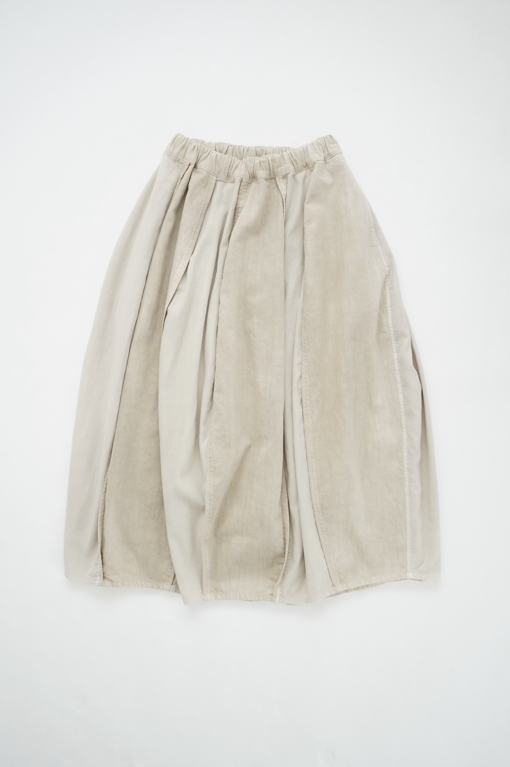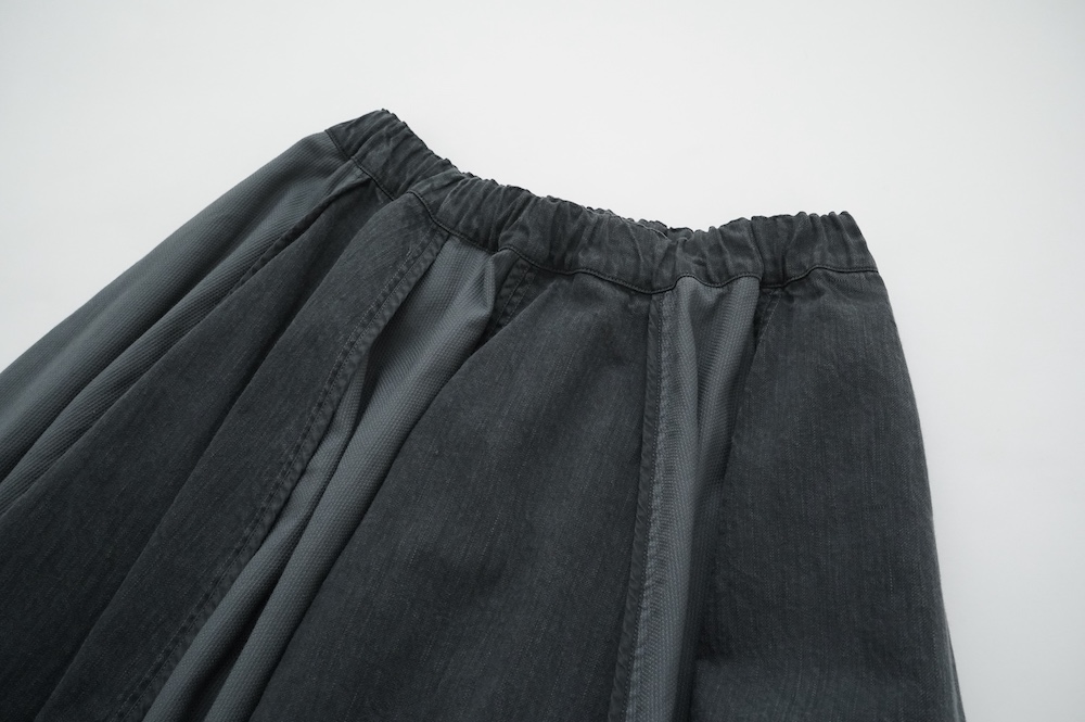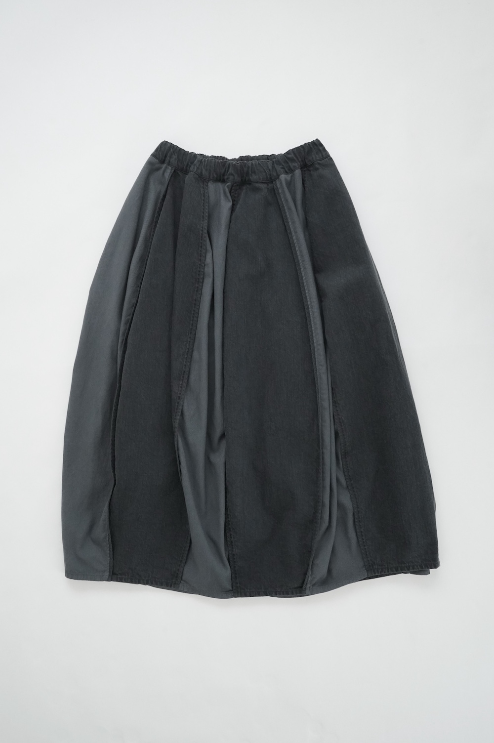 デザインは2種類の素材を使用し、裾が窄まっている立体的なバルーンシルエットのスカート。パッチワークのように縦に2種類の生地を交互に縫い合わせて、表側に出る縫い合わせ部分をパイピングしています。とても立体感のあるシルエットです。ウエストはゴムのみ、両サイドには嬉しいポケットつきです。程よいボリューム感と丸みのあるシルエットが存在感抜群で、シンプルなスタイリングに映えるスカートです。