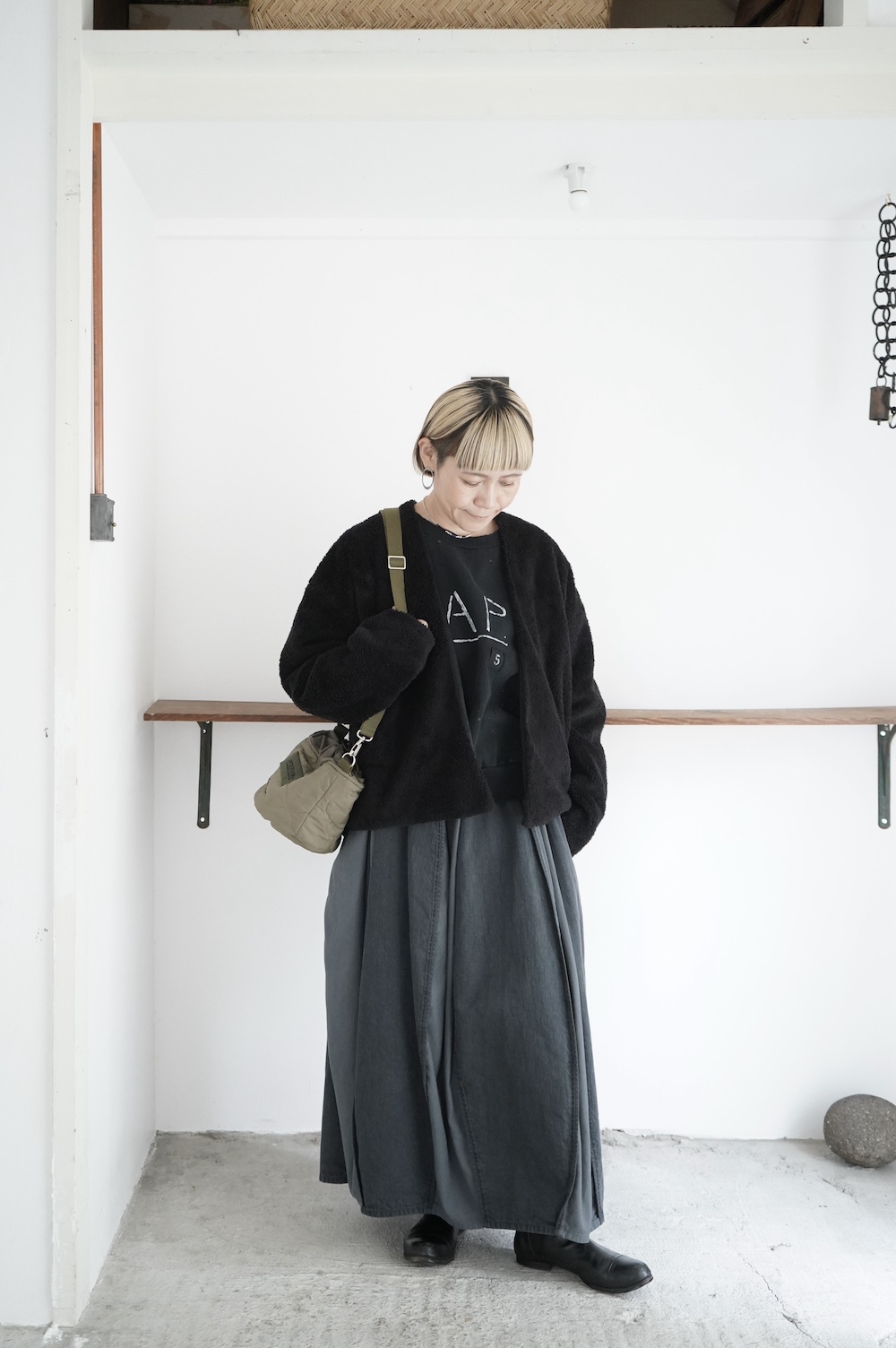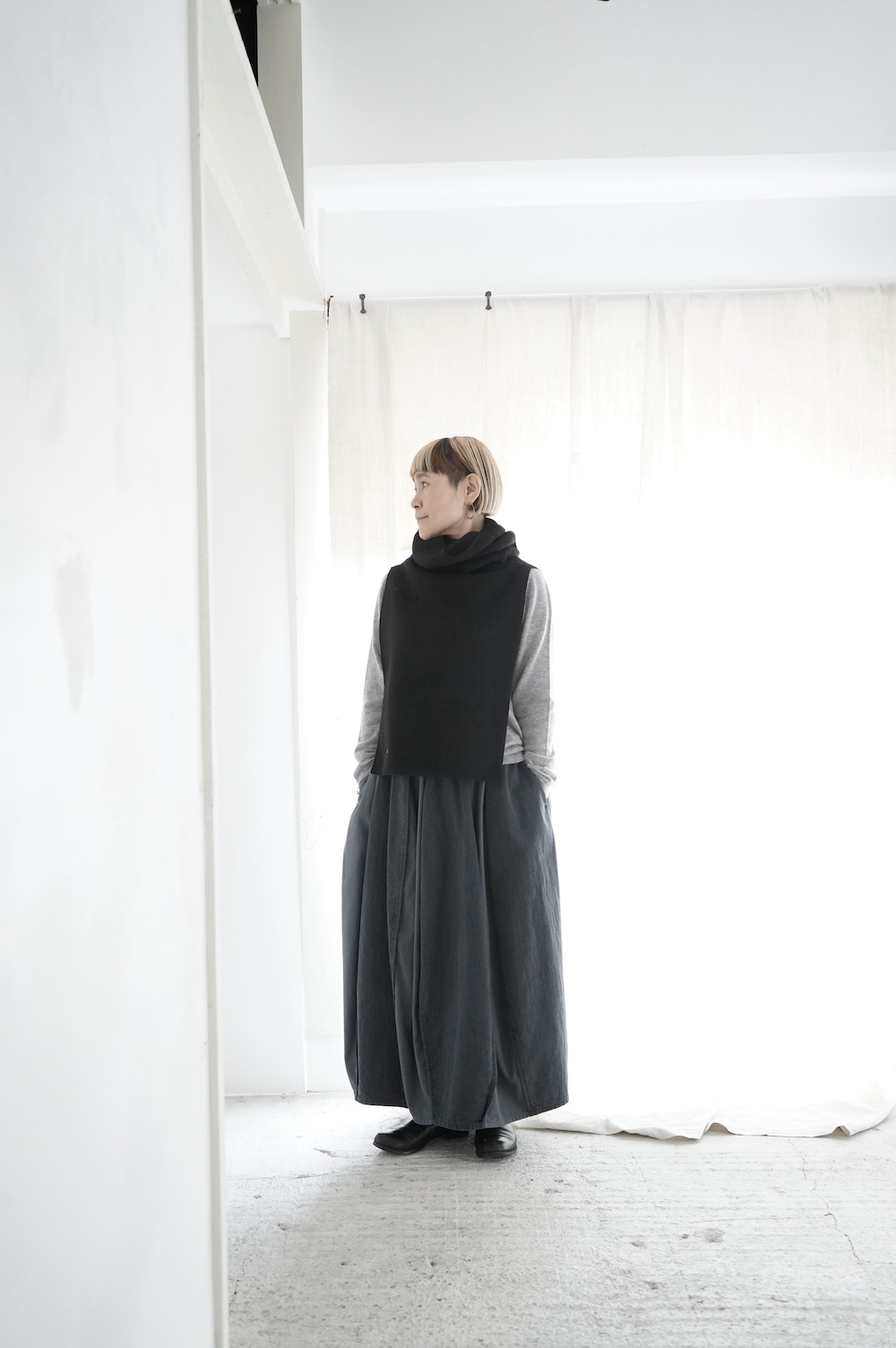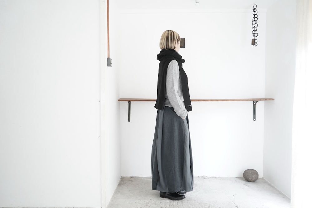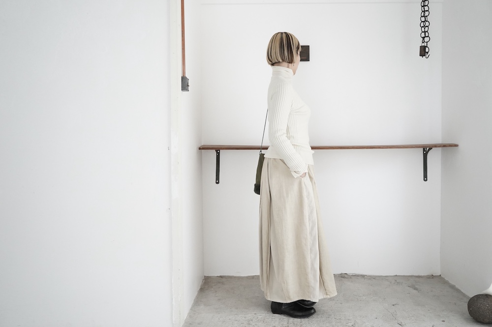 デザインは2種類の素材を使用し、裾が窄まっている立体的なバルーンシルエットのスカート。パッチワークのように縦に2種類の生地を交互に縫い合わせて、表側に出る縫い合わせ部分をパイピングしています。とても立体感のあるシルエットです。ウエストはゴムのみ、両サイドには嬉しいポケットつきです。程よいボリューム感と丸みのあるシルエットが存在感抜群で、シンプルなスタイリングに映えるスカートです。