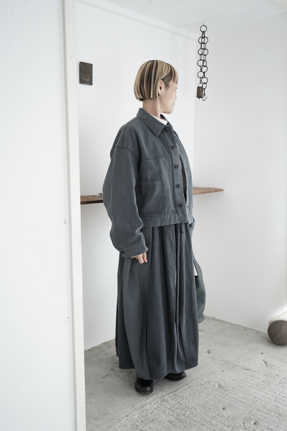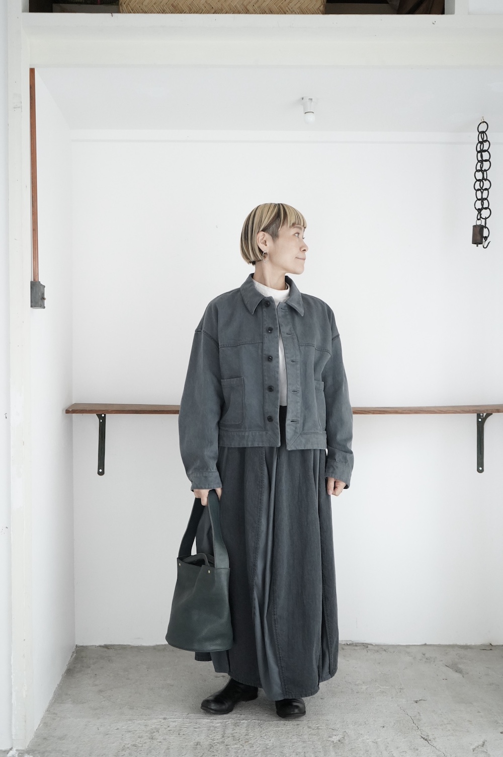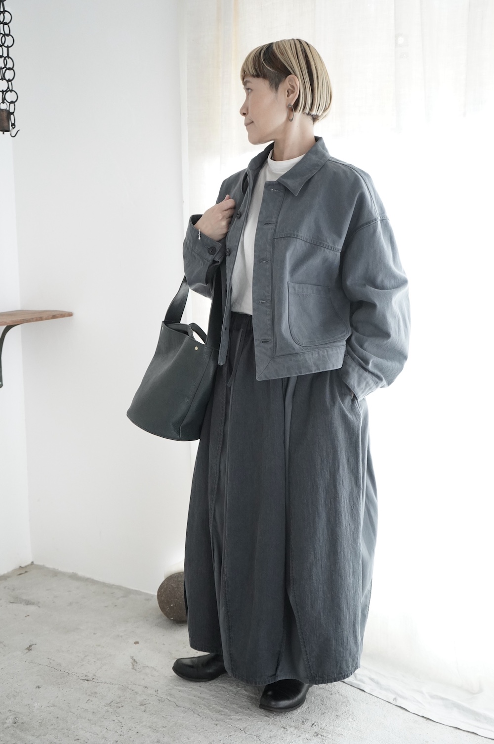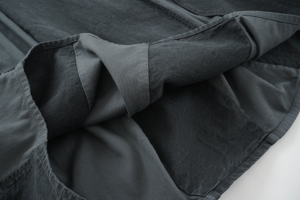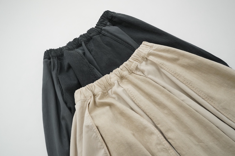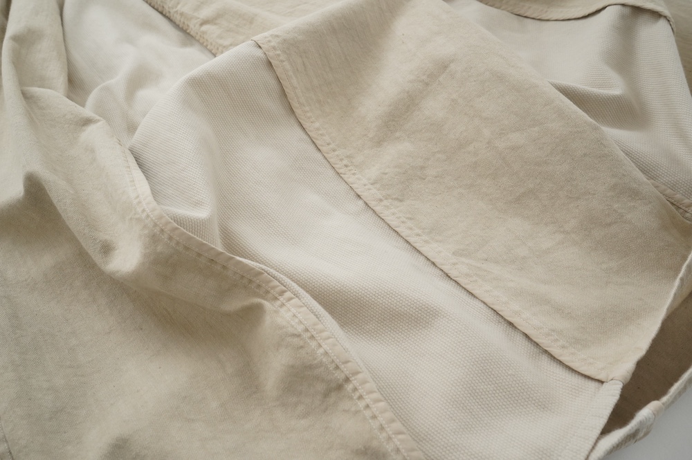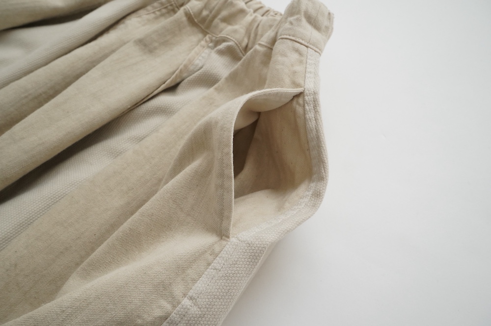 FACTORYのスカート。綿刺し子生地とジンバブエコットン生地の2種類の生地を使用。綿刺し子は「道着」を連想させるような見た目に反し、軽くしなやかで、丈夫さを兼ね備えた素材です。刺子織と呼ばれるドビーのような素材で、しっかりしているが硬さはなく、新品時から柔らかい感触です。ジンバブエコットンも丈夫でありながらとても柔らかく、綿カスや糸のフシなど綿のナチュラルな風合いをそのまま活かしているのも魅力です。