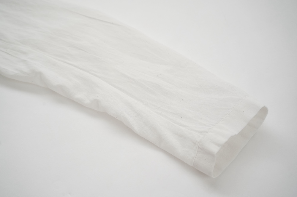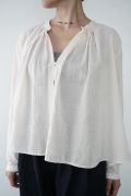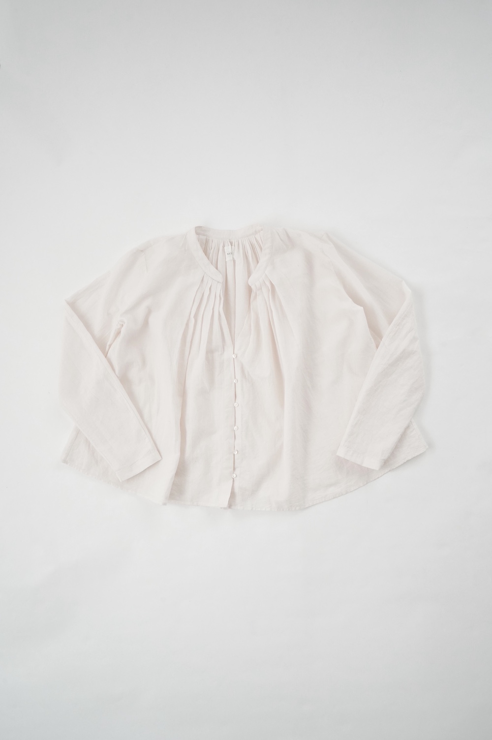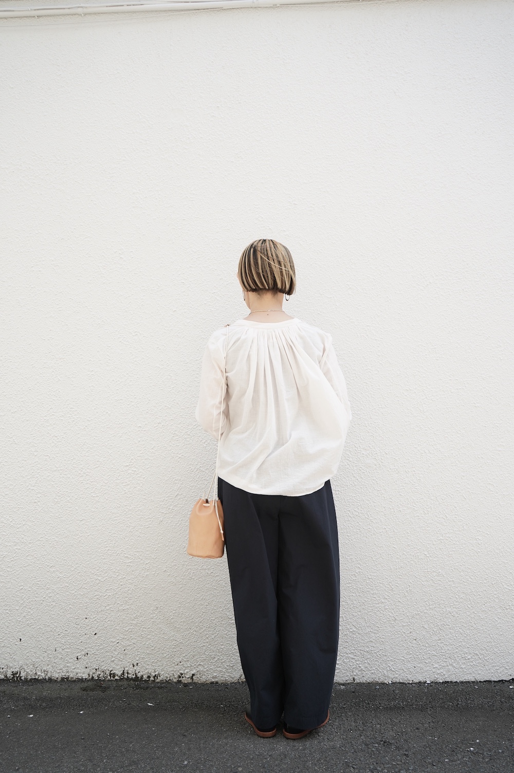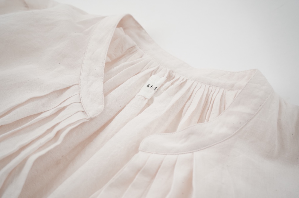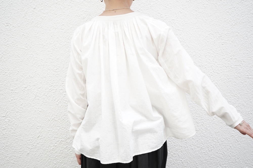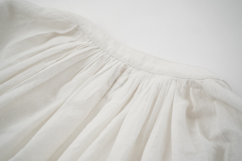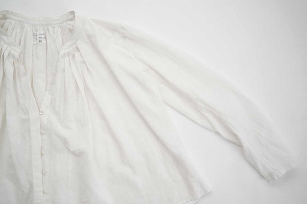 デザインは、そのカディーを贅沢に使い、ネック、背面にわたり、計算された美しいタックが多数施されます。これにより、着用した際のバランスの良さ、大きなバスト寸にも関わらず華奢でスッキリした印象は生まれます。特に、背面に施されたラジャスタンタックギャザーは、見た目にも美しい。また、ブラウスながら、後付けの袖にこだわり、独特なフォルムを形成しています。肘を膨らませた立体的な袖は、ジャケットのようなデザインです。1着のブラウスに込めた、ベス・ニールセンの思いが感じられます。手洗いで、大切に生涯着続けてほしいブラウスです。ボタンホールはなく、ループにボタンを通すタイプです。