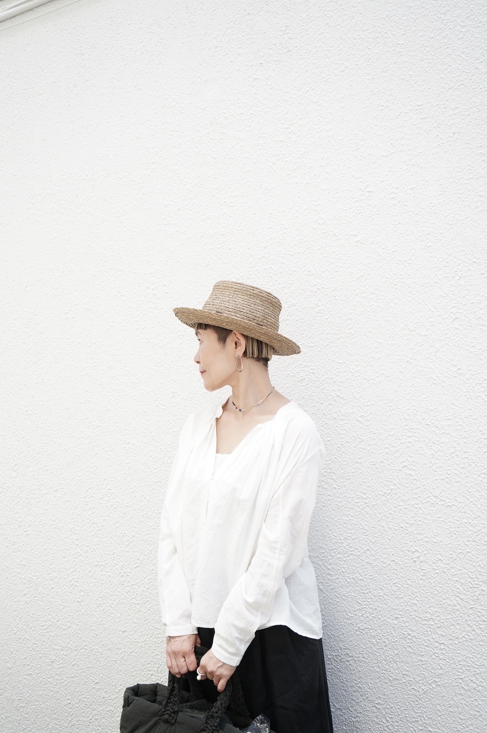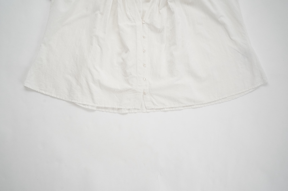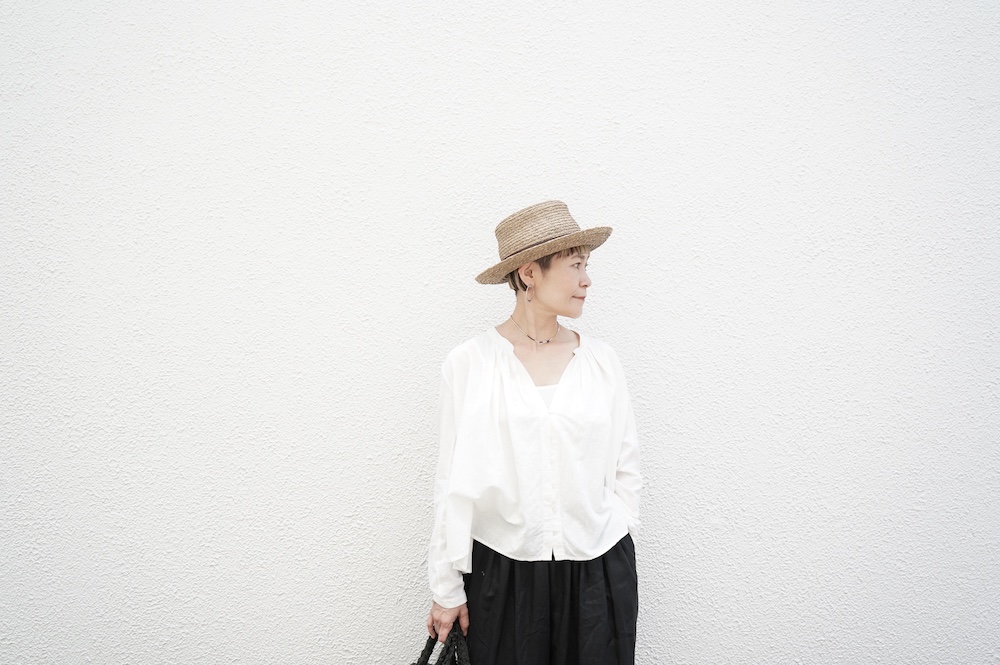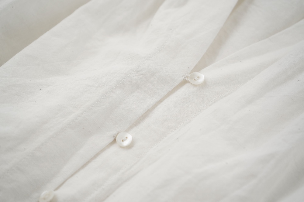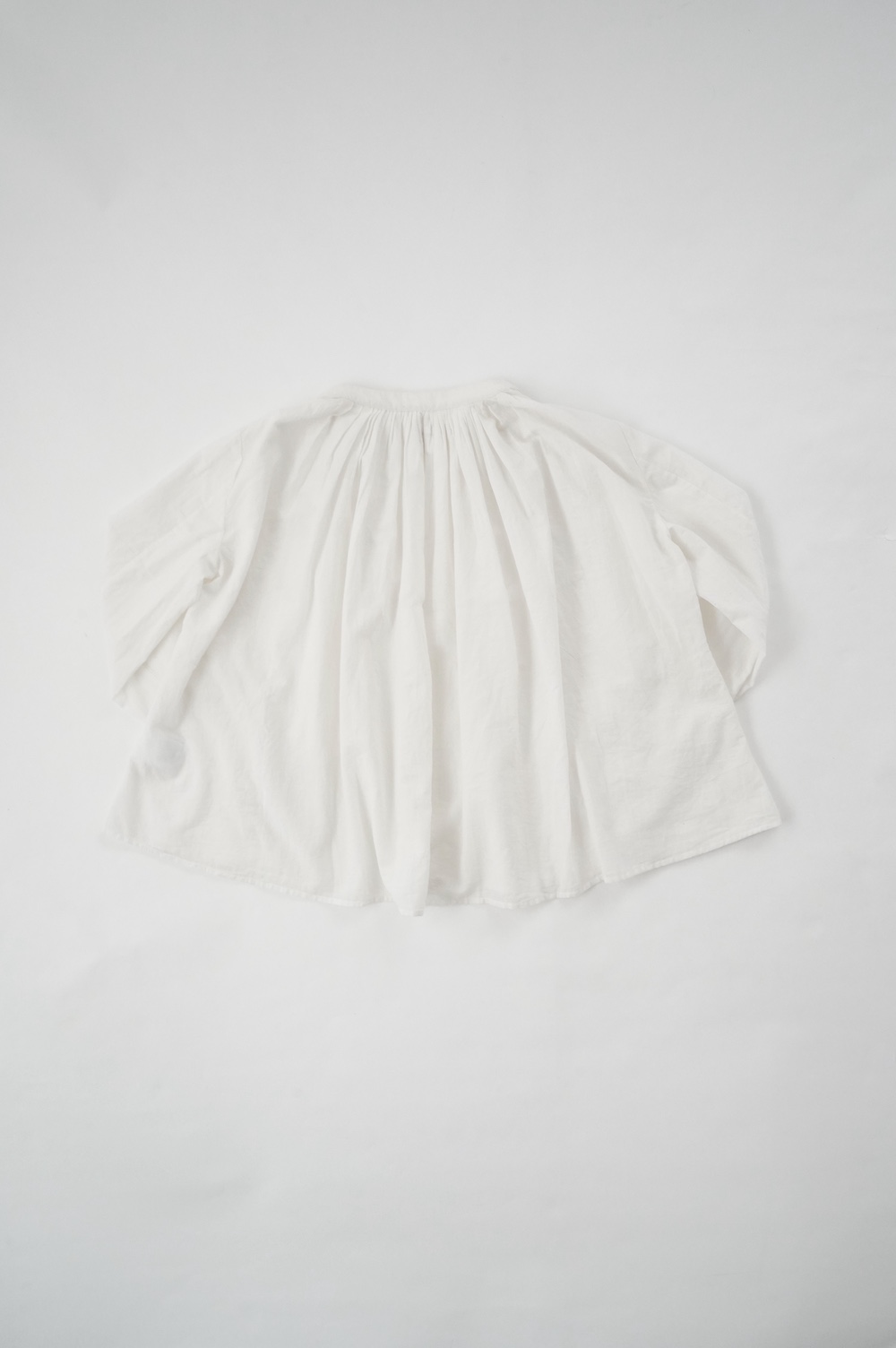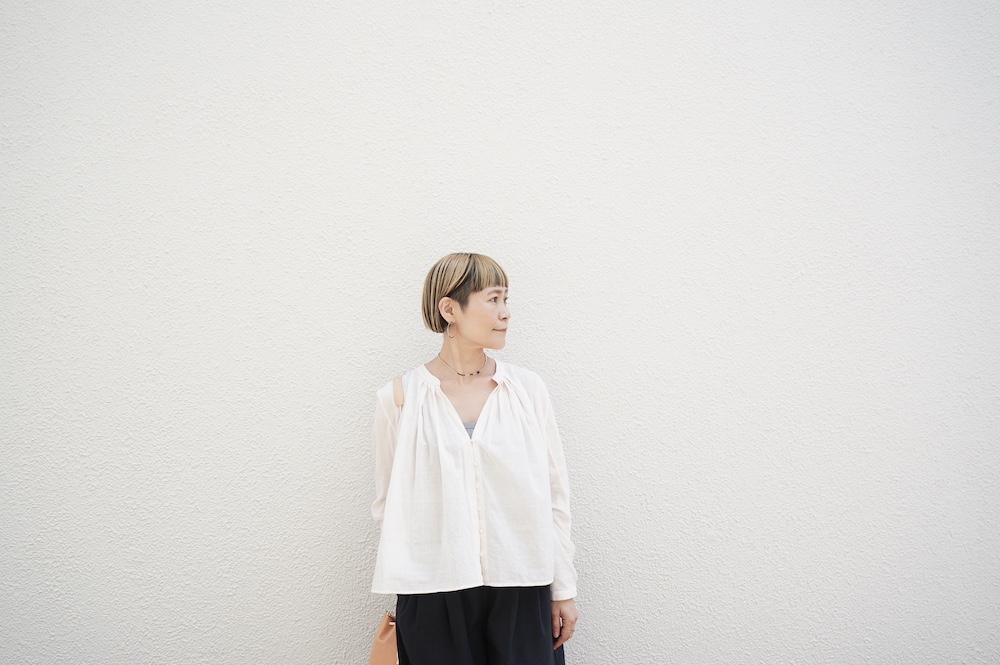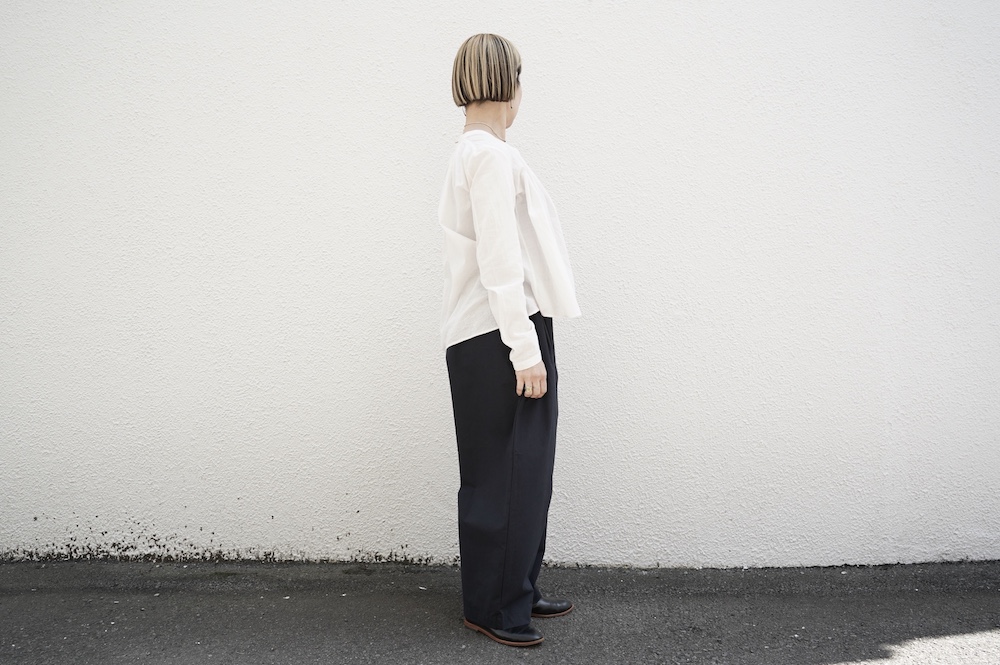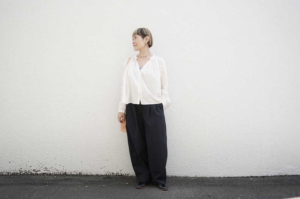デザインは、そのカディーを贅沢に使い、ネック、背面にわたり、計算された美しいタックが多数施されます。これにより、着用した際のバランスの良さ、大きなバスト寸にも関わらず華奢でスッキリした印象は生まれます。特に、背面に施されたラジャスタンタックギャザーは、見た目にも美しい。また、ブラウスながら、後付けの袖にこだわり、独特なフォルムを形成しています。肘を膨らませた立体的な袖は、ジャケットのようなデザインです。1着のブラウスに込めた、ベス・ニールセンの思いが感じられます。手洗いで、大切に生涯着続けてほしいブラウスです。ボタンホールはなく、ループにボタンを通すタイプです。