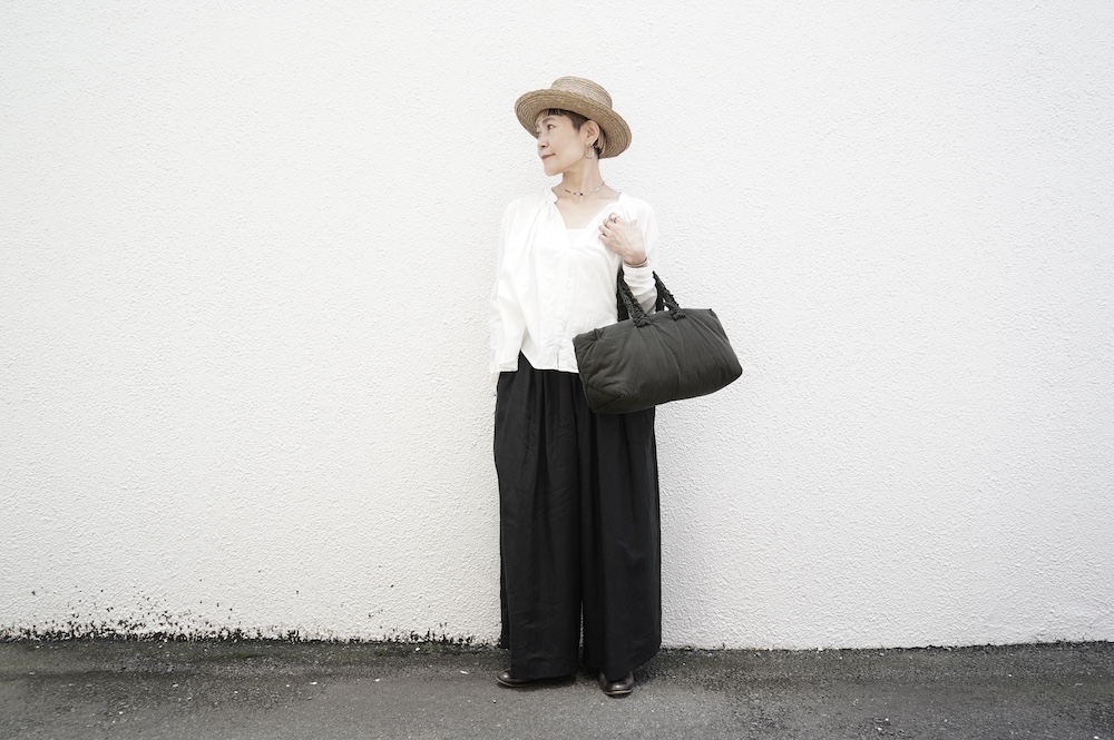 ゆったりとしたバストに対してすっきりと細身の袖が美しい