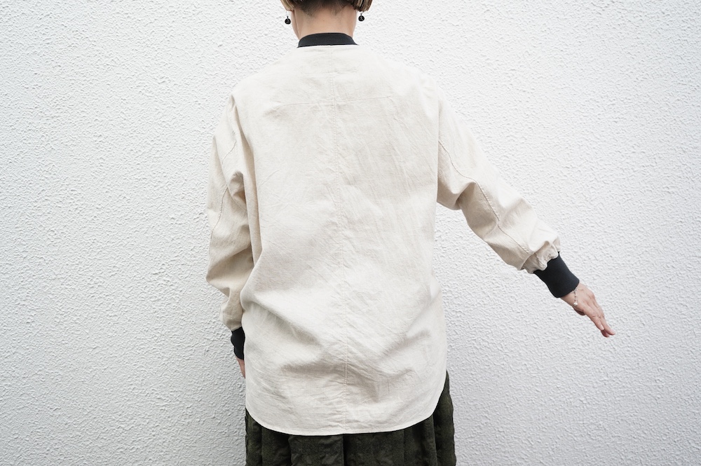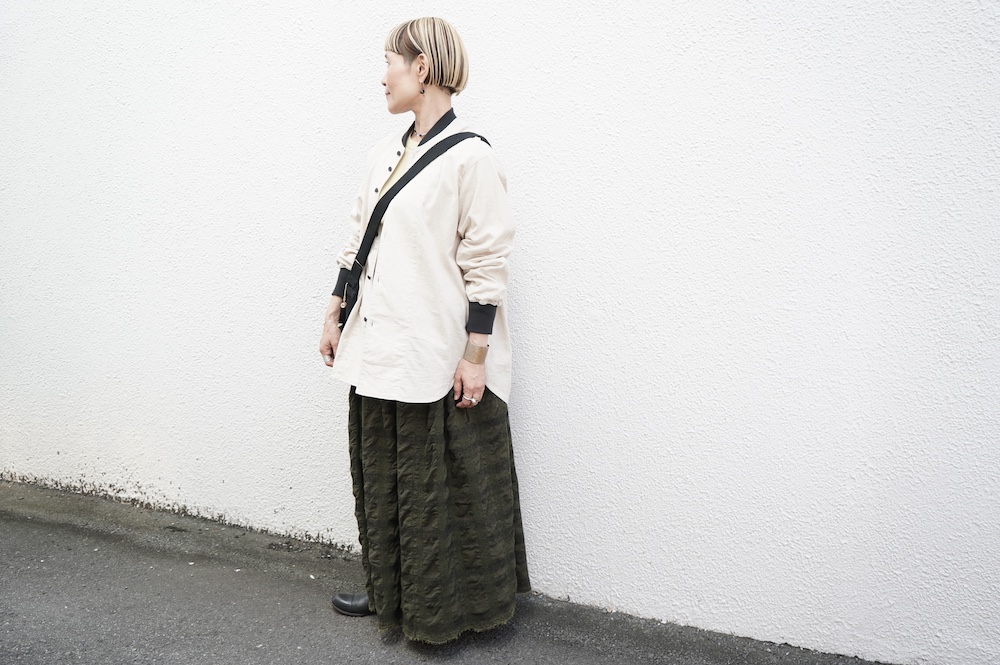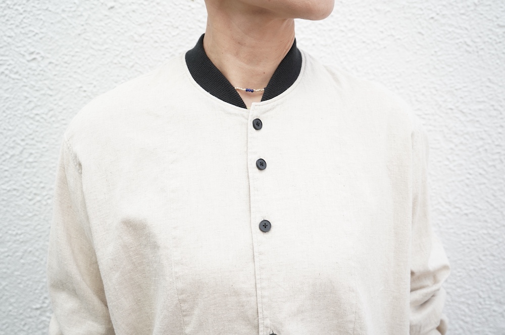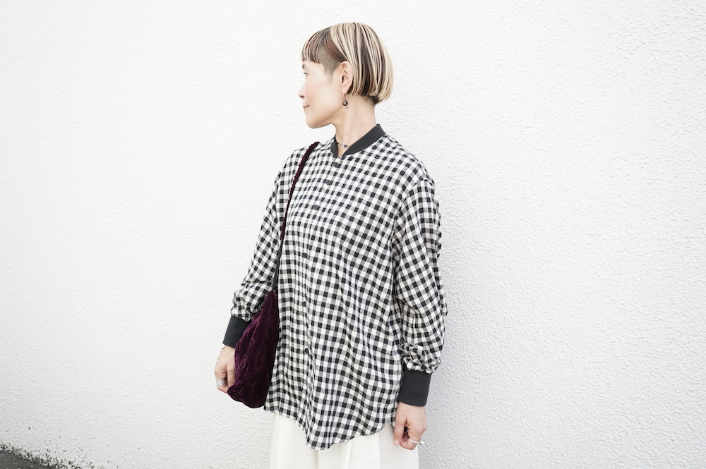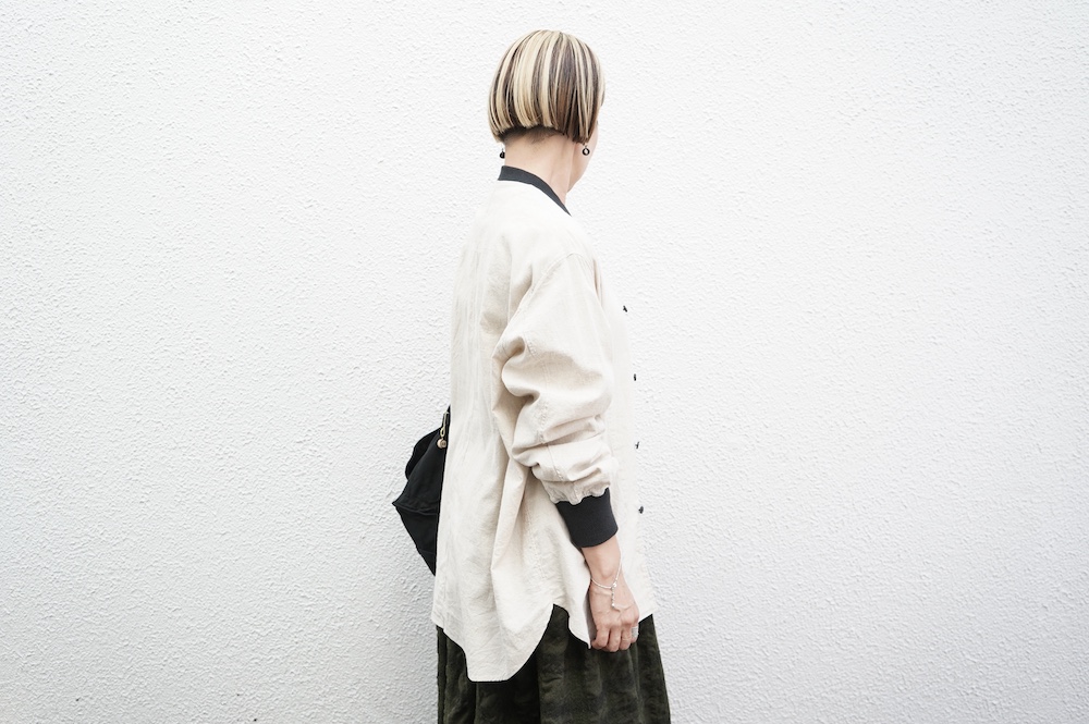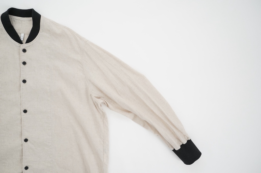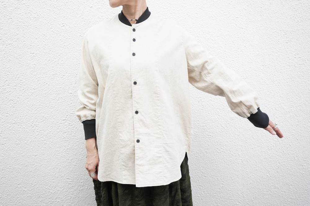 デザインはシンプルなシルエットに襟元と袖口にリブがアクセントになっているリブシャツ。ややドロップショルダー気味でゆとりのあるサイズ感。袖は2枚袖仕立てで動きやすさを高めつつ、立体的で少しカーブのついた見た目にもかっこいい袖付けです。パンツスタイルにはもちろんのこと、着丈はありますがスカートやワンピースにも合わせやすいお洋服です。また羽織にも使いやすく、季節の変わり目に重宝しそうです。ブルゾンとシャツが組み合わさったようなデザインは、タックインをすることでとてもインパクトのあるスタイリングになってきます。ぜひ長い季節で様々なスタイリングをお楽しみください。
