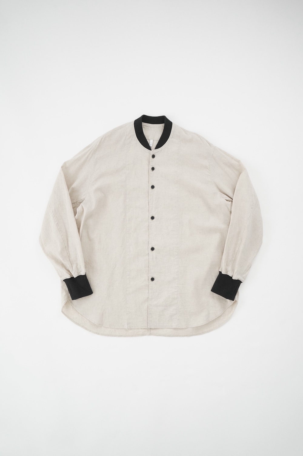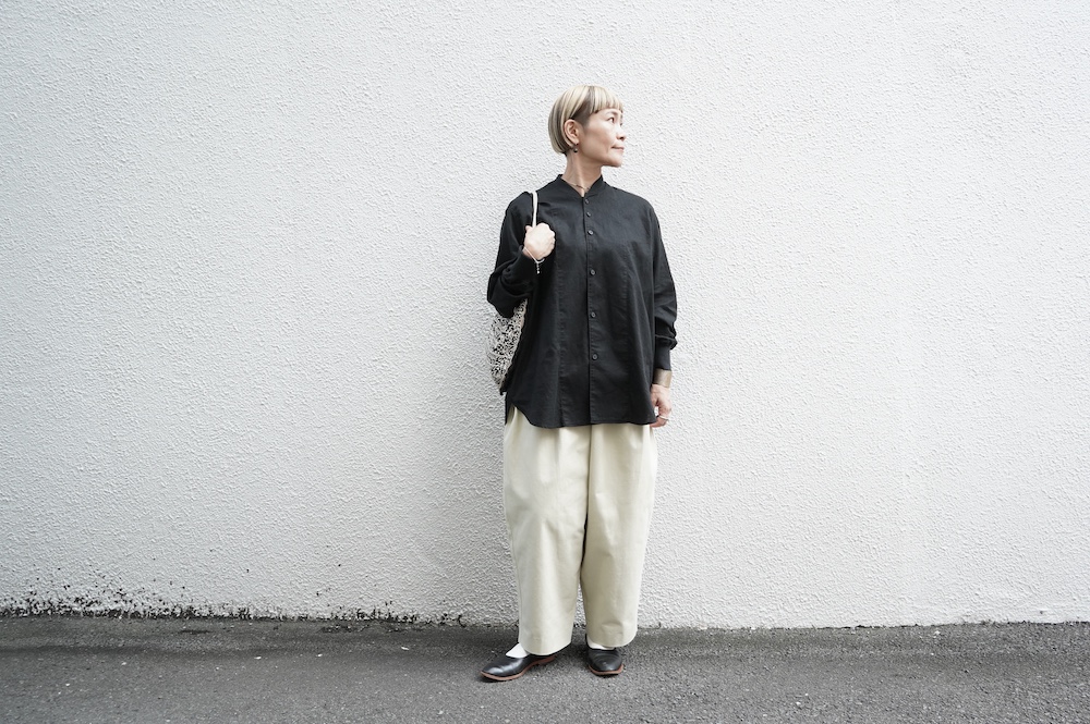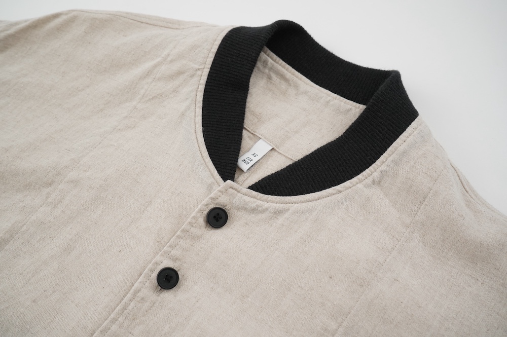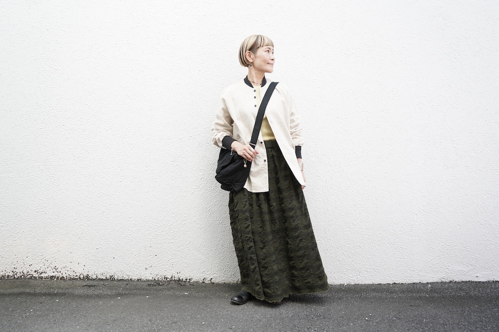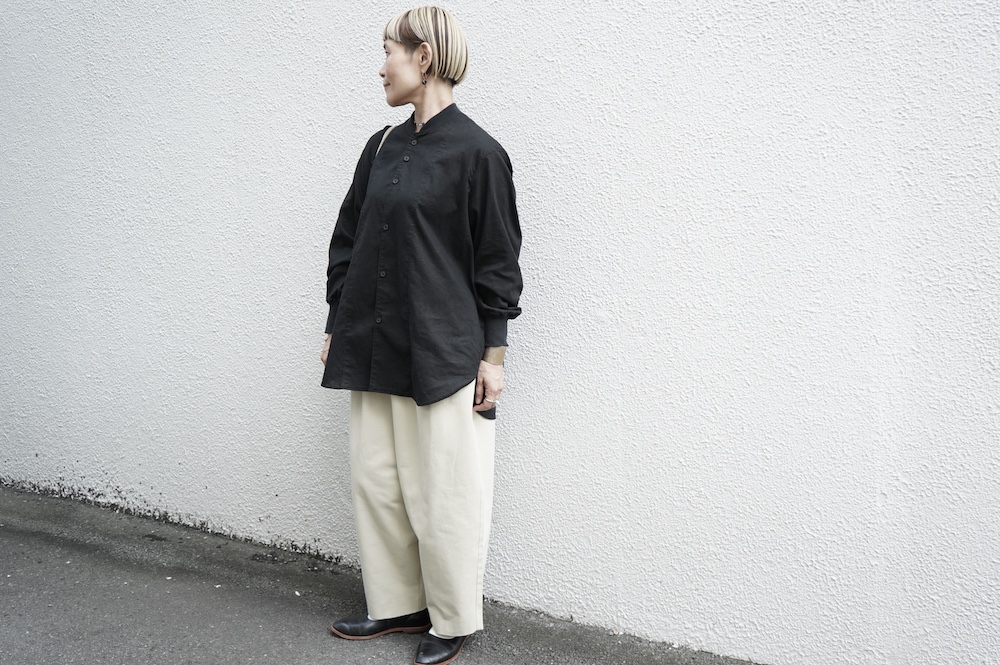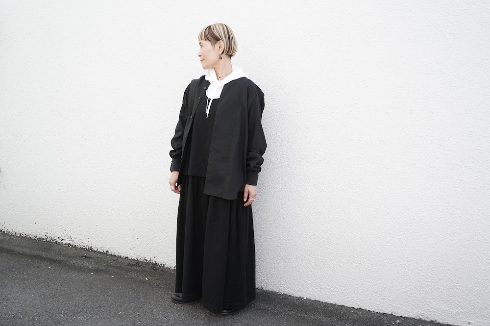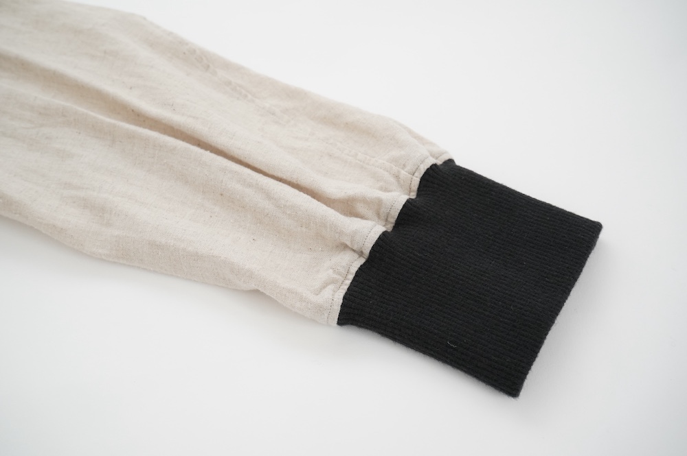 デザインはシンプルなシルエットに襟元と袖口にリブがアクセントになっているリブシャツ。ややドロップショルダー気味でゆとりのあるサイズ感。袖は2枚袖仕立てで動きやすさを高めつつ、立体的で少しカーブのついた見た目にもかっこいい袖付けです。パンツスタイルにはもちろんのこと、着丈はありますがスカートやワンピースにも合わせやすいお洋服です。また羽織にも使いやすく、季節の変わり目に重宝しそうです。ブルゾンとシャツが組み合わさったようなデザインは、タックインをすることでとてもインパクトのあるスタイリングになってきます。ぜひ長い季節で様々なスタイリングをお楽しみください。