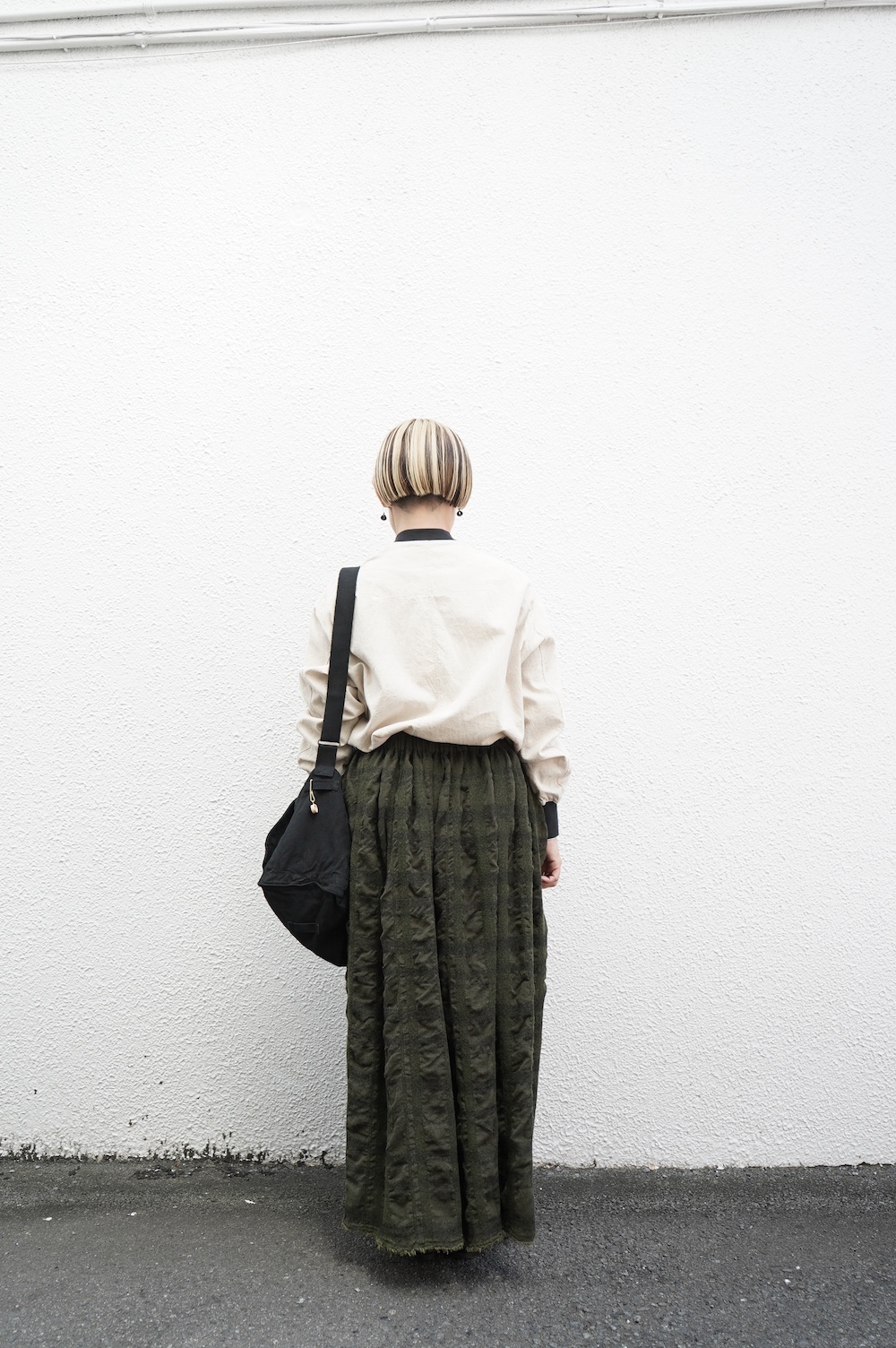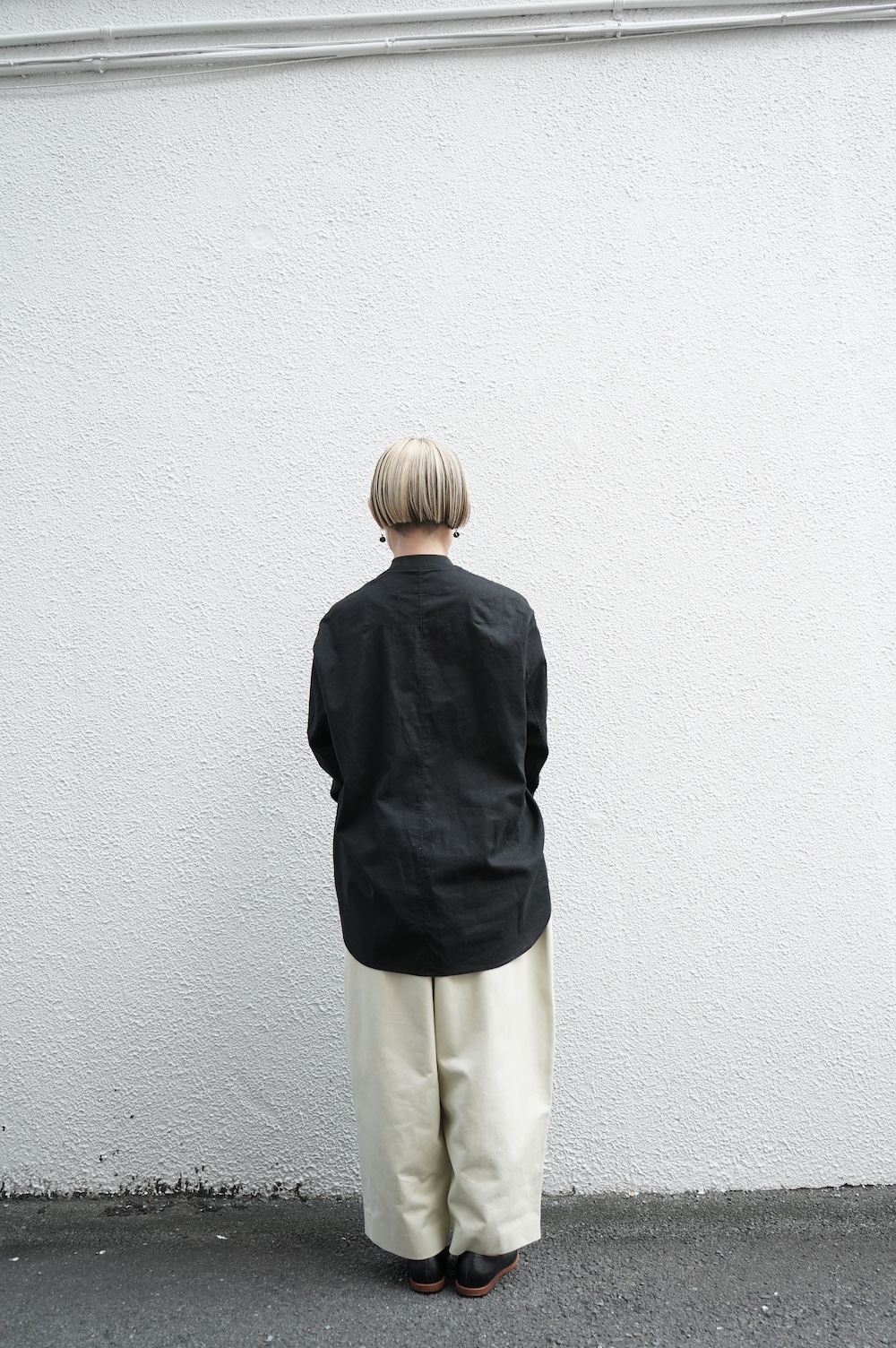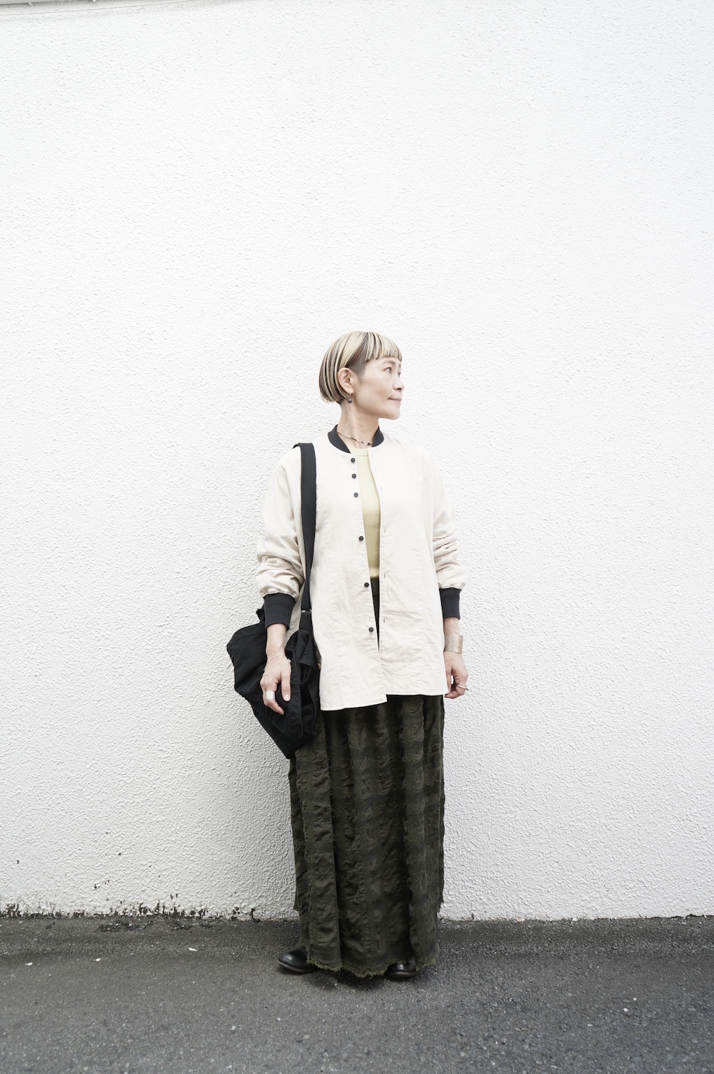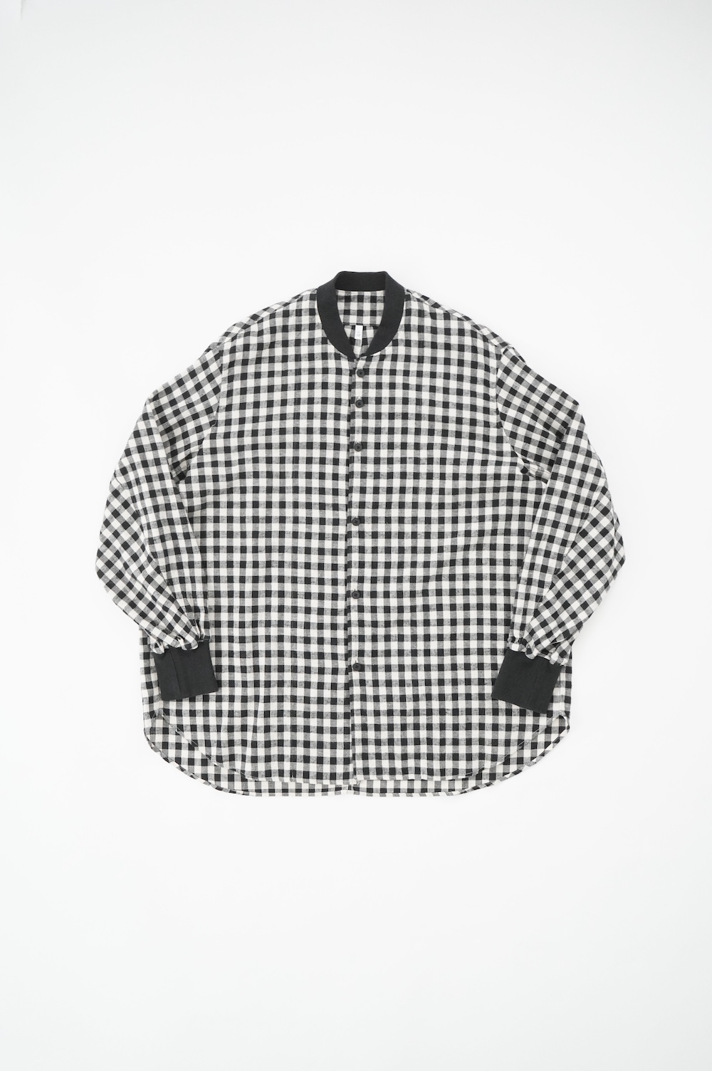 デザインはシンプルなシルエットに襟元と袖口にリブがアクセントになっているリブシャツ。ややドロップショルダー気味でゆとりのあるサイズ感。袖は2枚袖仕立てで動きやすさを高めつつ、立体的で少しカーブのついた見た目にもかっこいい袖付けです。パンツスタイルにはもちろんのこと、着丈はありますがスカートやワンピースにも合わせやすいお洋服です。また羽織にも使いやすく、季節の変わり目に重宝しそうです。ブルゾンとシャツが組み合わさったようなデザインは、タックインをすることでとてもインパクトのあるスタイリングになってきます。ぜひ長い季節で様々なスタイリングをお楽しみください。