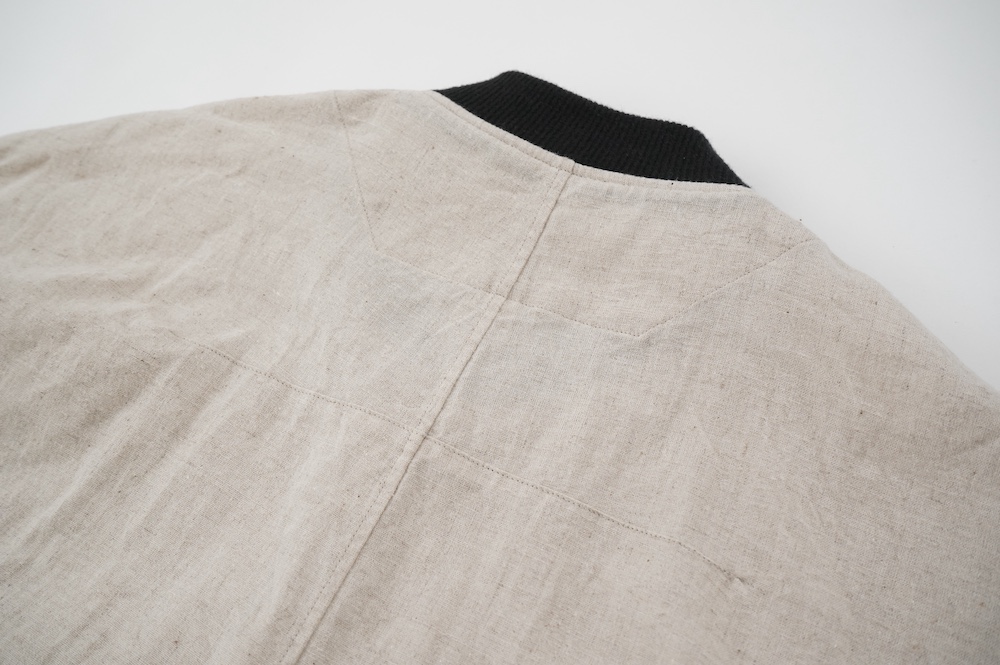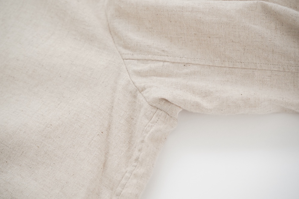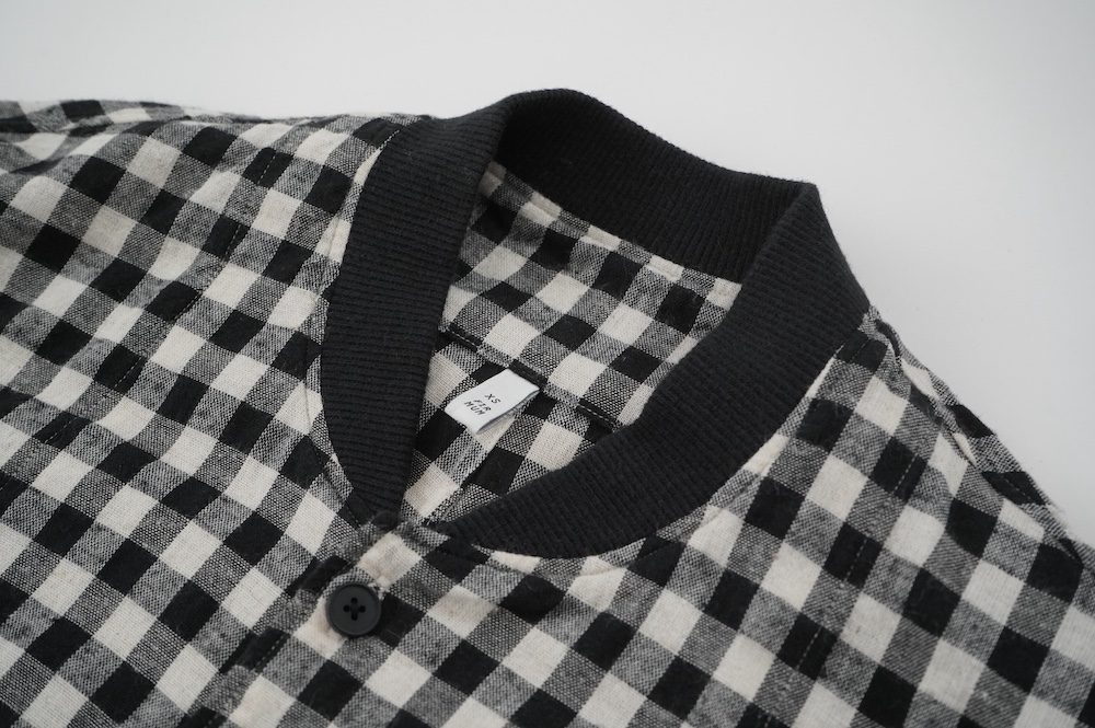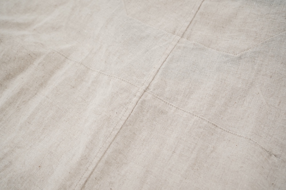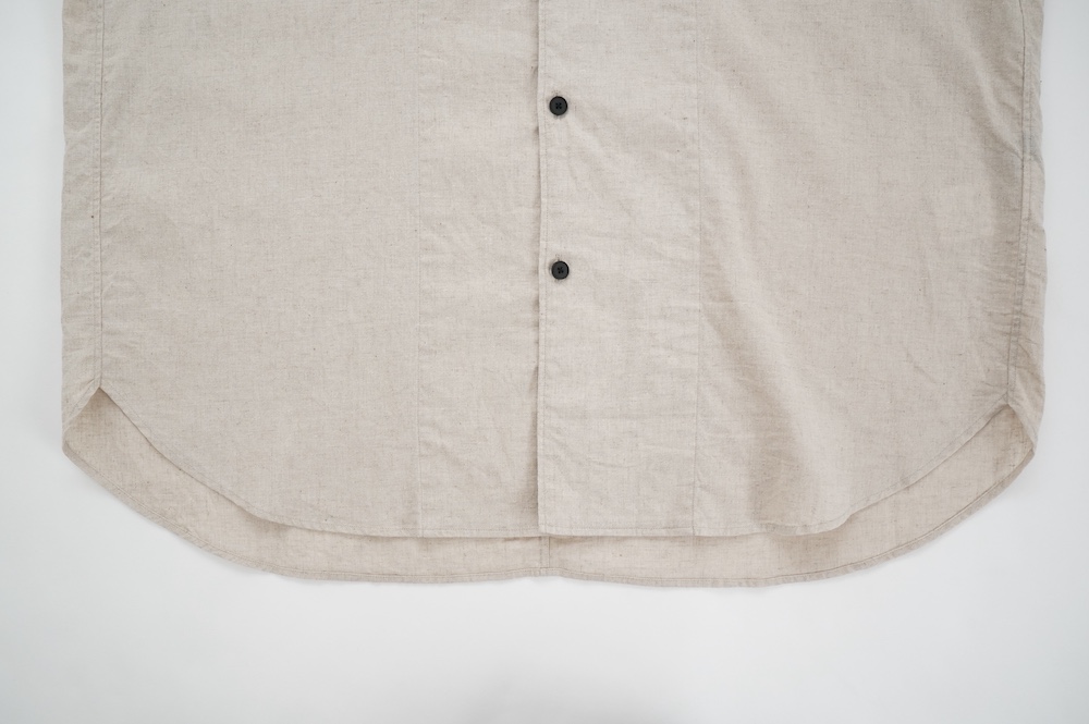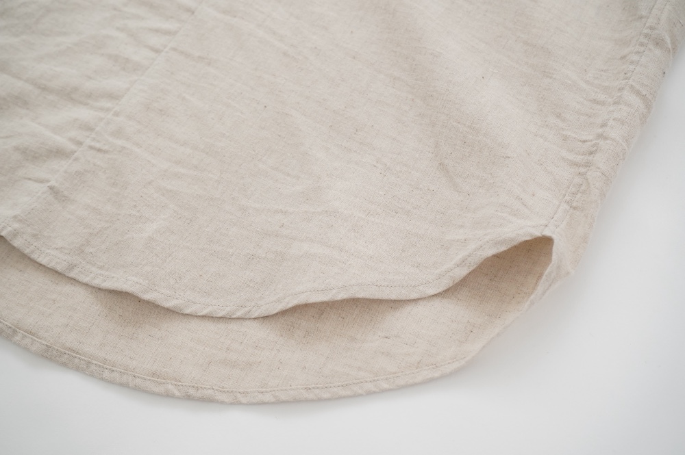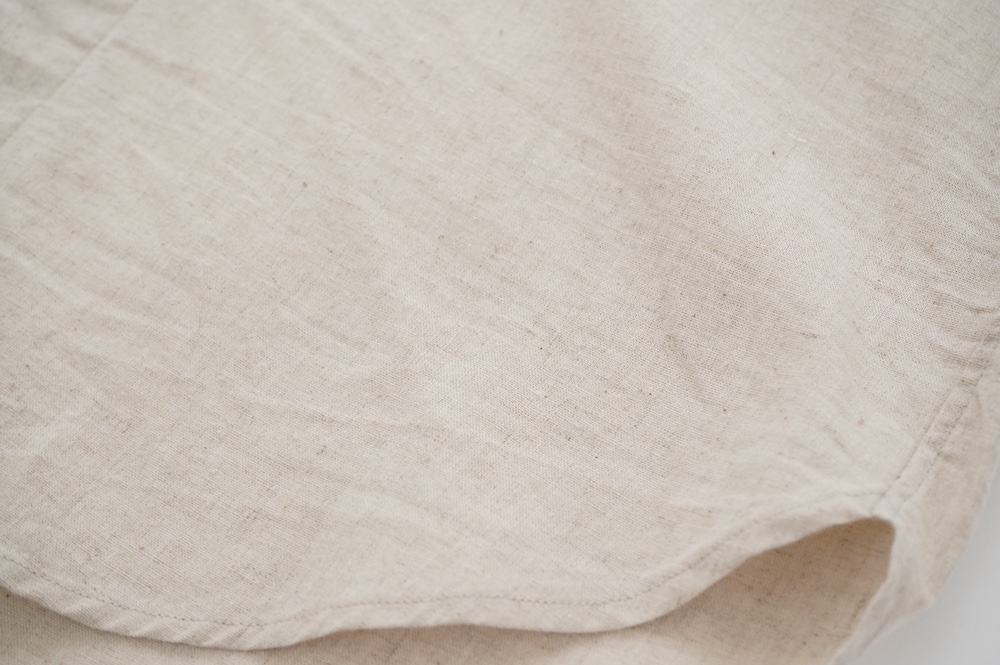 ブロックチェックの生地は経糸に綿のカード糸、緯糸に綿麻混紡糸を使用した平織りシーチングの生地です。無地の生地は経糸、緯糸、ともに綿麻混紡糸を使用した平織りシーチングの生地です。綿の割合が多い分、ブロックチェックの生地の方がややしなやかな手触りです。どちらも生地の段階で起毛加工を施し縫製後に洗いをかけてタンブラーで仕上げています。ざっくりと織られているのでリラックスした着心地です。厚みは少ししっかりめのシャツ生地といった具合です。