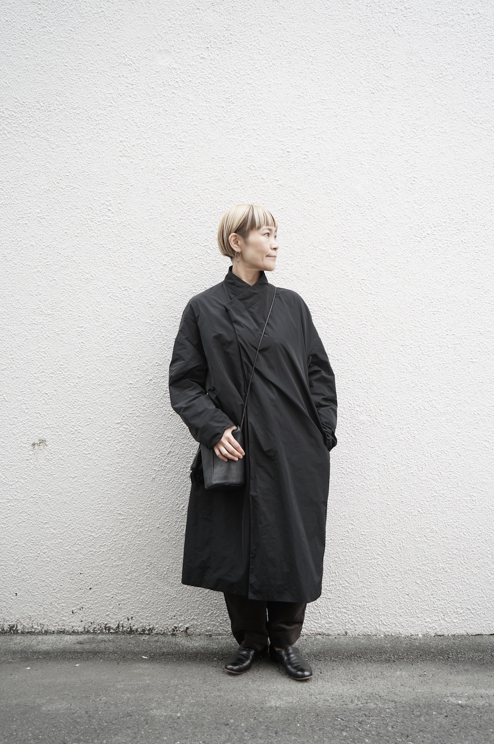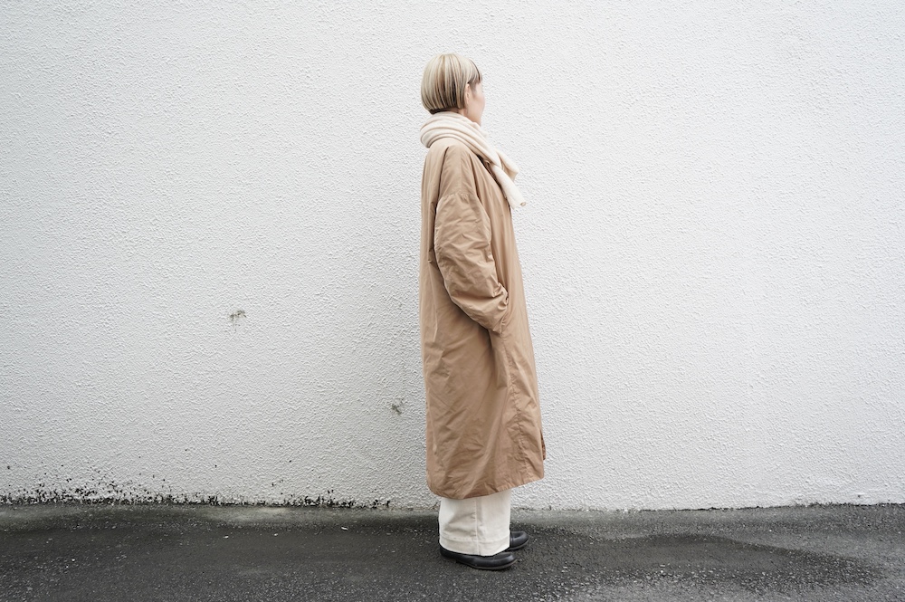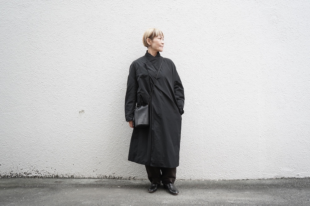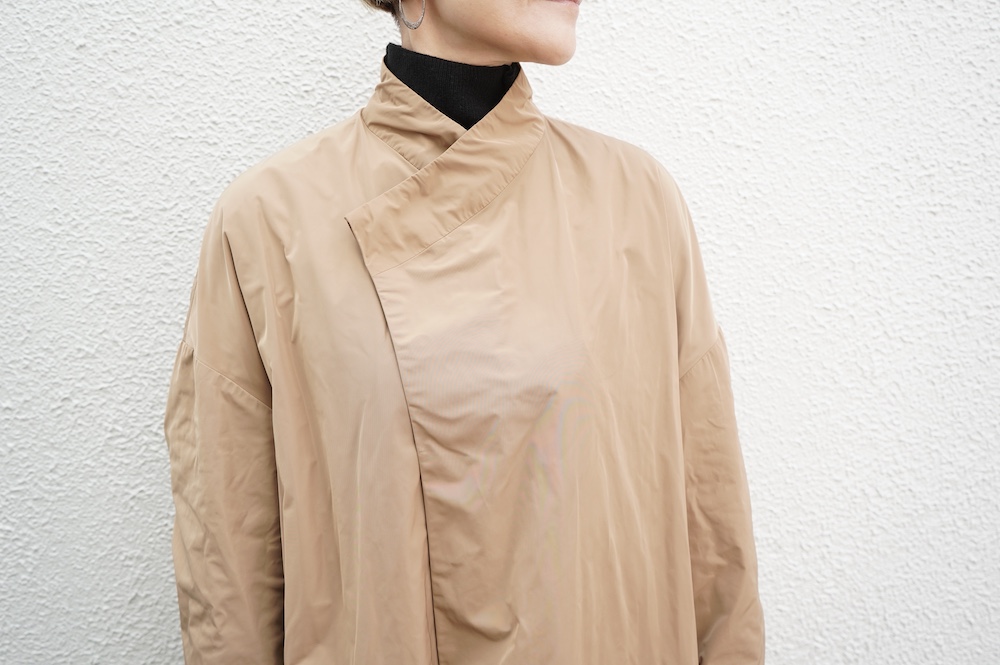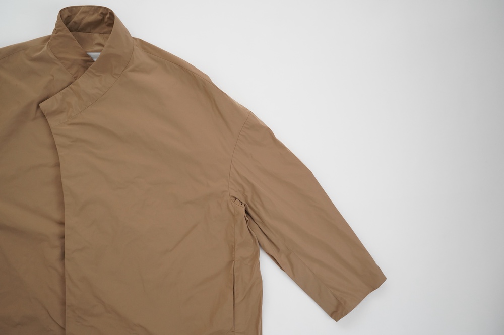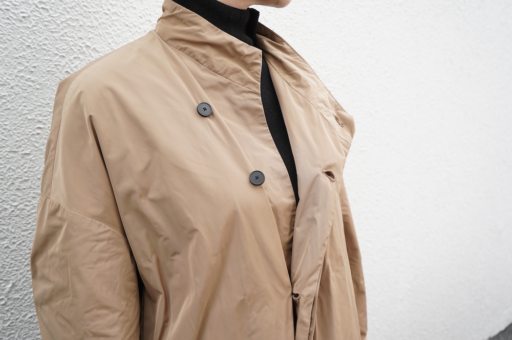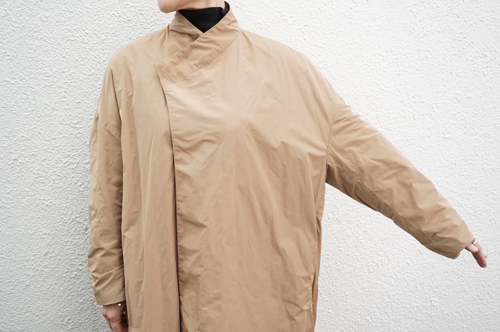 デザインは、襟元が特徴的なキモノカラーのコート。スタンドカラーのように首の後ろは少し高さがあり、フロント側は着物のように左右が重なる合わせになっています。ボタンは比翼仕立て。内側には左のみ胸ポケットと、脇にシームポケットと洗練されたシンプルなデザインです。オーバーサイズなのでゆったりとしており、ローゲージのニットやジャケットの上にも羽織ることが出来ます。中綿やダウン、ウールコートのような暖かさは備わっていませんが、風を通さないので中に着るアイテムで調整することで寒い時期にも着用可能です。また、春や秋の始まりなど季節の変り目にも使い勝手の良いコートです。