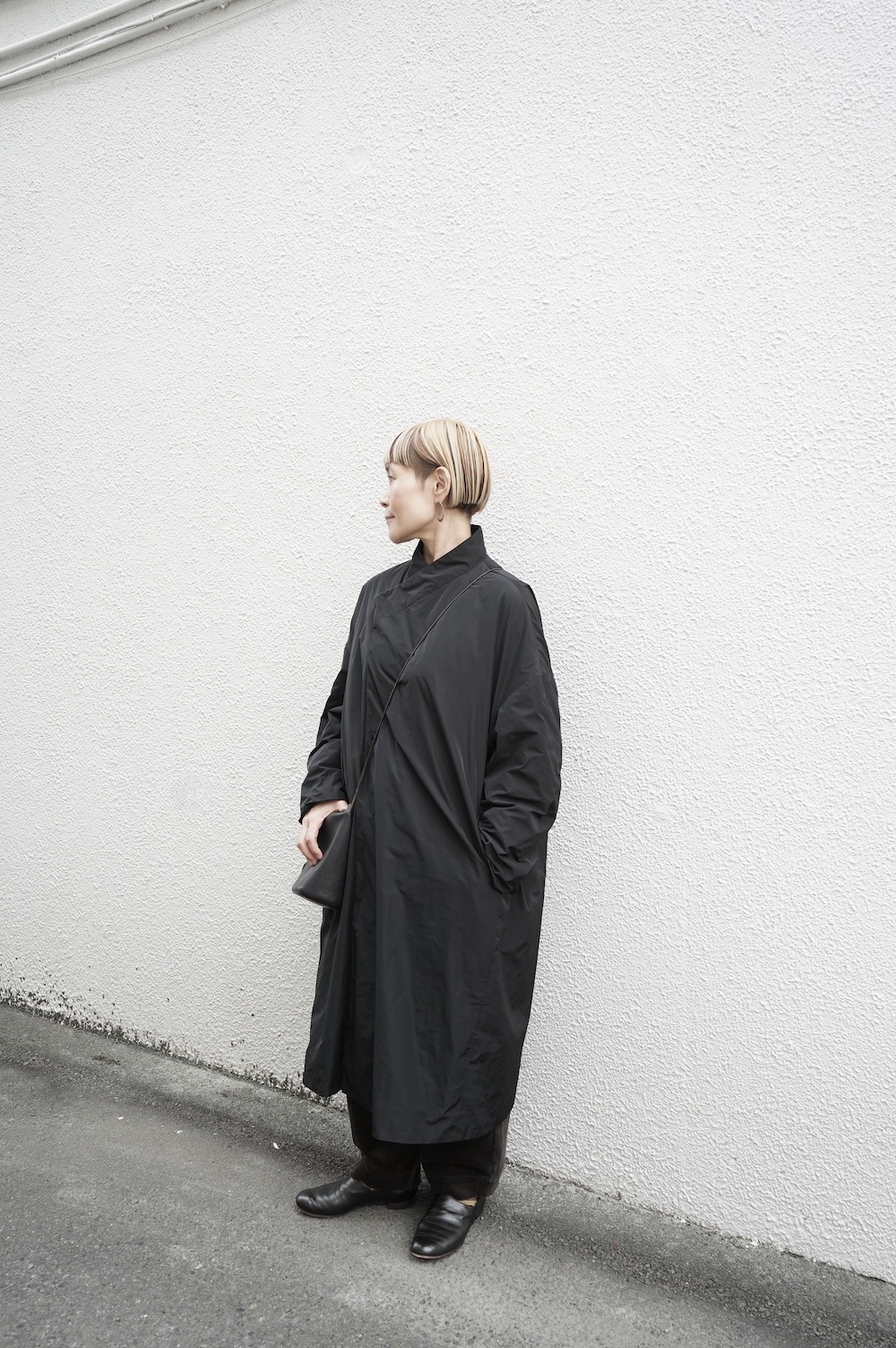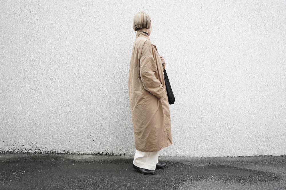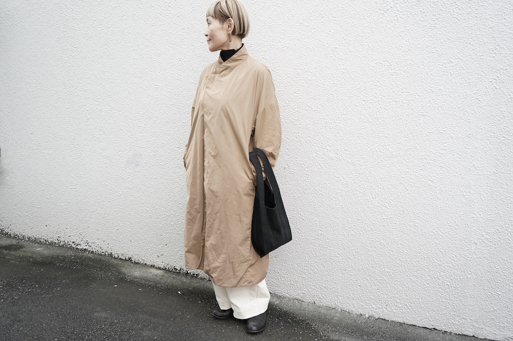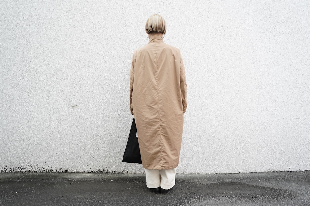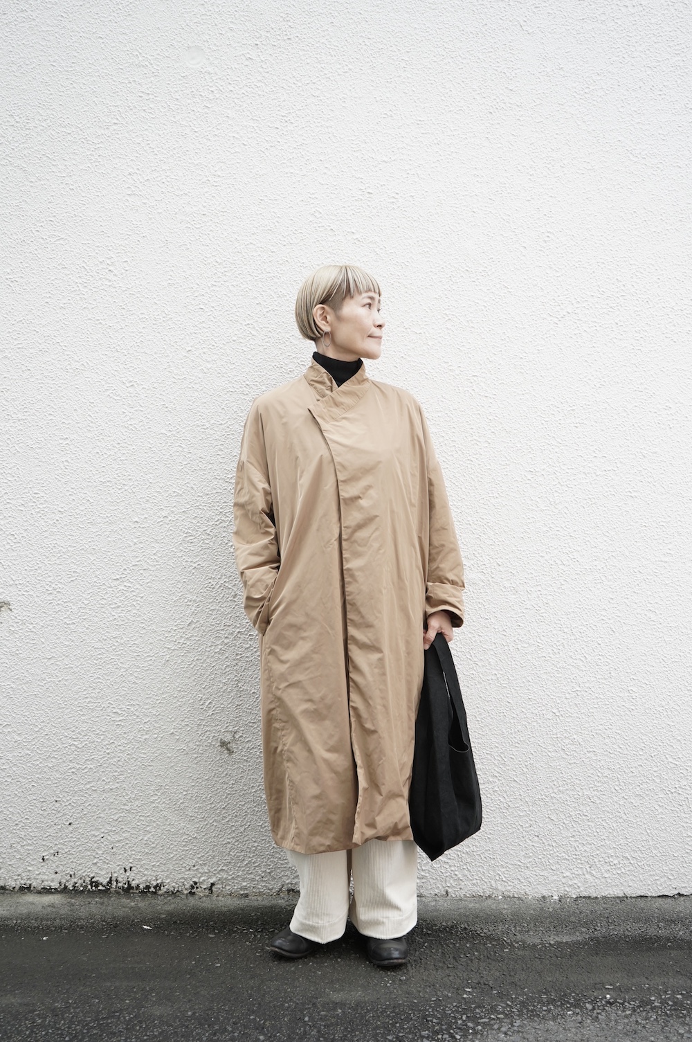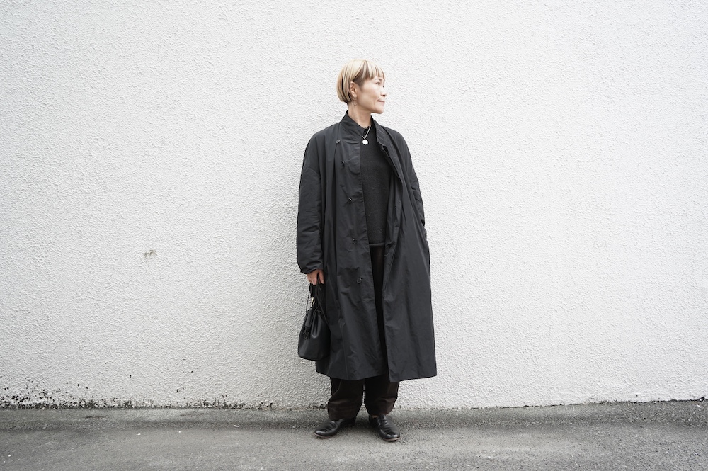 デザインは、襟元が特徴的なキモノカラーのコート。スタンドカラーのように首の後ろは少し高さがあり、フロント側は着物のように左右が重なる合わせになっています。ボタンは比翼仕立て。内側には左のみ胸ポケットと、脇にシームポケットと洗練されたシンプルなデザインです。オーバーサイズなのでゆったりとしており、ローゲージのニットやジャケットの上にも羽織ることが出来ます。中綿やダウン、ウールコートのような暖かさは備わっていませんが、風を通さないので中に着るアイテムで調整することで寒い時期にも着用可能です。また、春や秋の始まりなど季節の変り目にも使い勝手の良いコートです。