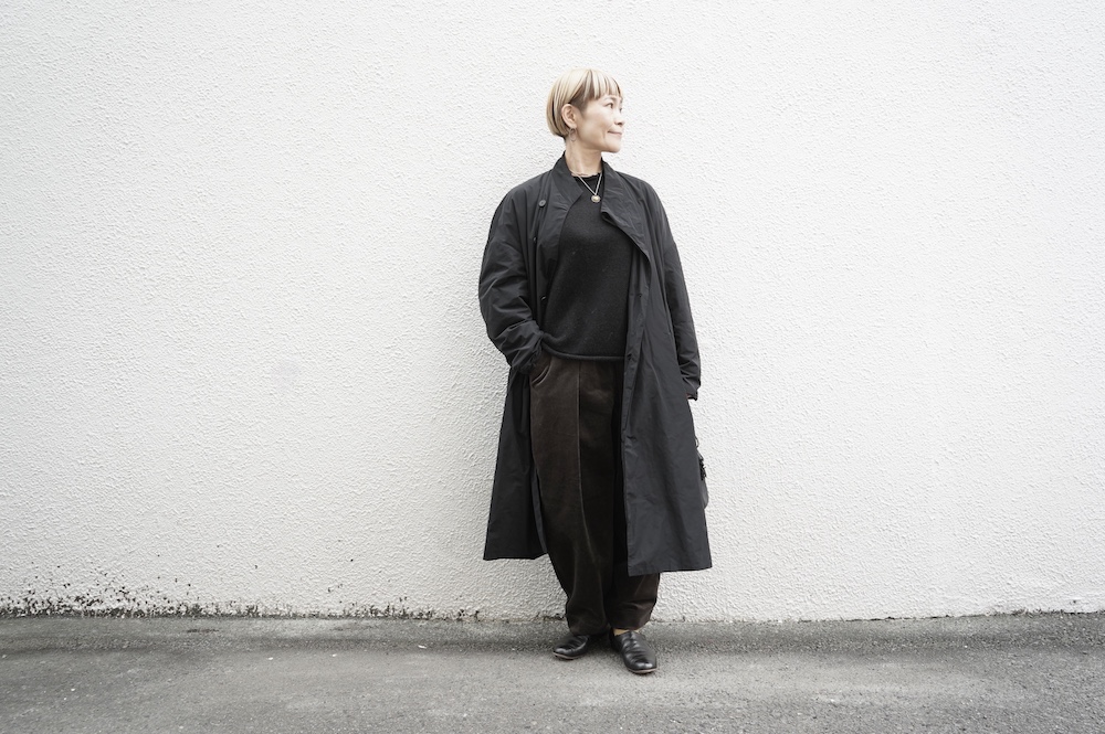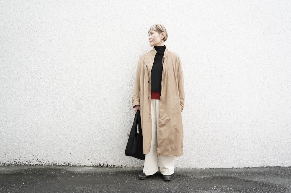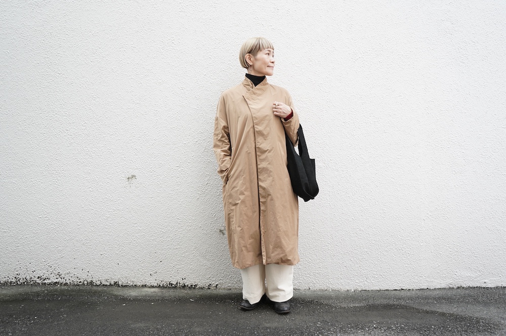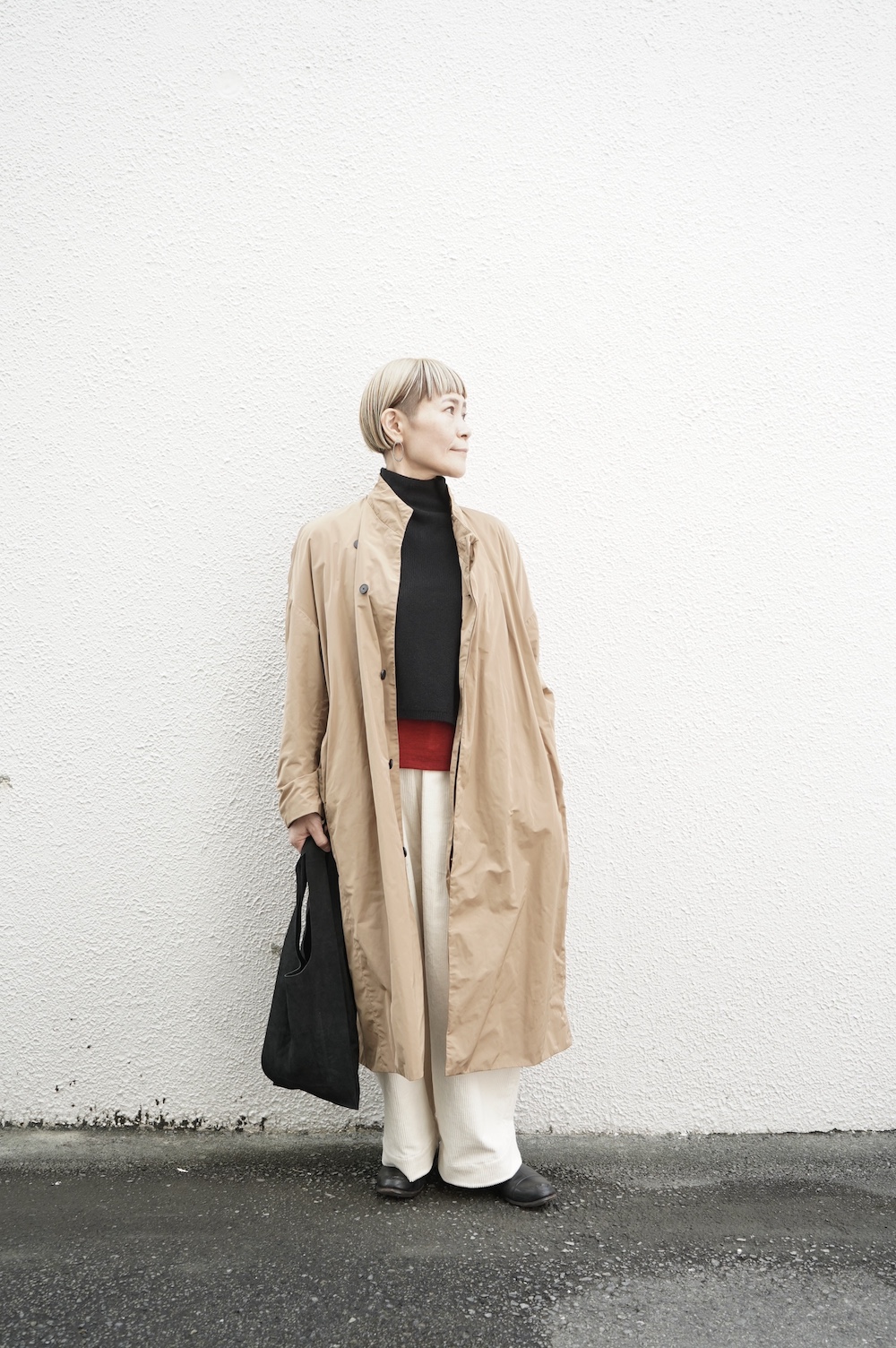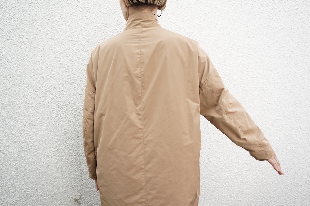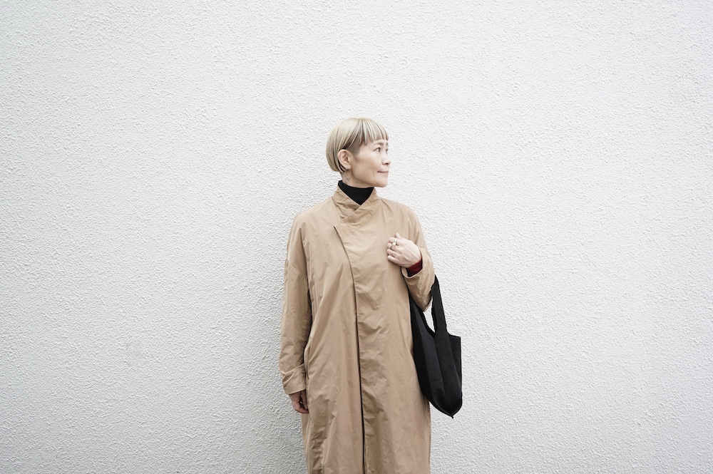 デザインは、襟元が特徴的なキモノカラーのコート。スタンドカラーのように首の後ろは少し高さがあり、フロント側は着物のように左右が重なる合わせになっています。ボタンは比翼仕立て。内側には左のみ胸ポケットと、脇にシームポケットと洗練されたシンプルなデザインです。オーバーサイズなのでゆったりとしており、ローゲージのニットやジャケットの上にも羽織ることが出来ます。中綿やダウン、ウールコートのような暖かさは備わっていませんが、風を通さないので中に着るアイテムで調整することで寒い時期にも着用可能です。また、春や秋の始まりなど季節の変り目にも使い勝手の良いコートです。