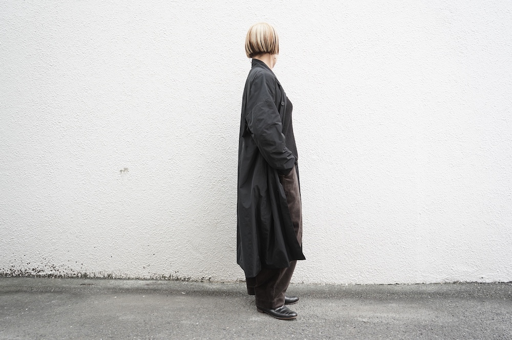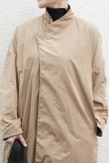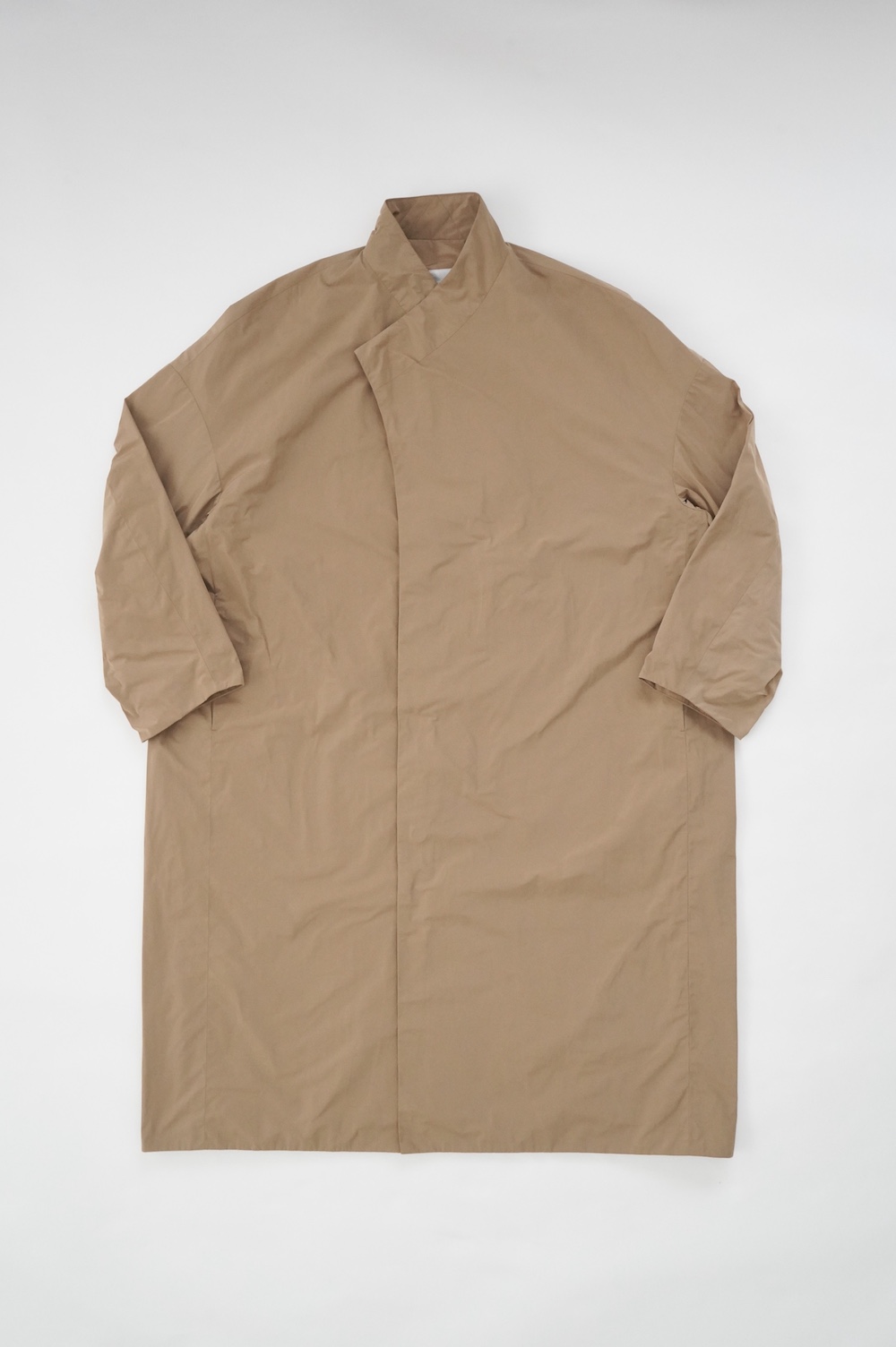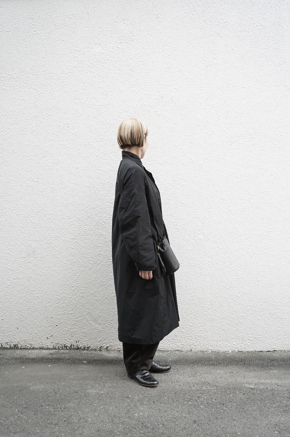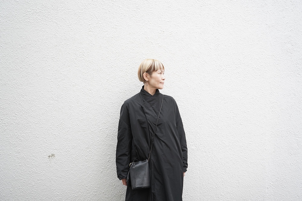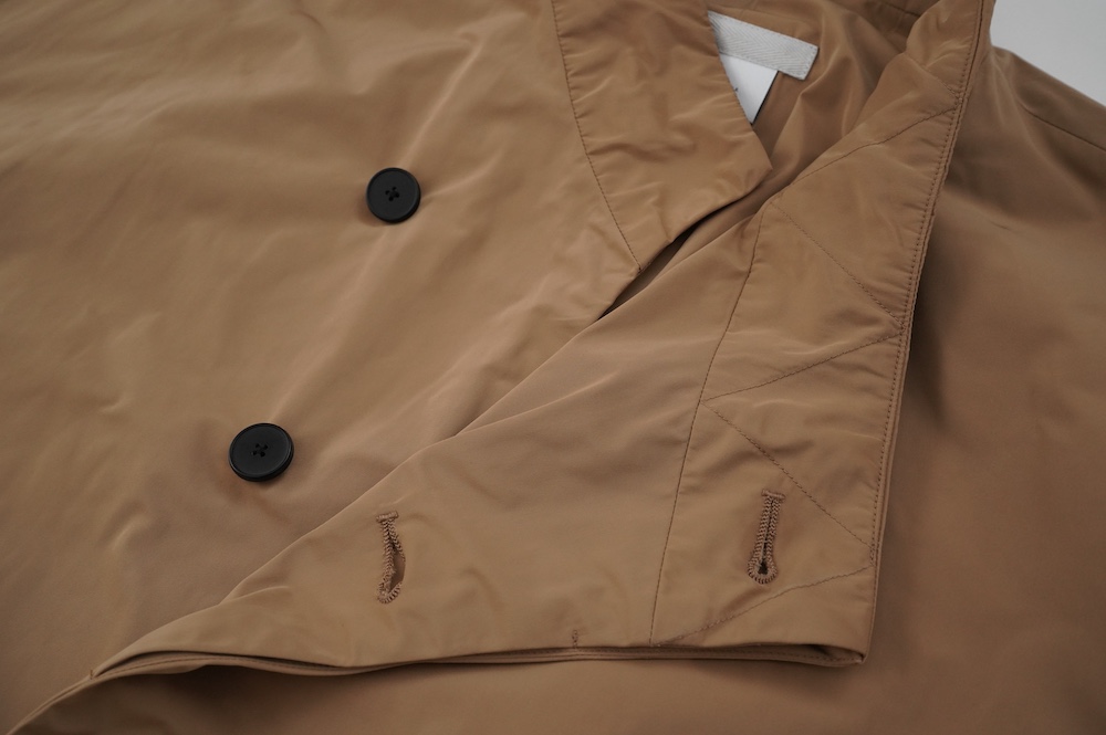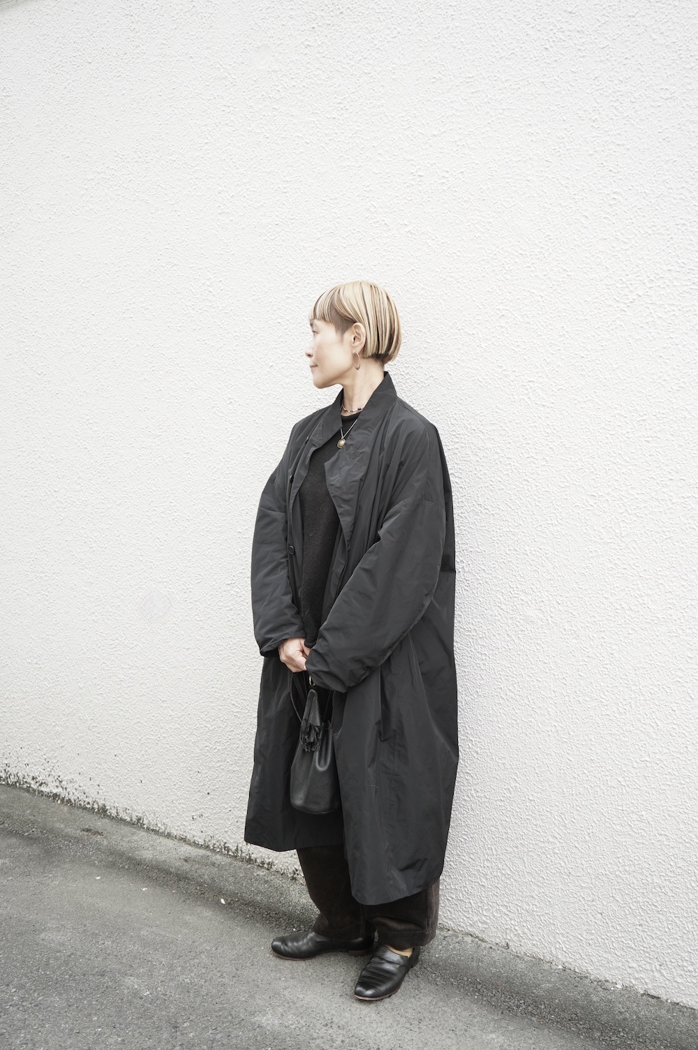 デザインは、襟元が特徴的なキモノカラーのコート。スタンドカラーのように首の後ろは少し高さがあり、フロント側は着物のように左右が重なる合わせになっています。ボタンは比翼仕立て。内側には左のみ胸ポケットと、脇にシームポケットと洗練されたシンプルなデザインです。オーバーサイズなのでゆったりとしており、ローゲージのニットやジャケットの上にも羽織ることが出来ます。中綿やダウン、ウールコートのような暖かさは備わっていませんが、風を通さないので中に着るアイテムで調整することで寒い時期にも着用可能です。また、春や秋の始まりなど季節の変り目にも使い勝手の良いコートです。