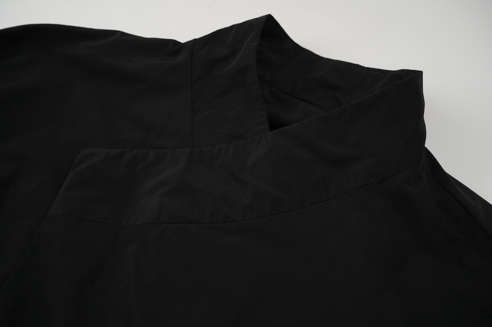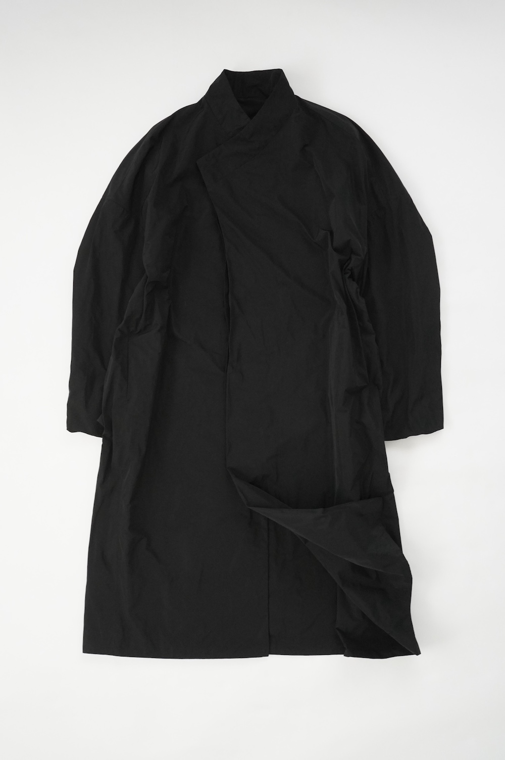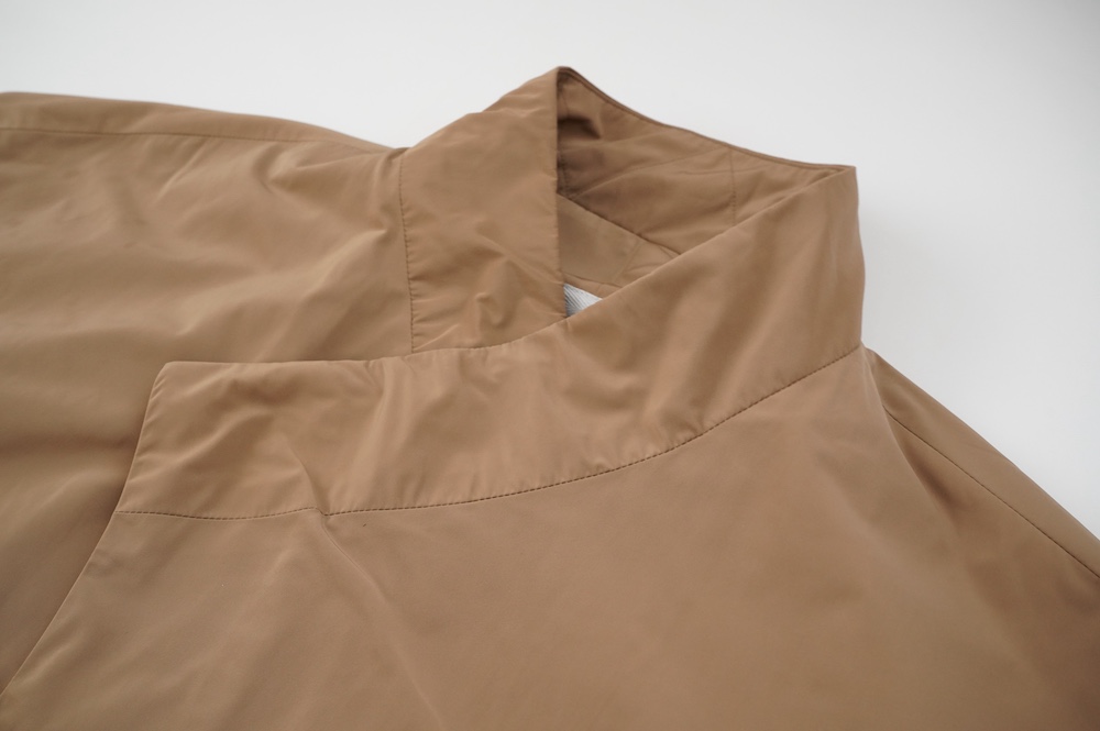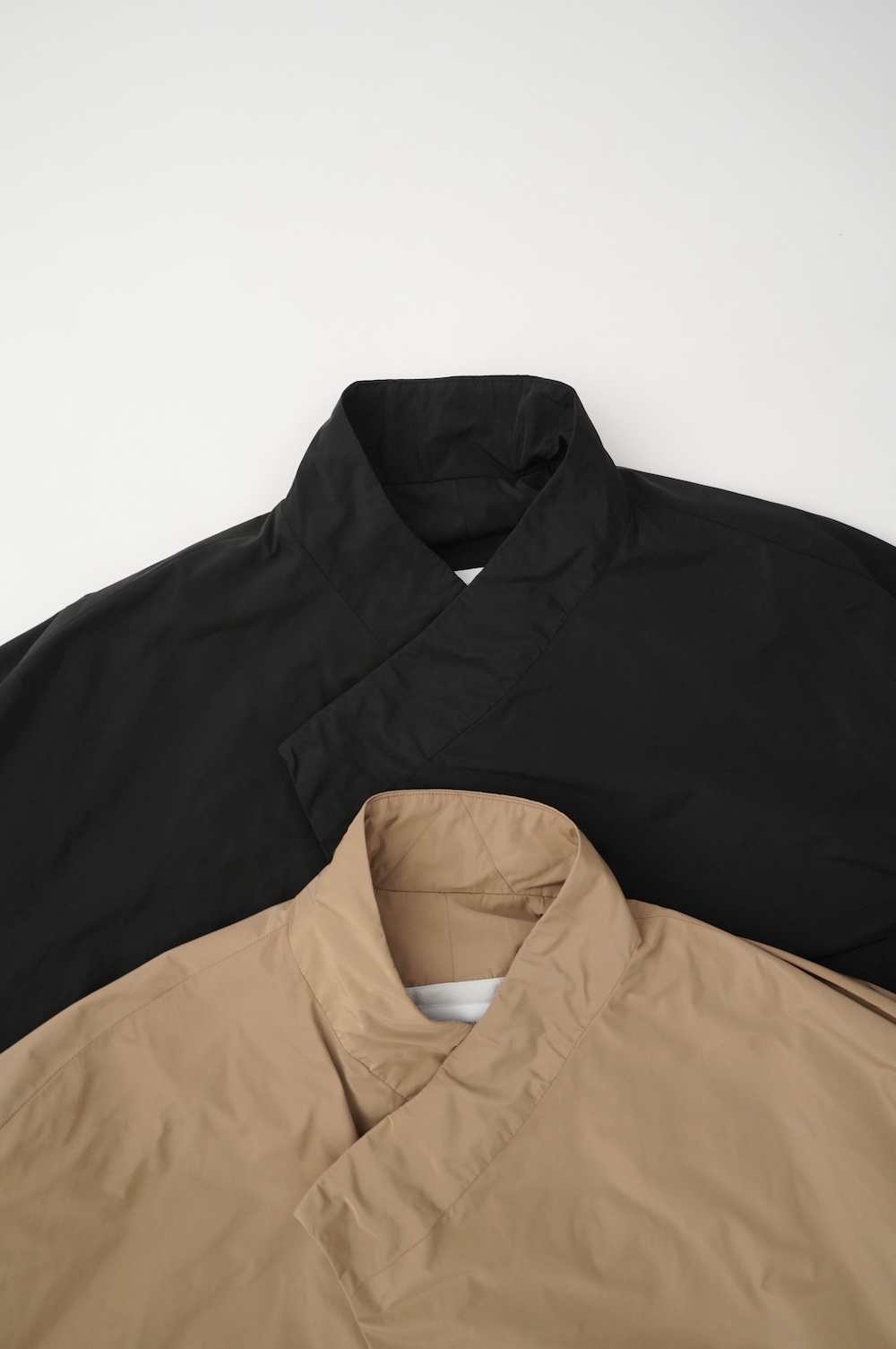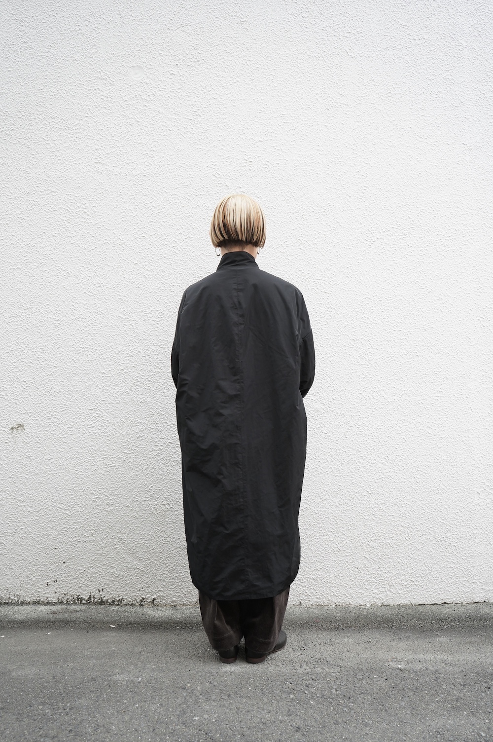 デザインは、襟元が特徴的なキモノカラーのコート。スタンドカラーのように首の後ろは少し高さがあり、フロント側は着物のように左右が重なる合わせになっています。ボタンは比翼仕立て。内側には左のみ胸ポケットと、脇にシームポケットと洗練されたシンプルなデザインです。オーバーサイズなのでゆったりとしており、ローゲージのニットやジャケットの上にも羽織ることが出来ます。中綿やダウン、ウールコートのような暖かさは備わっていませんが、風を通さないので中に着るアイテムで調整することで寒い時期にも着用可能です。また、春や秋の始まりなど季節の変り目にも使い勝手の良いコートです。