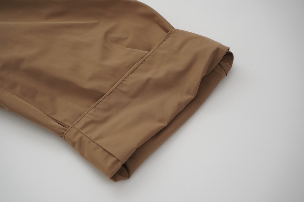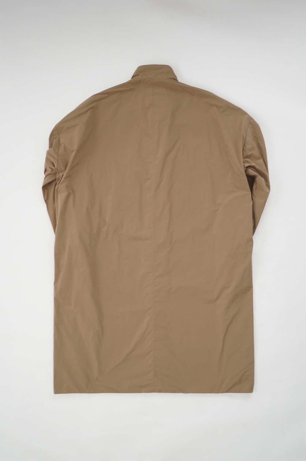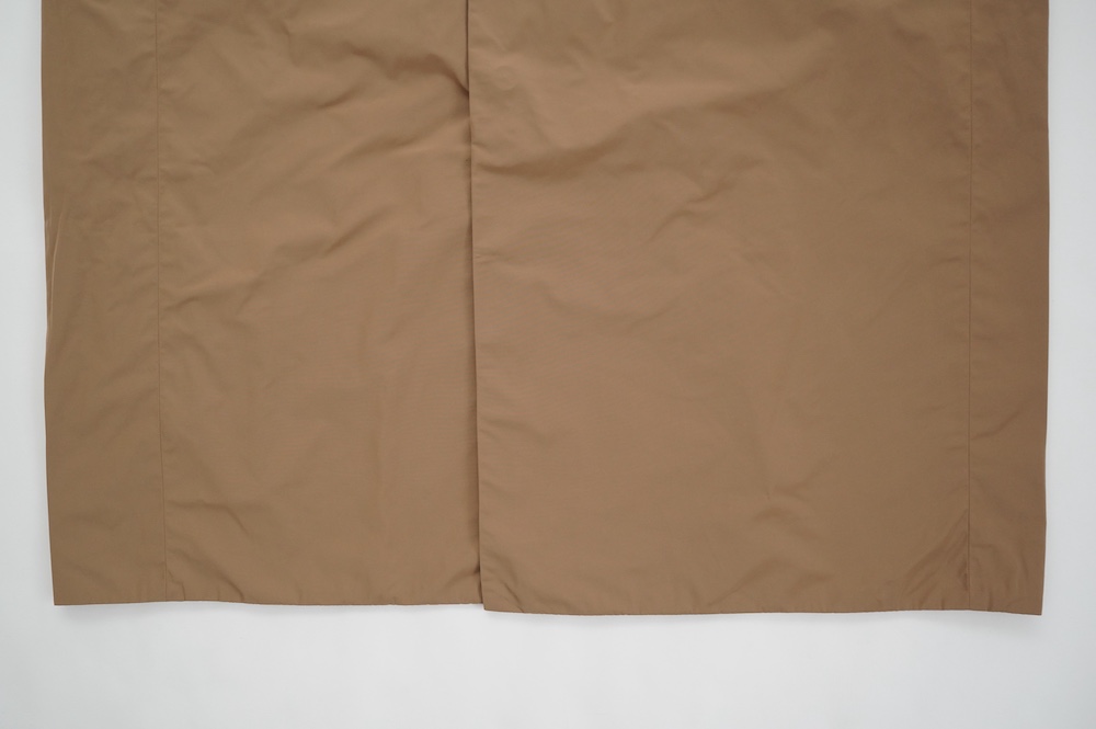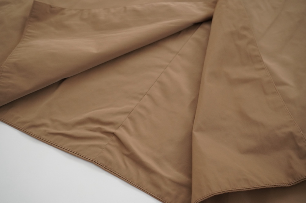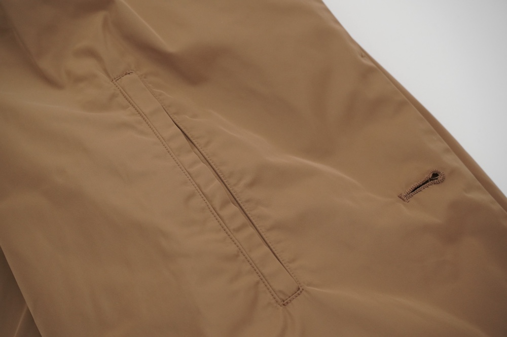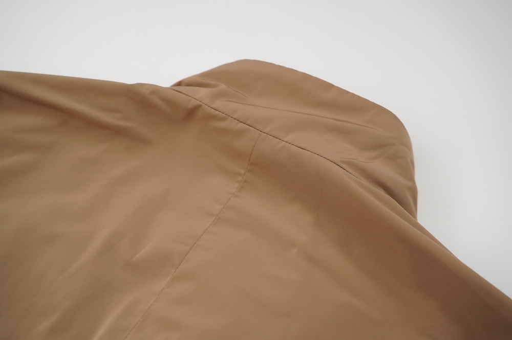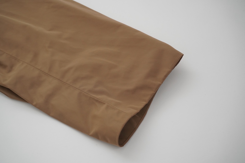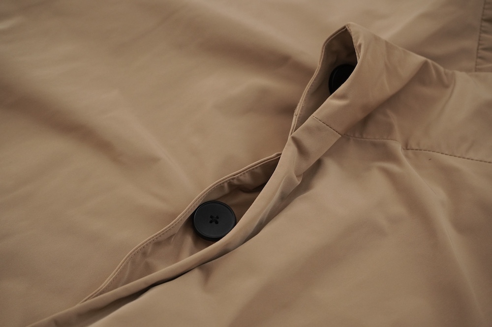 "ノーコントロールエアー"のコート。特殊糸である形状記憶ポリエステル糸を使用した、高密度平織りのウェザークロスを使用。速乾性もあり、扱いのしやすい素材です。表生地と同じ素材を裏地にも使用しており、無双仕立てになっています。