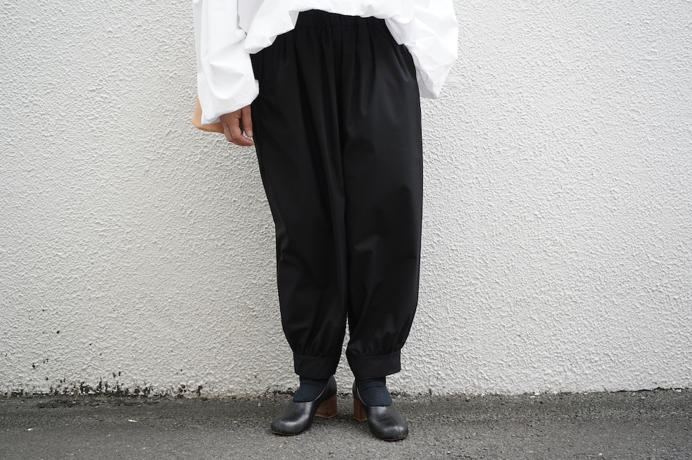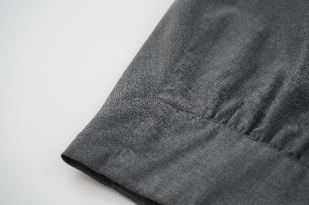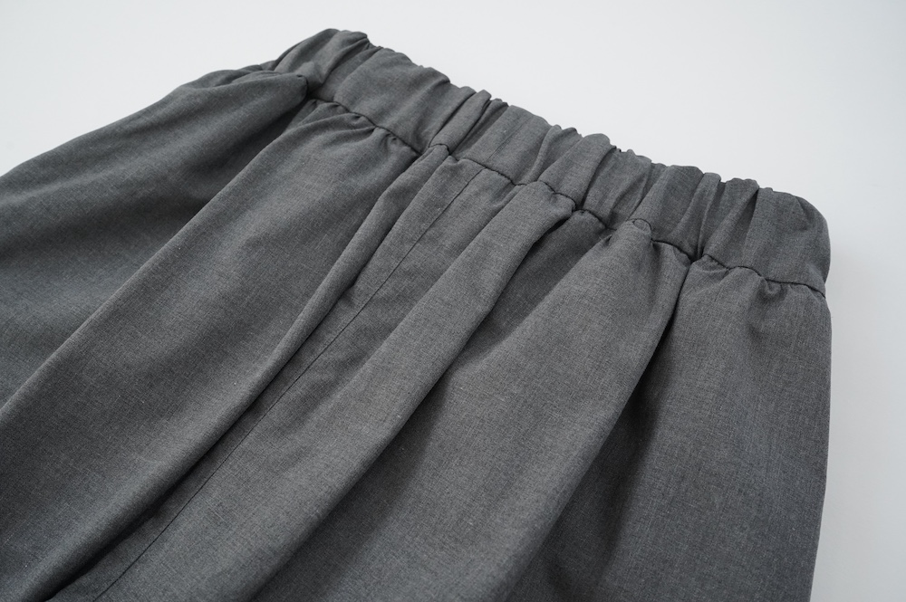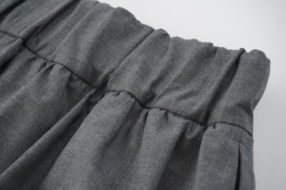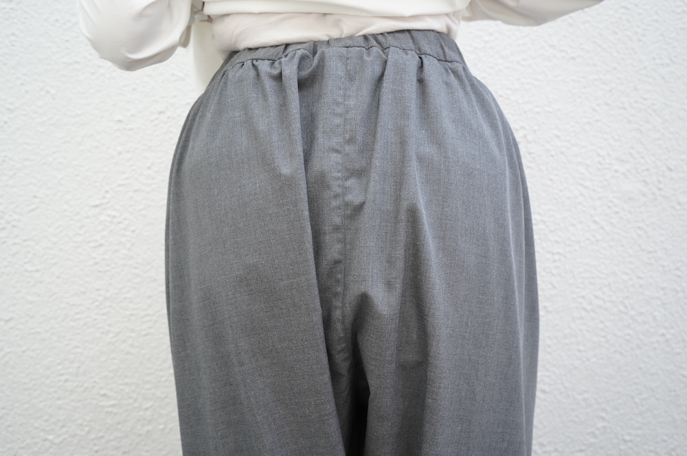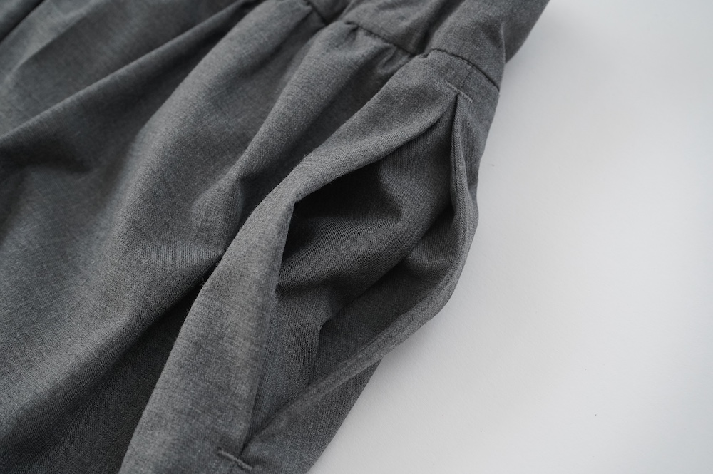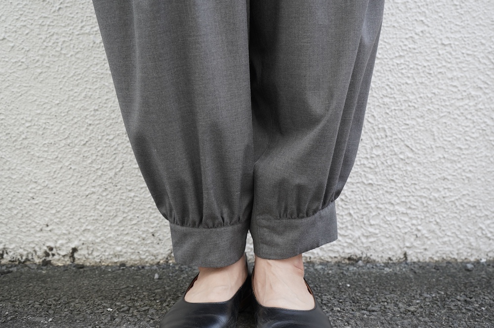 デザインは裾リブパンツのように、裾にギャザーが施された新型アラジンパンツ。脇に縫い合わせは無く、ウエスト〜ヒップの脇でダーツをとり体に沿うシルエットを作り出しています。脇ダーツを利用して、ダーツ部分に前後どちらにも袋布があるポケットが付いています。裾のギャザーは、内側(足の股側)部分はギャザーが入っていないのと、別布に見える裾部分は実は一枚の生地で繋がっているという緻密なパターンにも唆られます。膨らみすぎず綺麗なシルエットを楽しめるギャザーパンツです。