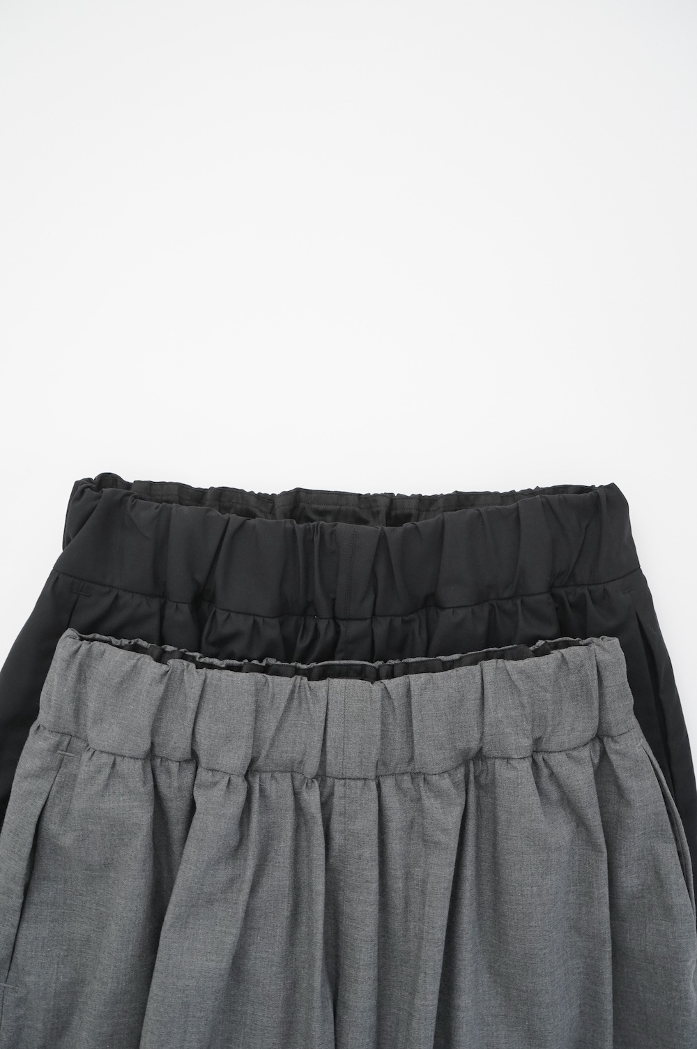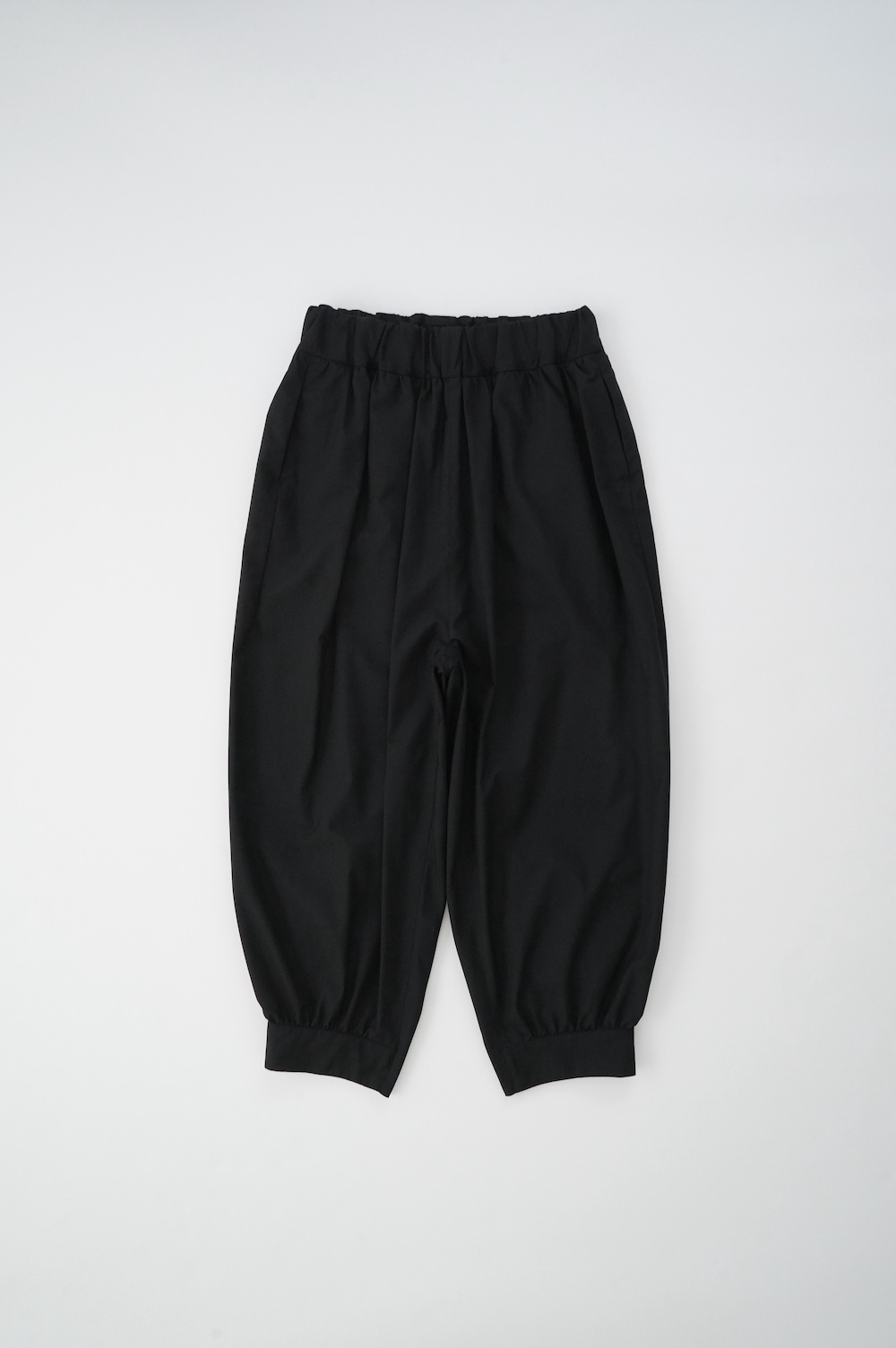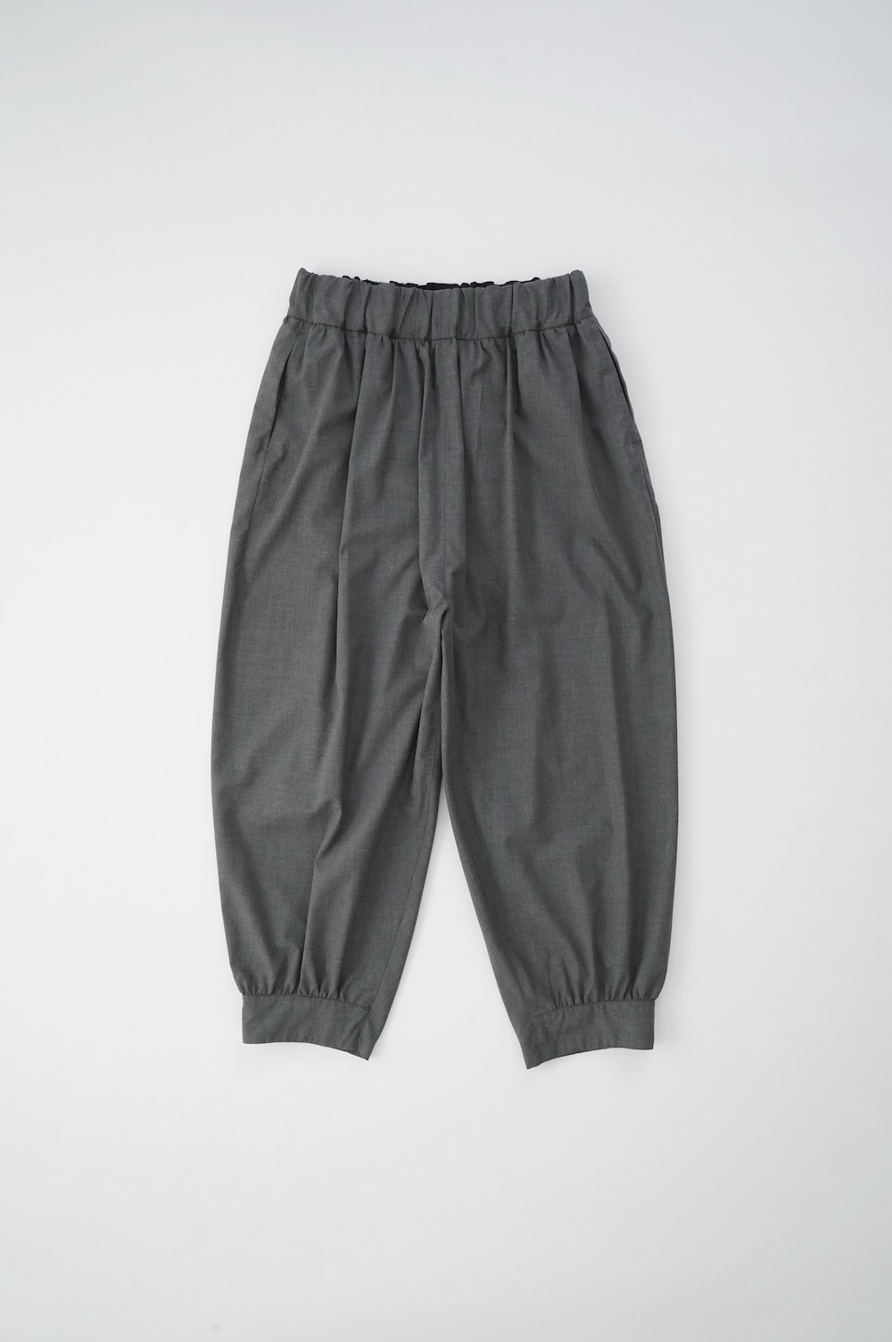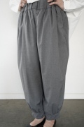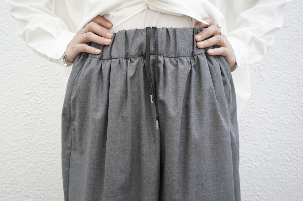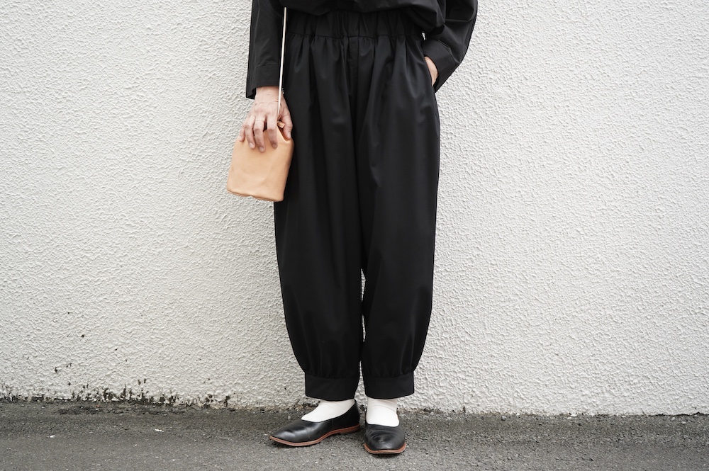 デザインは裾リブパンツのように、裾にギャザーが施された新型アラジンパンツ。脇に縫い合わせは無く、ウエスト〜ヒップの脇でダーツをとり体に沿うシルエットを作り出しています。脇ダーツを利用して、ダーツ部分に前後どちらにも袋布があるポケットが付いています。裾のギャザーは、内側(足の股側)部分はギャザーが入っていないのと、別布に見える裾部分は実は一枚の生地で繋がっているという緻密なパターンにも唆られます。膨らみすぎず綺麗なシルエットを楽しめるギャザーパンツです。