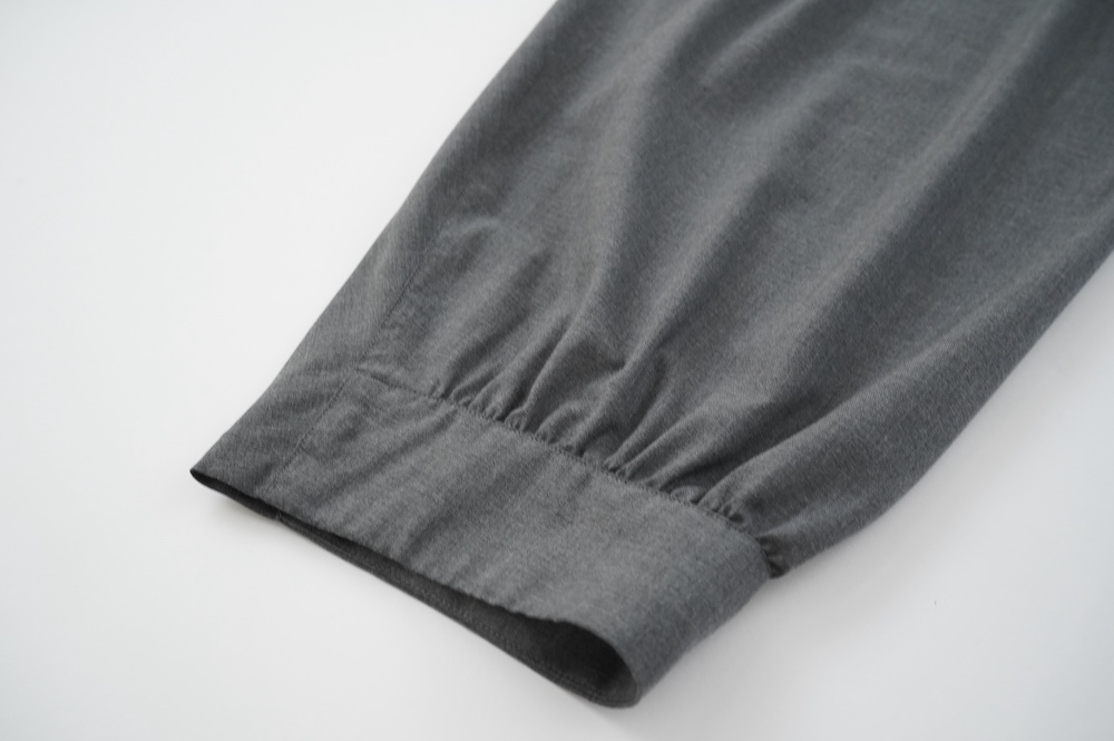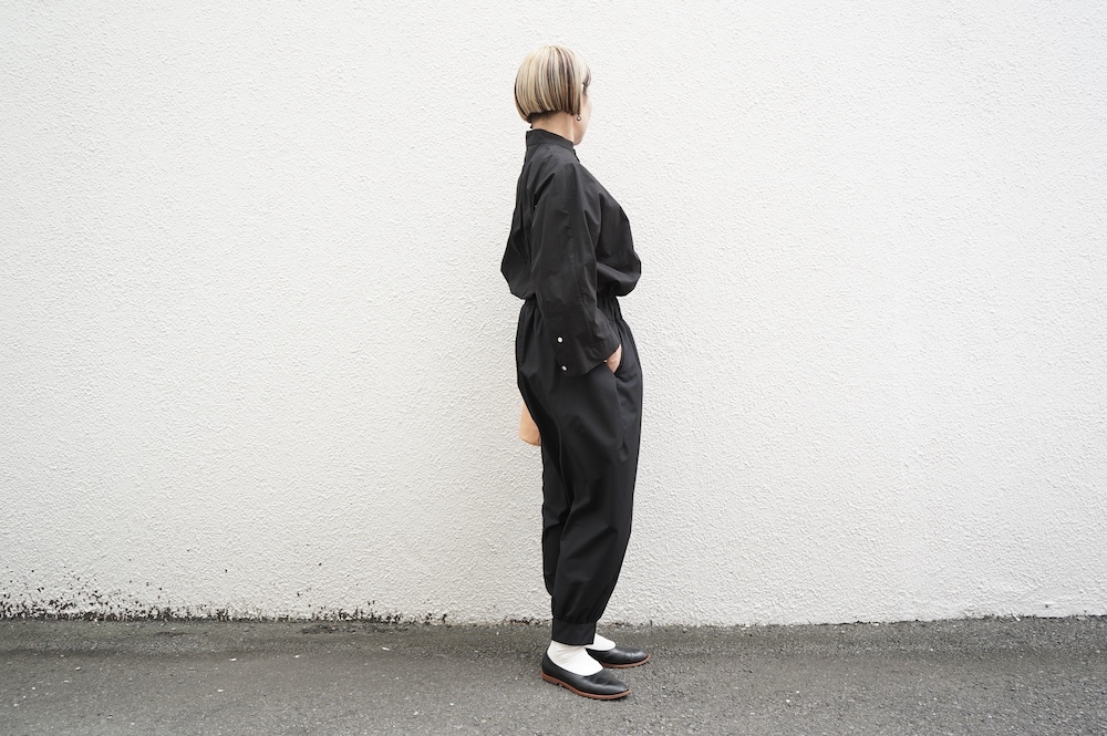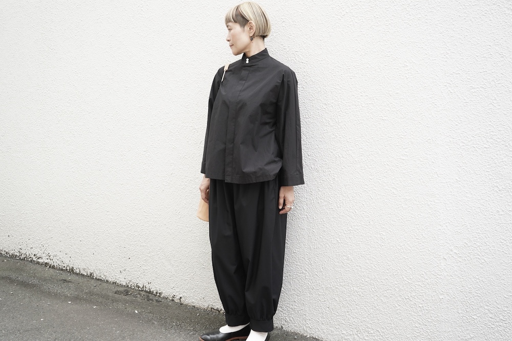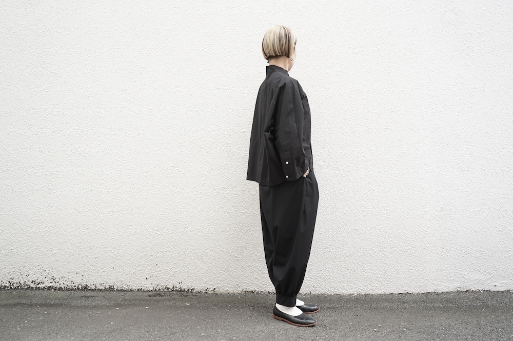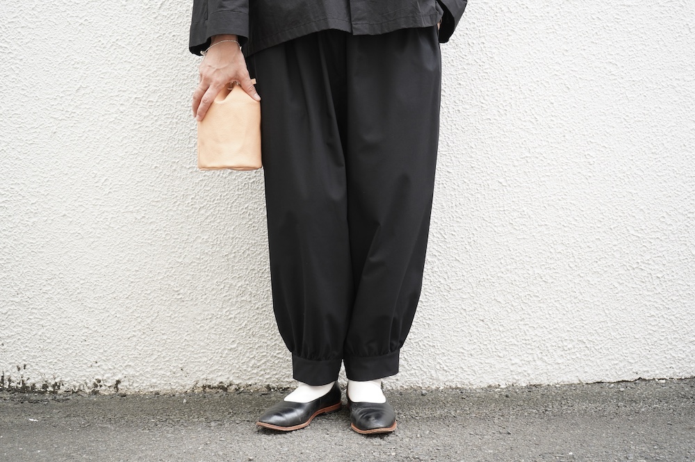 "ノーコントロールエアー"のパンツ。ポリエステルとレーヨンの交撚糸を使用した綾織生地。光沢はそこまで強く無いですが、つるっとしたなめらかな肌触りで、落ち感のある綺麗な素材です。厚すぎないので秋の始まりから長い期間で穿いていただけます。