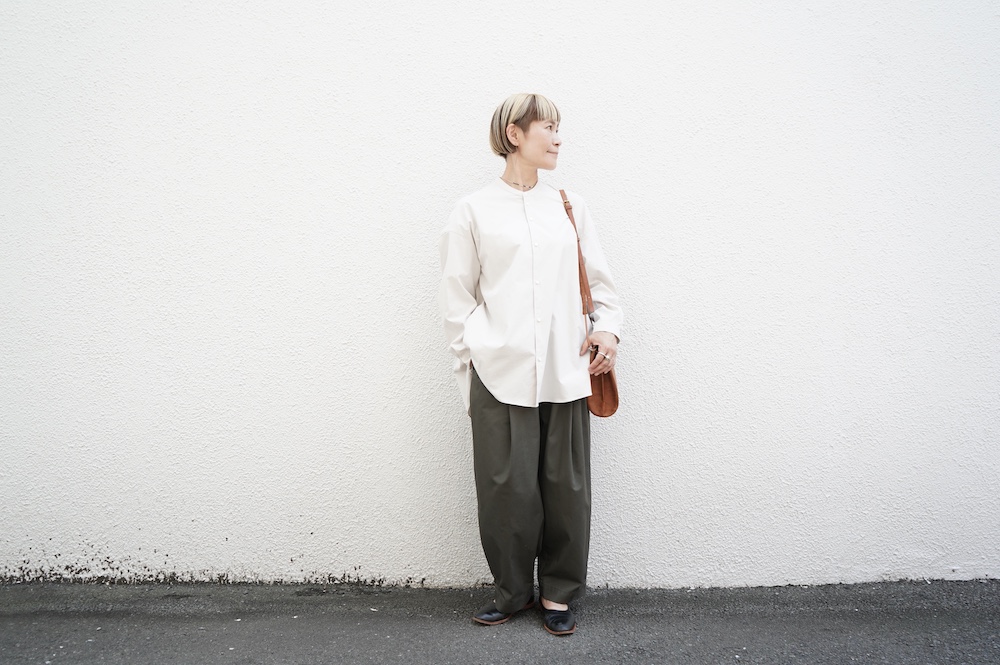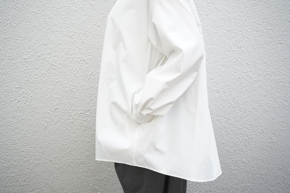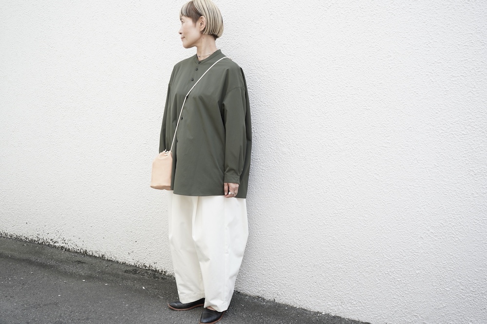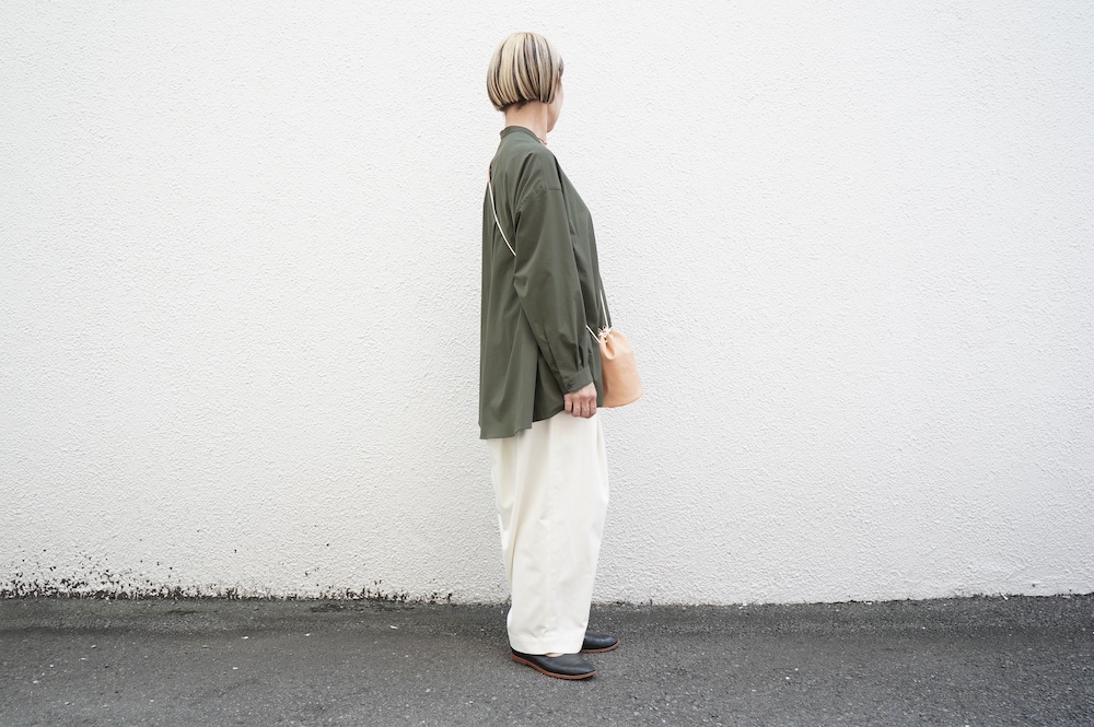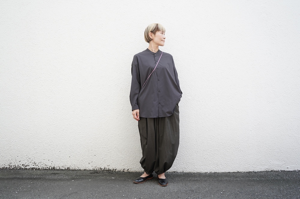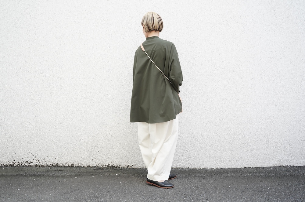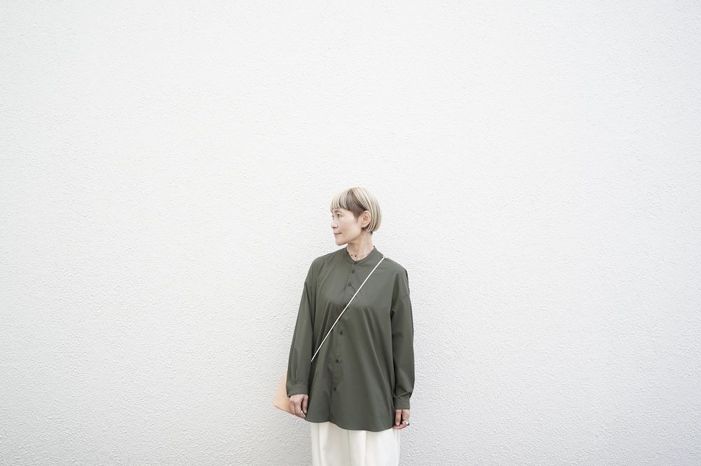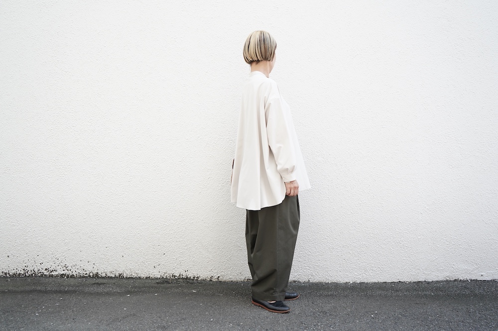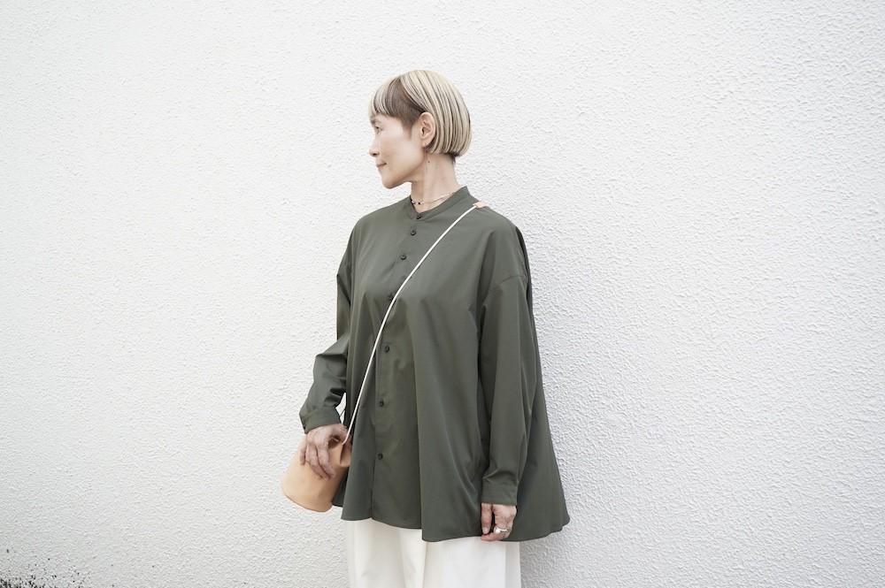 デザインはオーバーサイズのバンドカラーシャツ。前はスッキリで、後ろ身頃がフレアになっているのが特徴的です。ゆったりとした身幅に対して、すっきりとした袖幅の長袖です。メンズライクな雰囲気と、フレアバックスタイルの女性らしさがバランス良く調和したシャツです。そしてこちらのシャツはポケットが付いているので、羽織として着用いただくのも素敵です。
