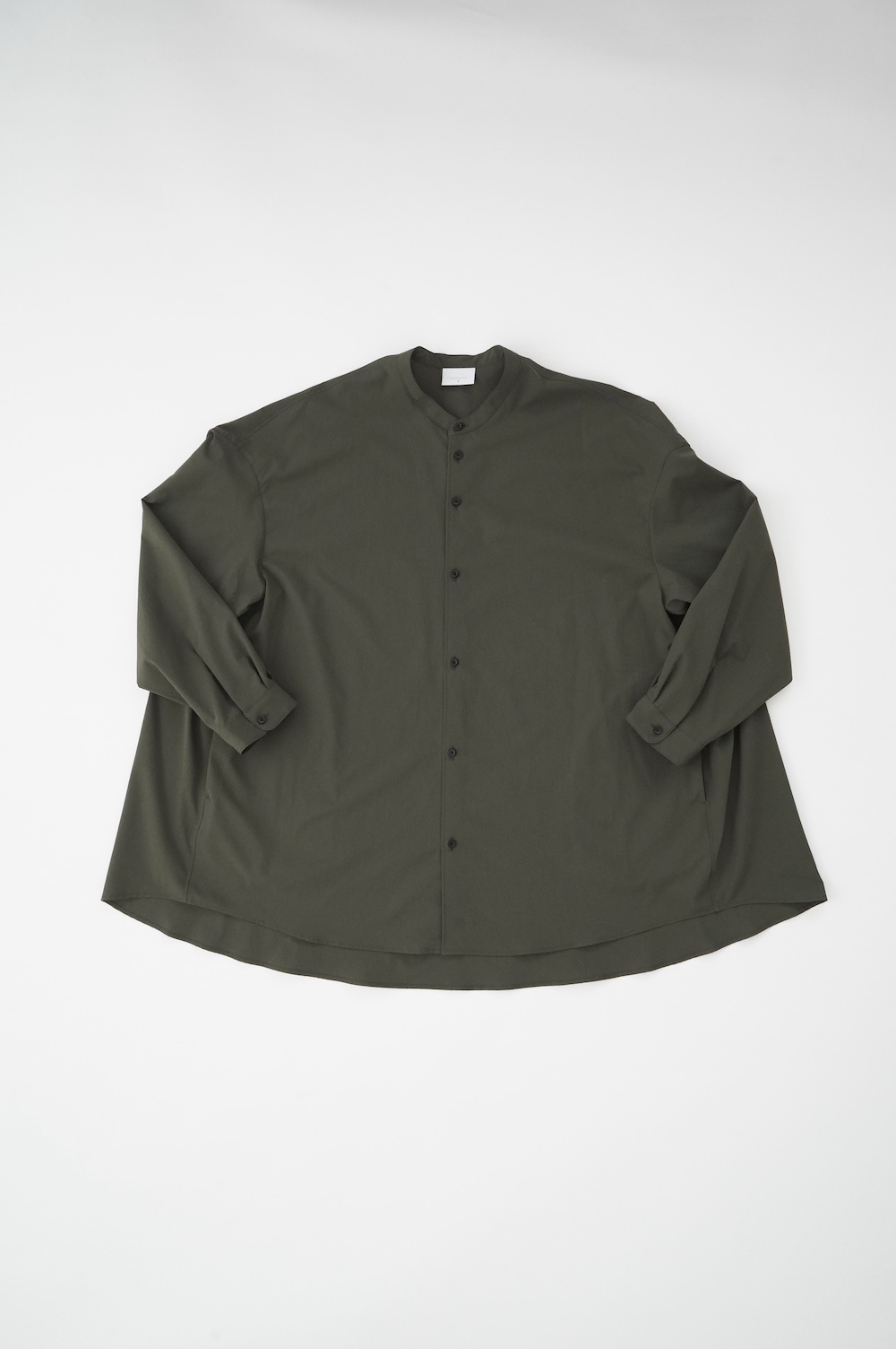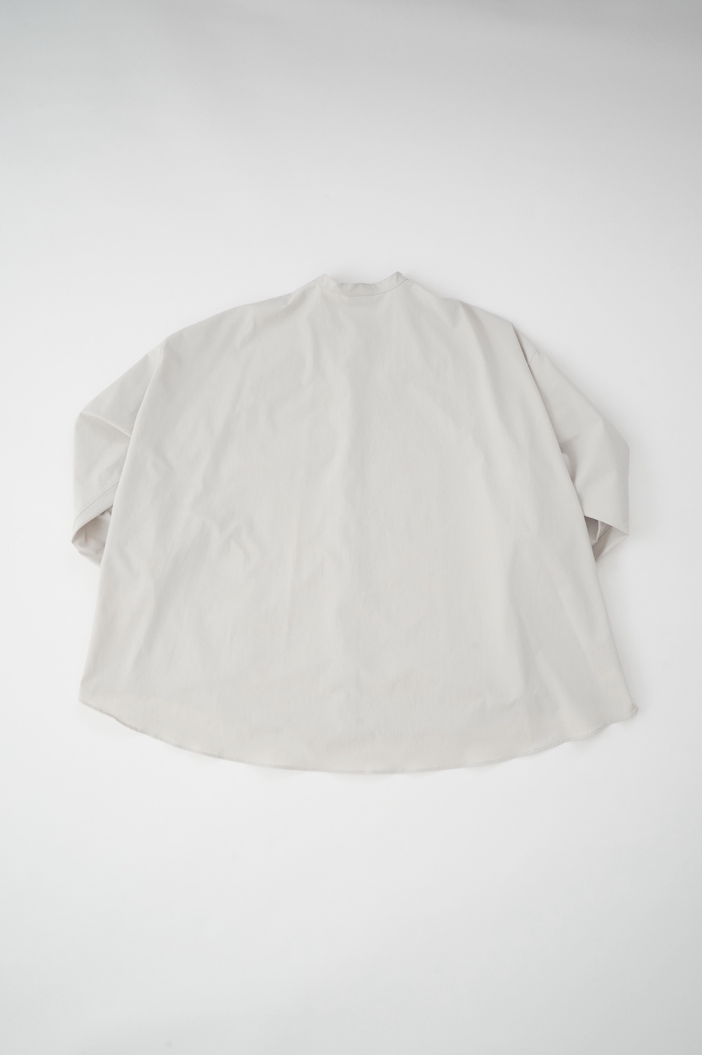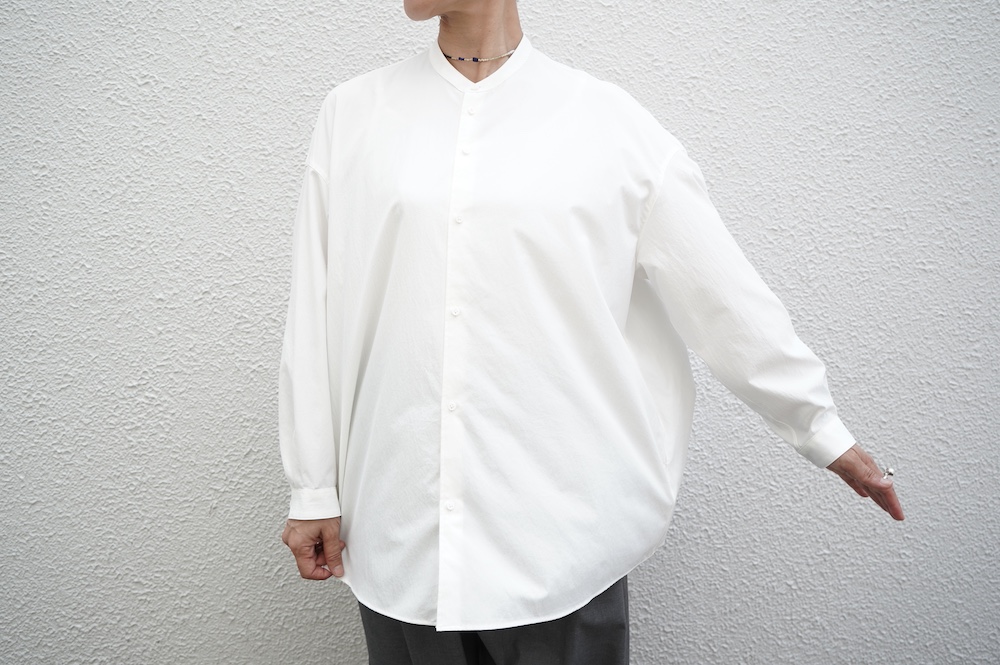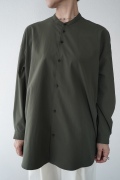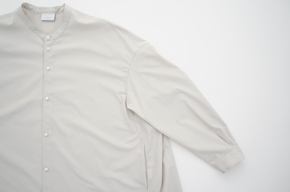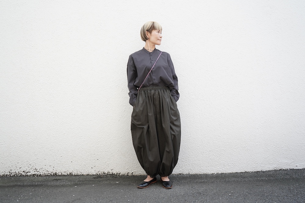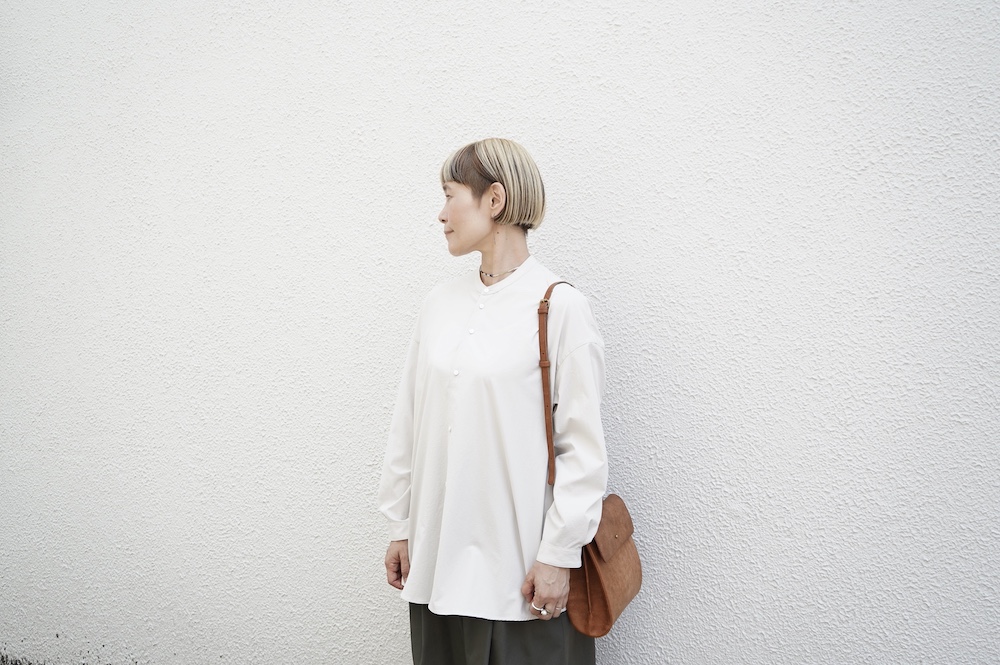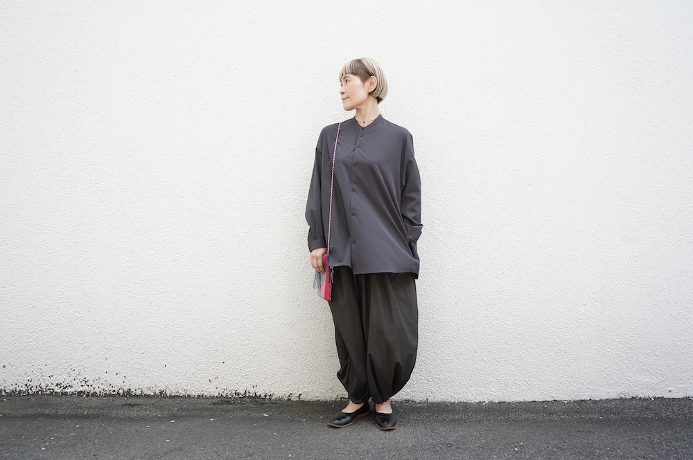デザインはオーバーサイズのバンドカラーシャツ。前はスッキリで、後ろ身頃がフレアになっているのが特徴的です。ゆったりとした身幅に対して、すっきりとした袖幅の長袖です。メンズライクな雰囲気と、フレアバックスタイルの女性らしさがバランス良く調和したシャツです。そしてこちらのシャツはポケットが付いているので、羽織として着用いただくのも素敵です。