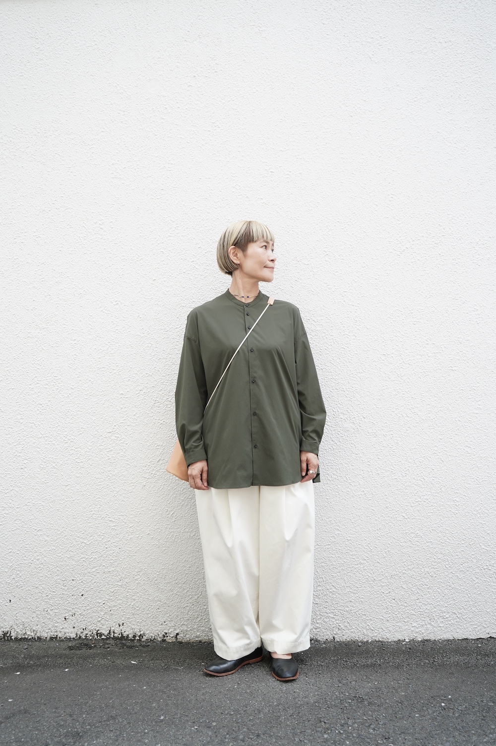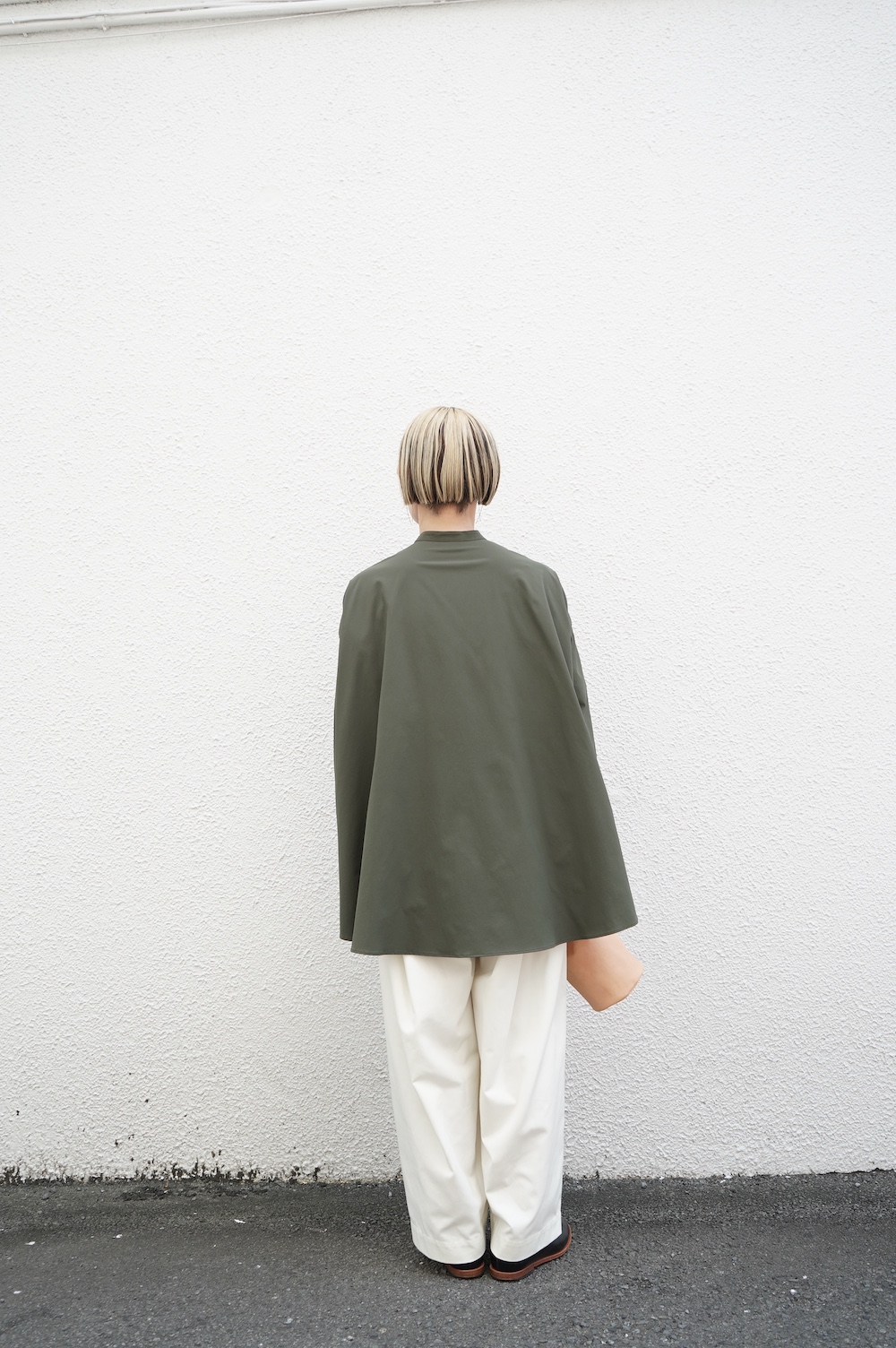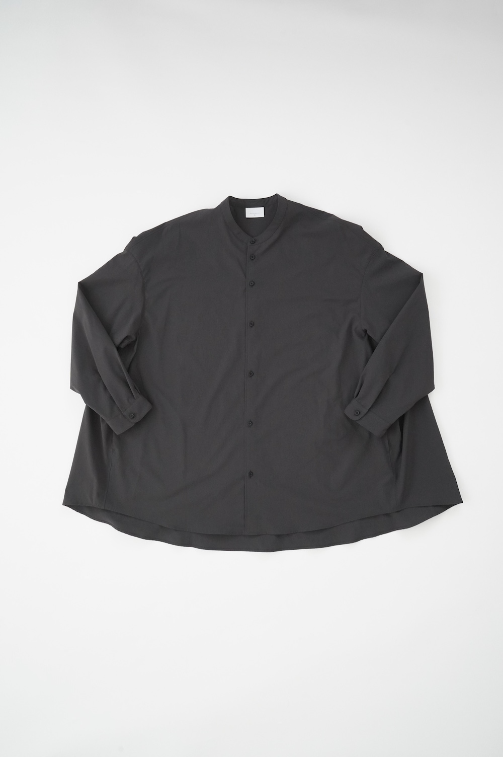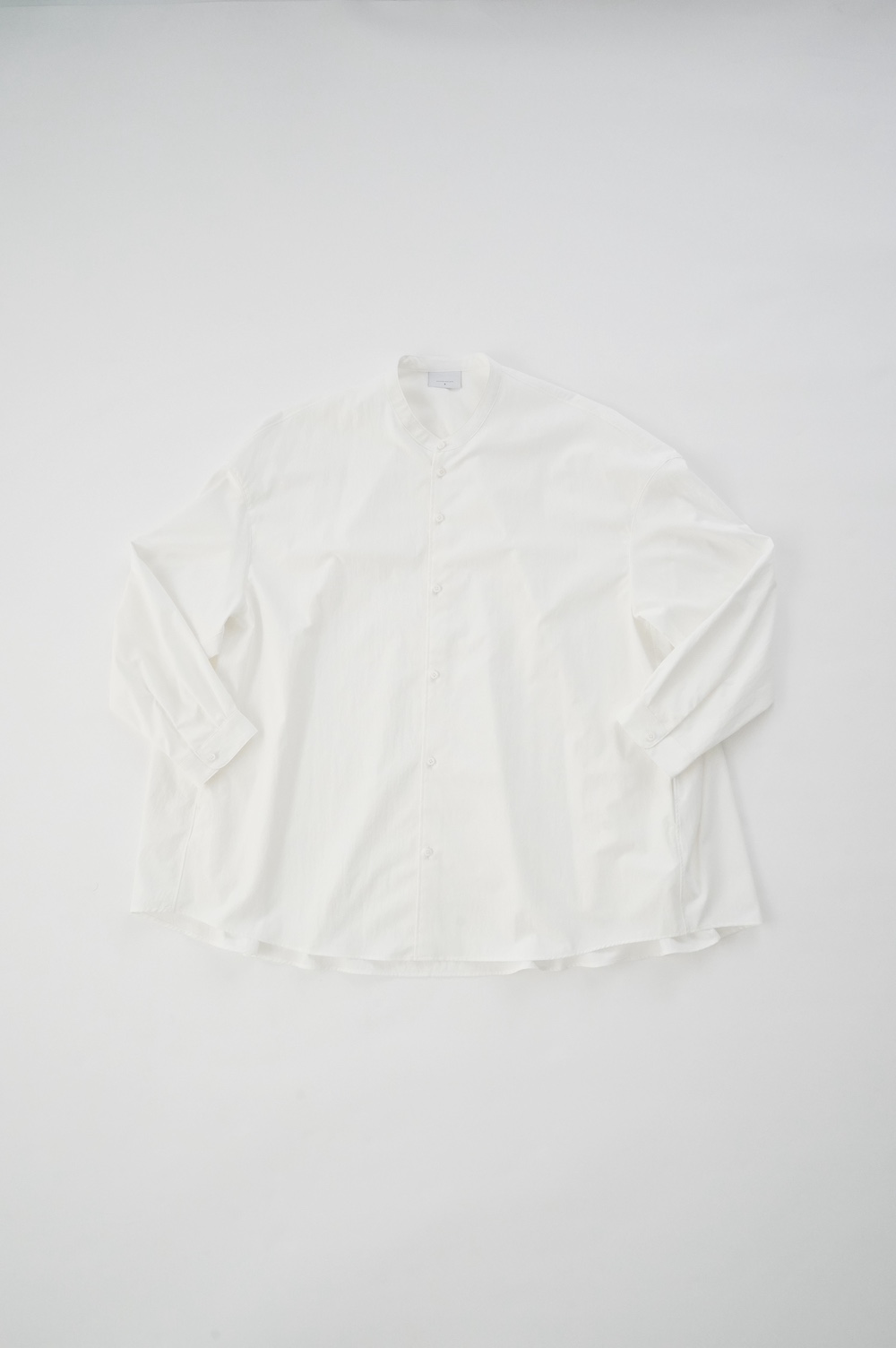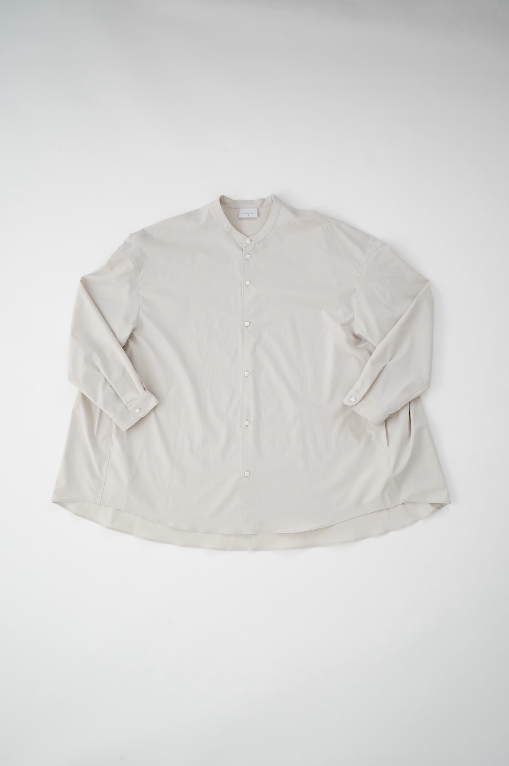 デザインはオーバーサイズのバンドカラーシャツ。前はスッキリで、後ろ身頃がフレアになっているのが特徴的です。ゆったりとした身幅に対して、すっきりとした袖幅の長袖です。メンズライクな雰囲気と、フレアバックスタイルの女性らしさがバランス良く調和したシャツです。そしてこちらのシャツはポケットが付いているので、羽織として着用いただくのも素敵です。