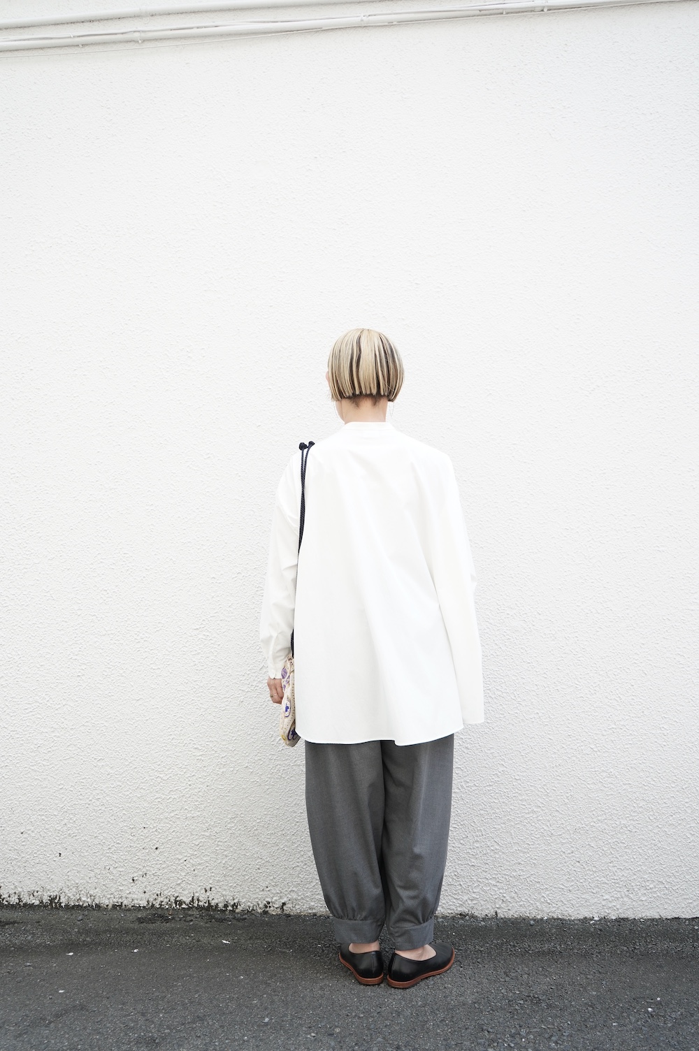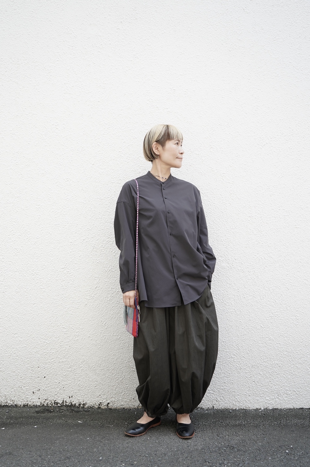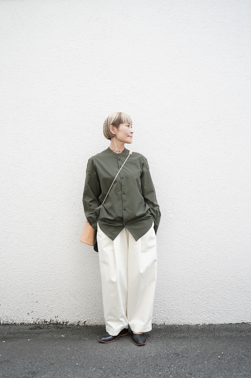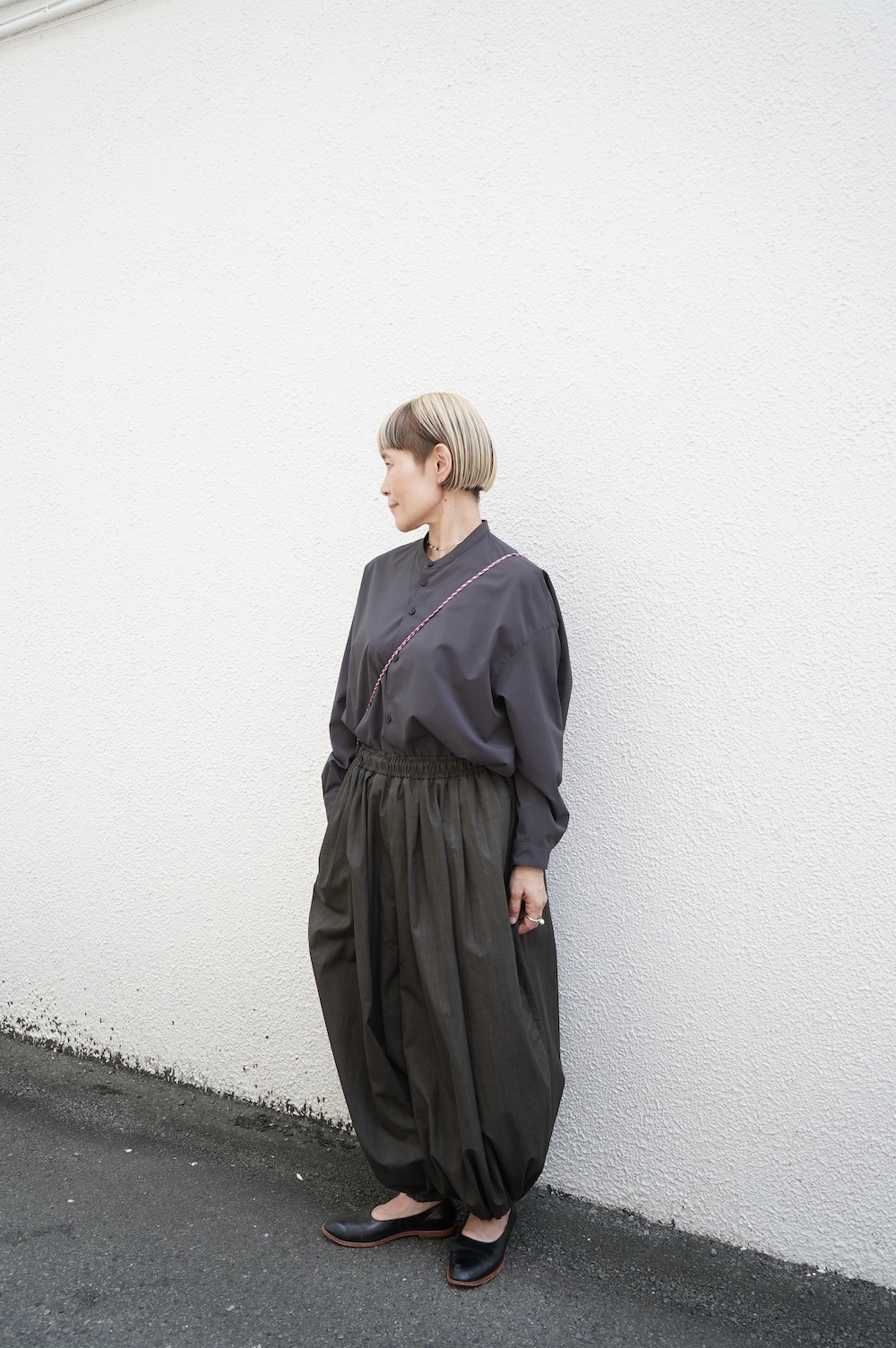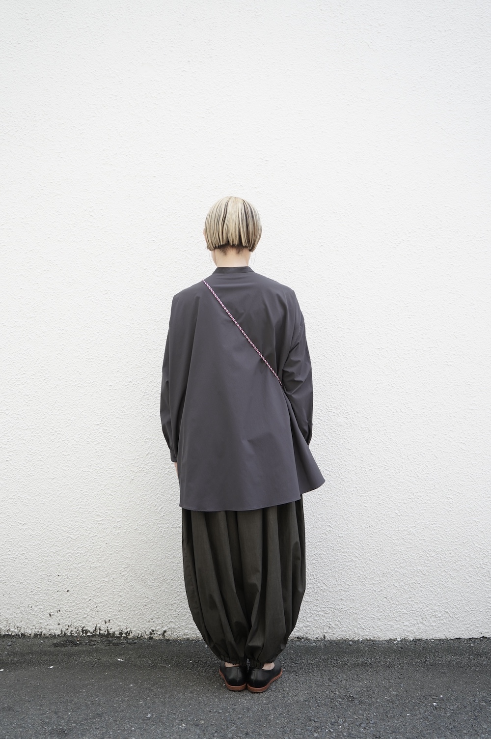 デザインはオーバーサイズのバンドカラーシャツ。前はスッキリで、後ろ身頃がフレアになっているのが特徴的です。ゆったりとした身幅に対して、すっきりとした袖幅の長袖です。メンズライクな雰囲気と、フレアバックスタイルの女性らしさがバランス良く調和したシャツです。そしてこちらのシャツはポケットが付いているので、羽織として着用いただくのも素敵です。
