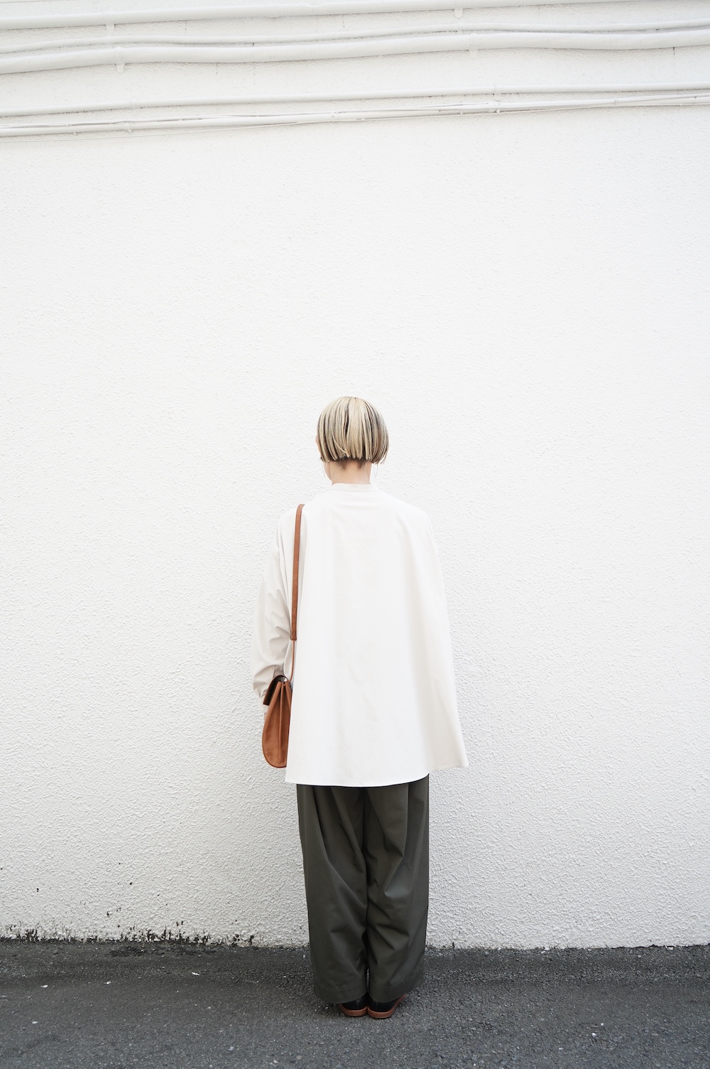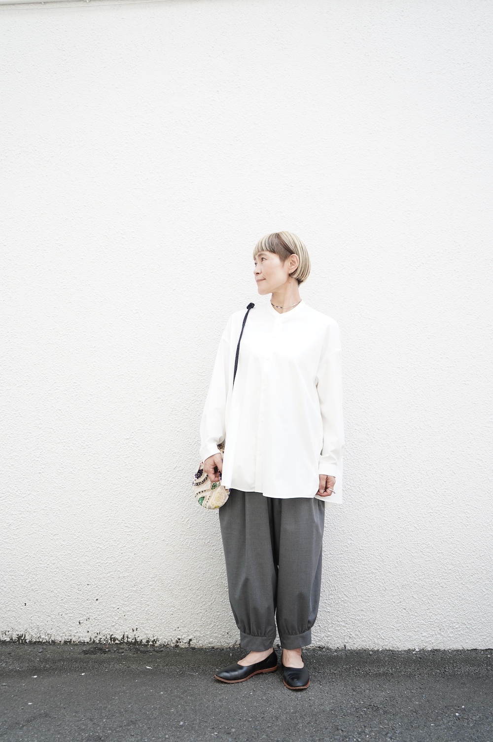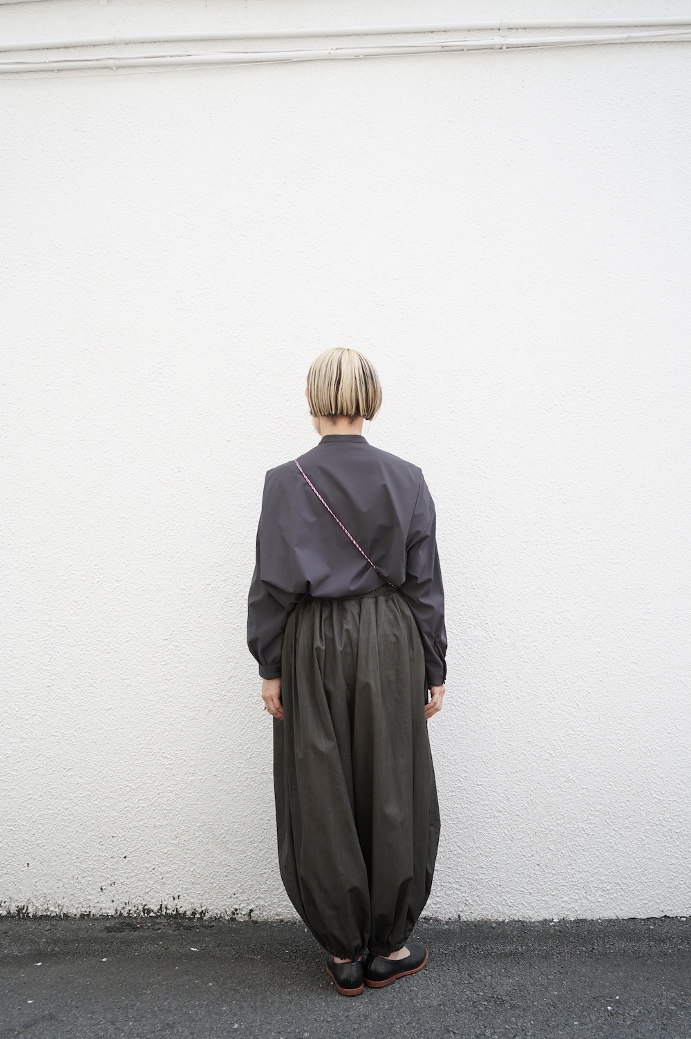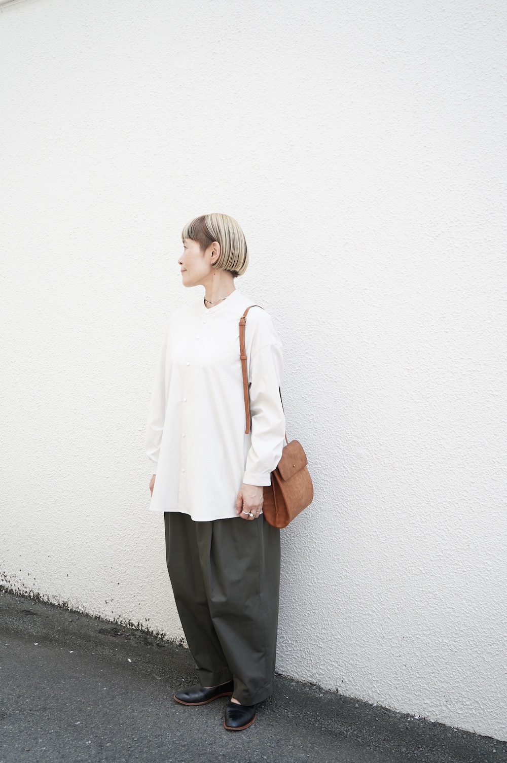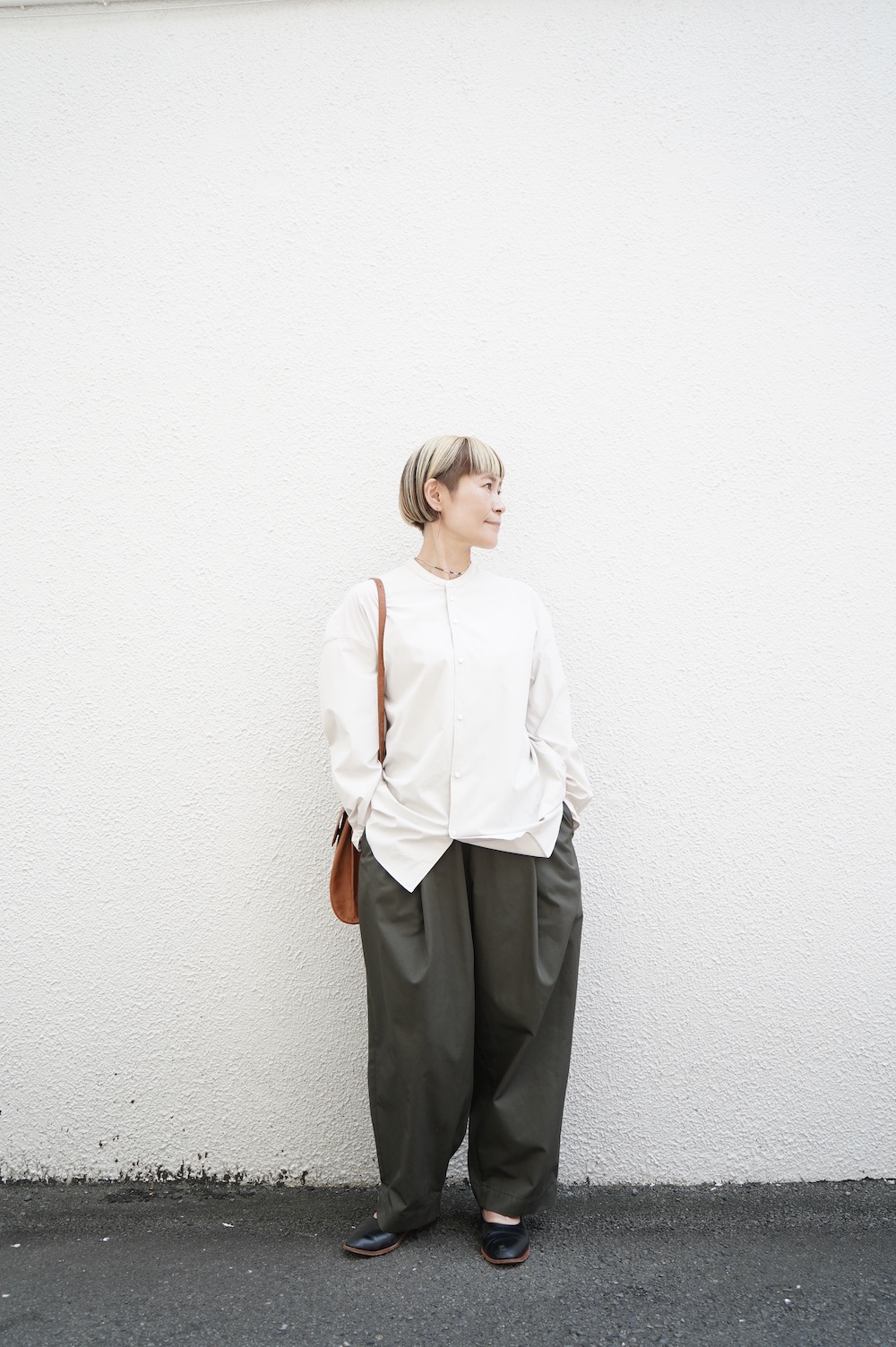 デザインはオーバーサイズのバンドカラーシャツ。前はスッキリで、後ろ身頃がフレアになっているのが特徴的です。ゆったりとした身幅に対して、すっきりとした袖幅の長袖です。メンズライクな雰囲気と、フレアバックスタイルの女性らしさがバランス良く調和したシャツです。そしてこちらのシャツはポケットが付いているので、羽織として着用いただくのも素敵です。