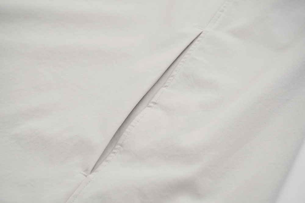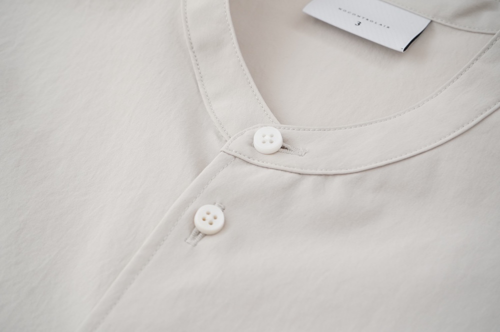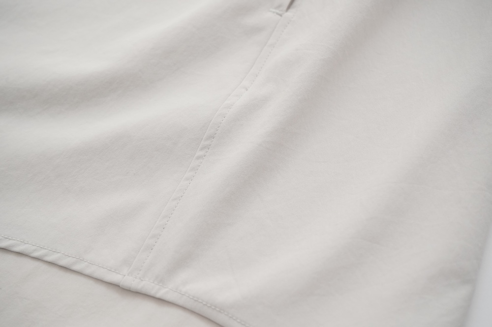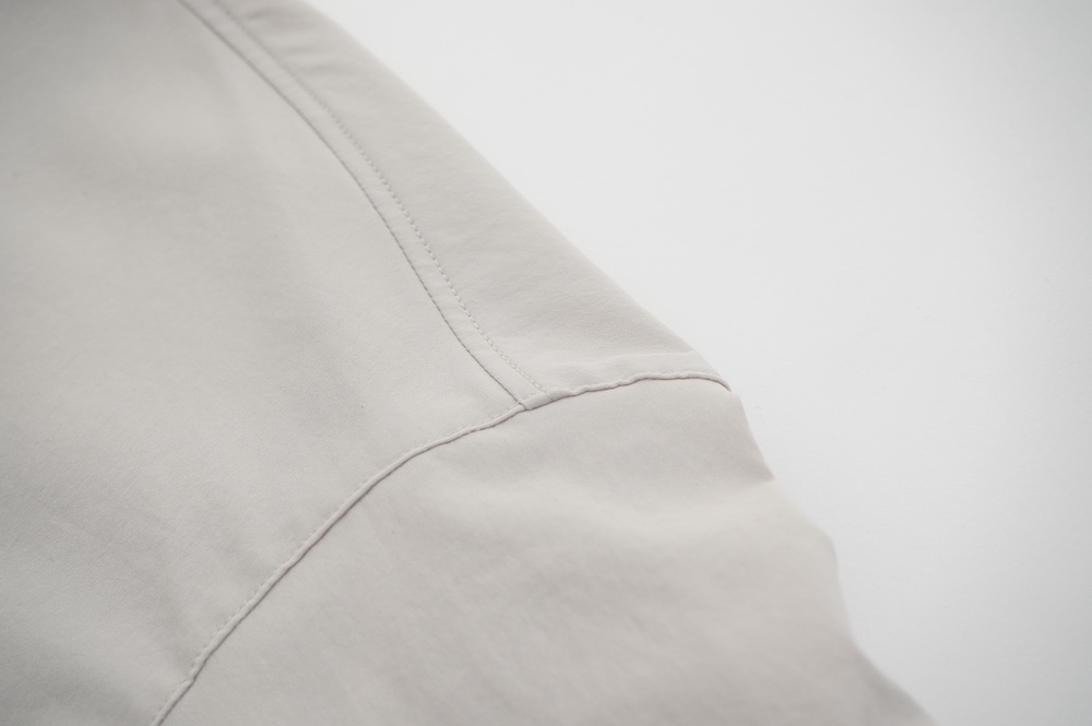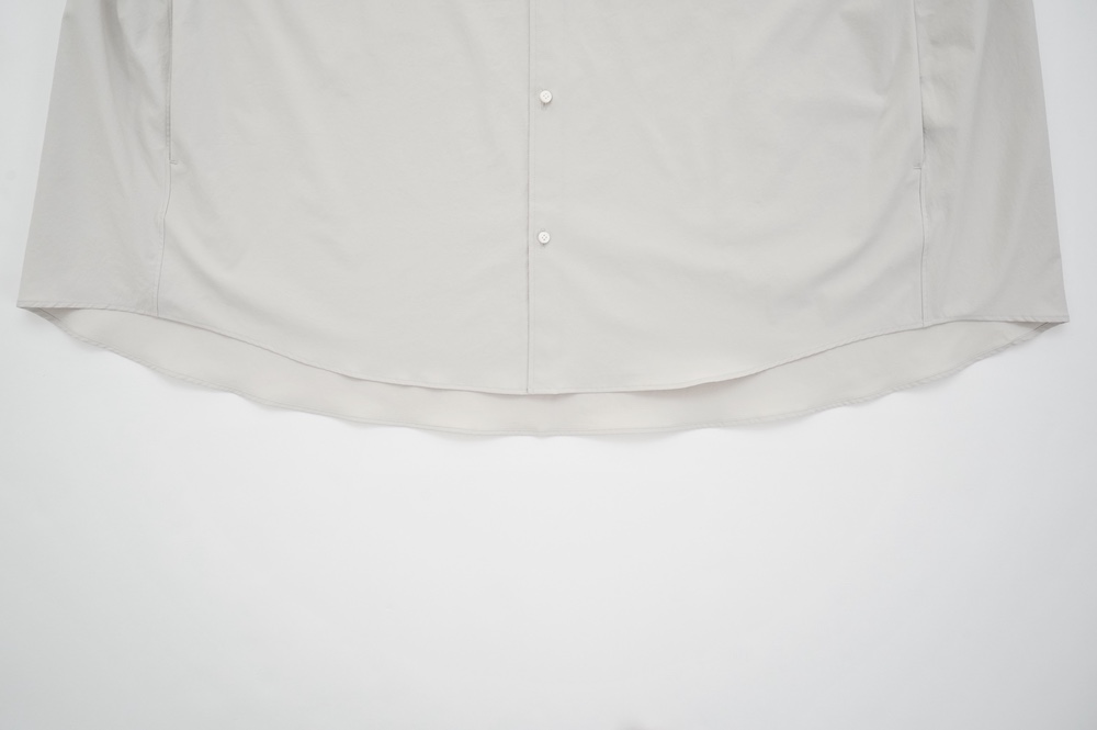 "ノーコントロールエアー"のシャツ。光沢のないストレッチ性のあるポリエステル糸を使用した、平織りのタイプライター生地を使用。透けにくい糸を高密度で織り上げているので、淡色でも透けにくいのがポイントです。ストレッチも効いていて、速乾性もあるのでまだすこし暑さの残る時期からでも着ていただきやすい素材です