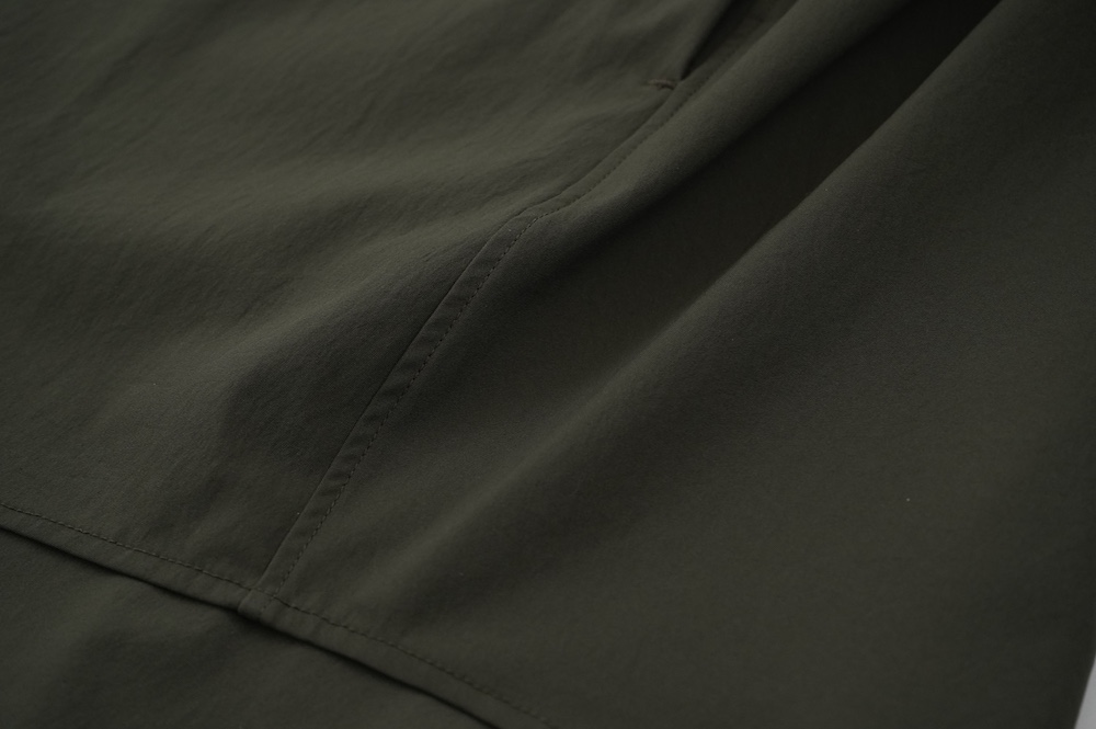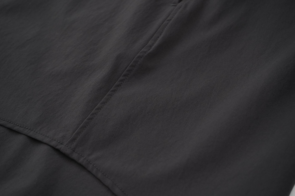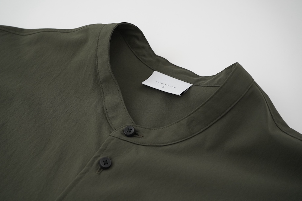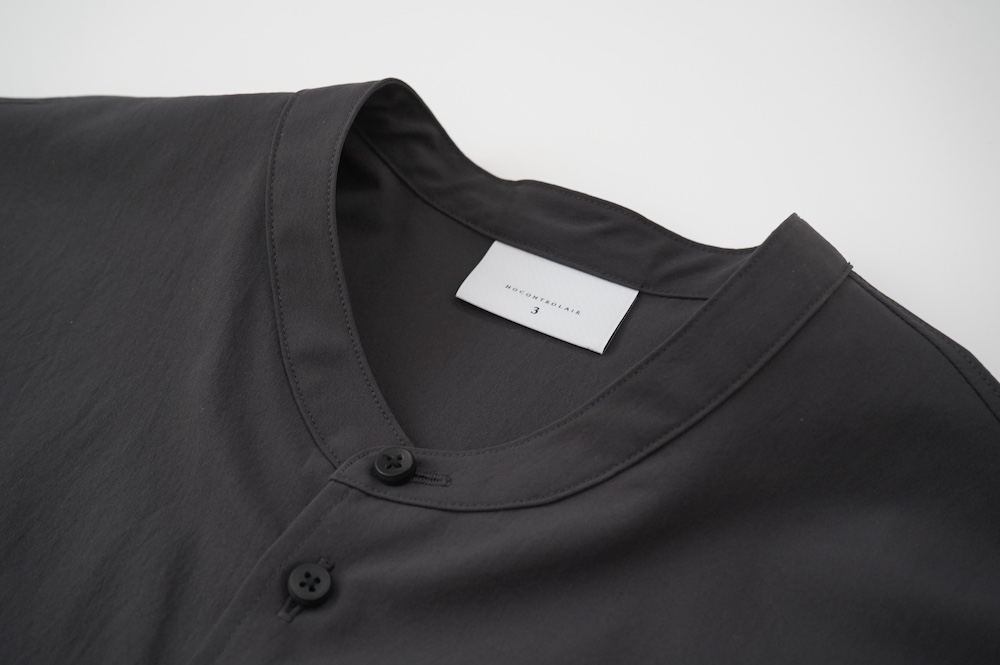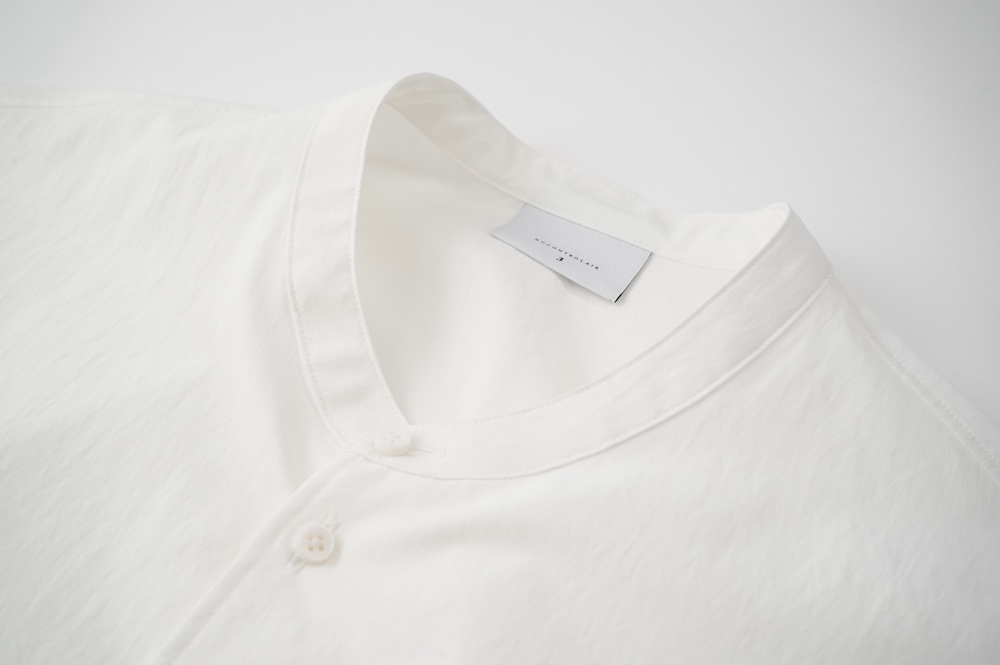 "ノーコントロールエアー"のシャツ。光沢のないストレッチ性のあるポリエステル糸を使用した、平織りのタイプライター生地を使用。透けにくい糸を高密度で織り上げているので、淡色でも透けにくいのがポイントです。ストレッチも効いていて、速乾性もあるのでまだすこし暑さの残る時期からでも着ていただきやすい素材です