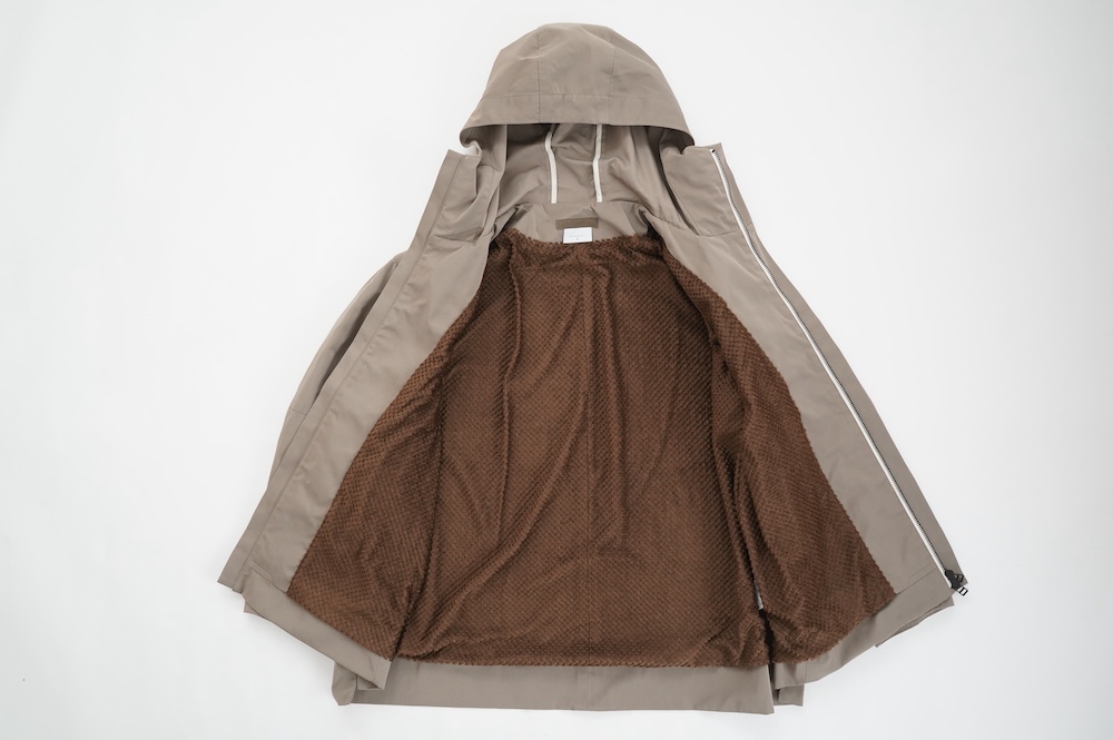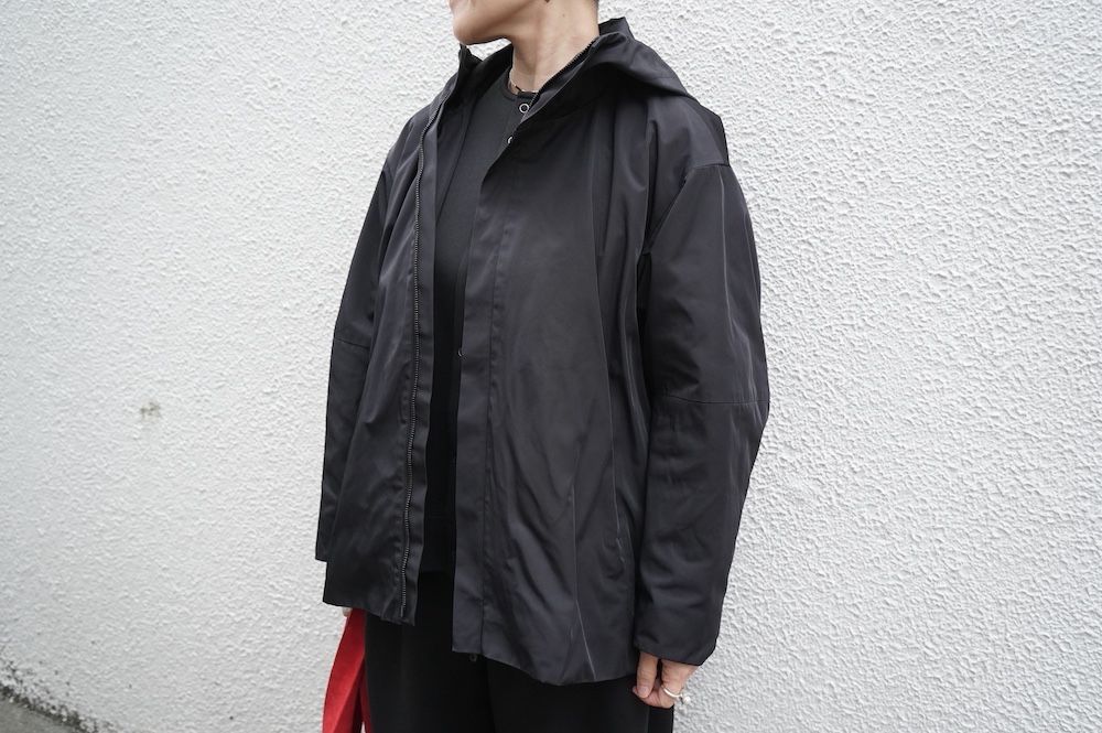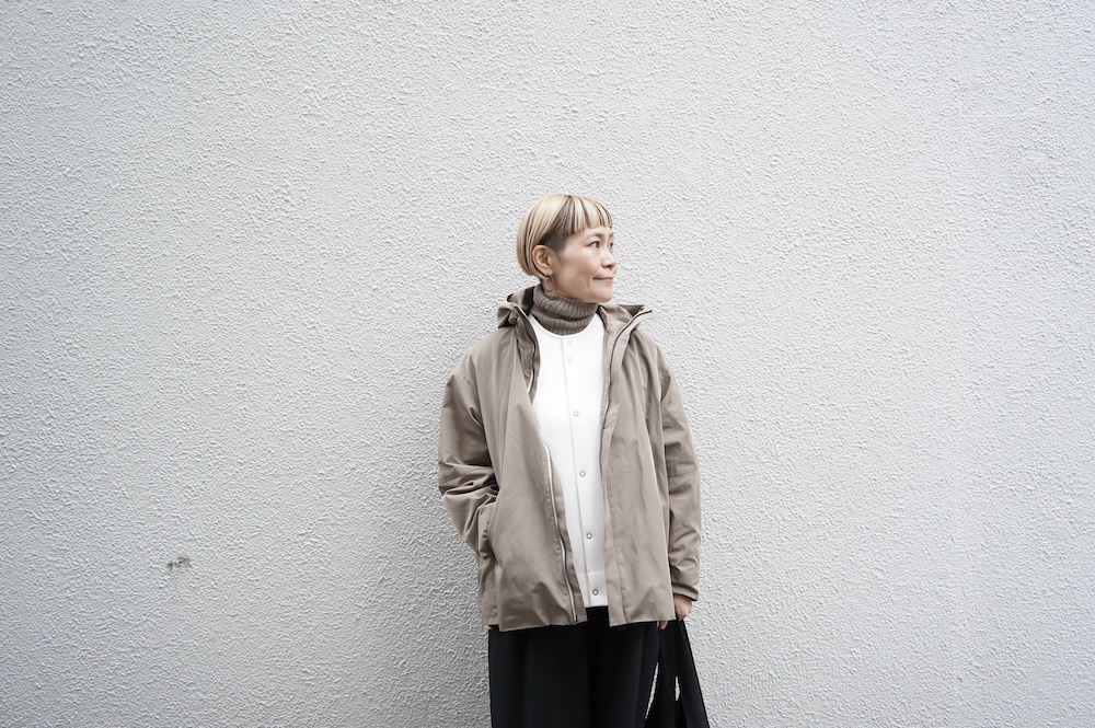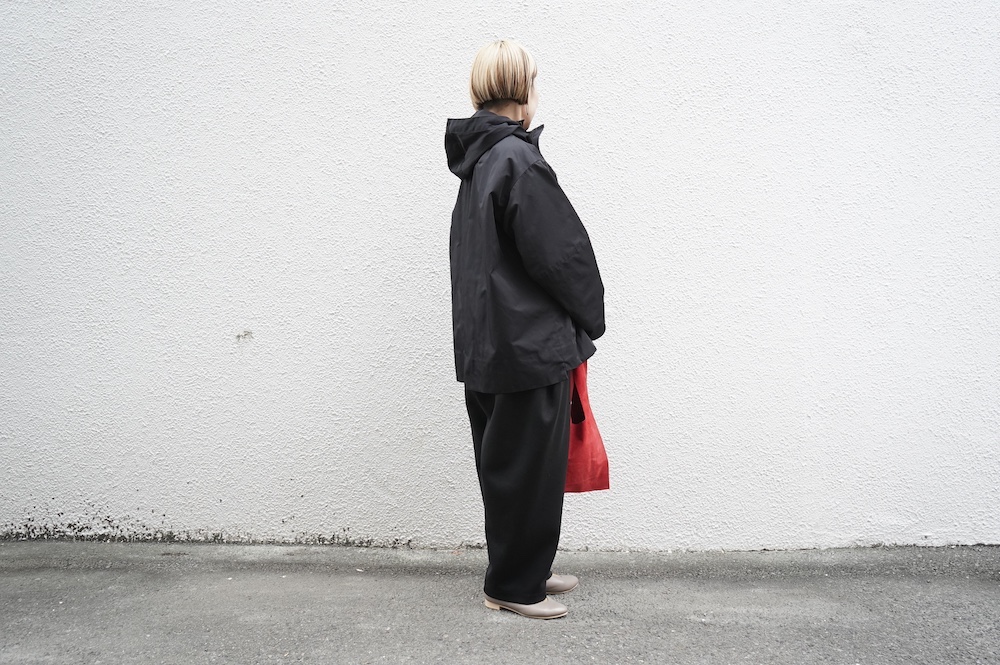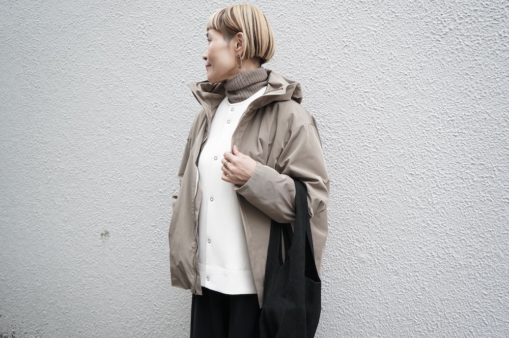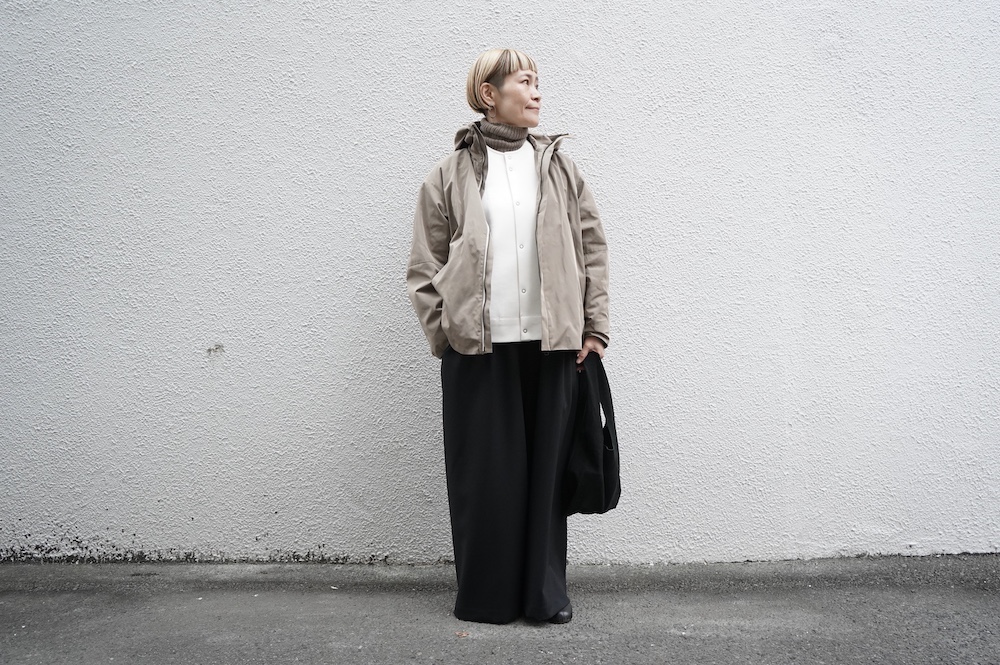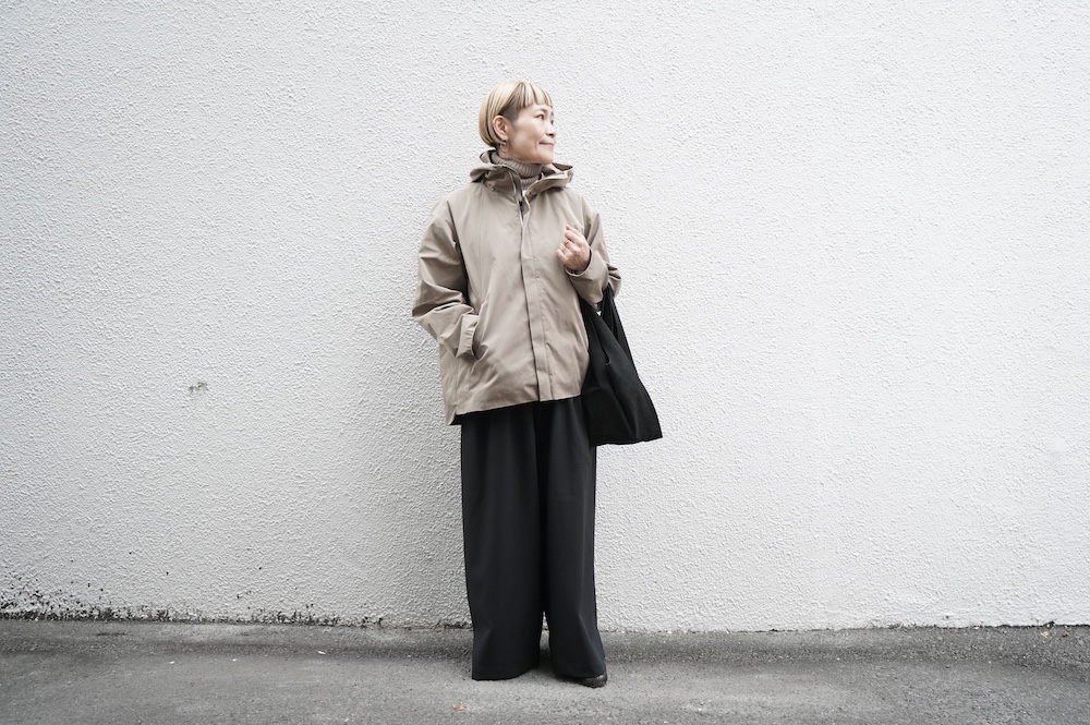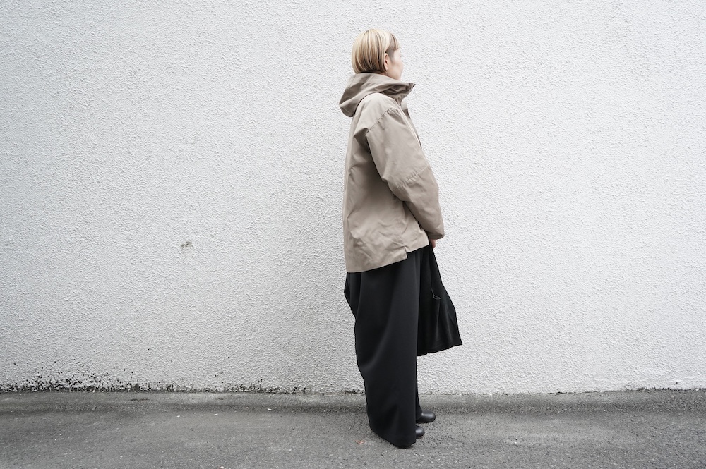 デザインは、フード付きの短い丈のブルゾン。前立てはファスナーで、前身頃の切り替え位置にシームポケットが施されています。身幅はゆとりがあり、肩周りもドロップショルダーのように動きやすいパターンになっています。スポーティーすぎないシンプルなデザインで羽織りやすく、季節も春先や秋口にもぴったりです。長い季節で重宝するフードブルゾンです。