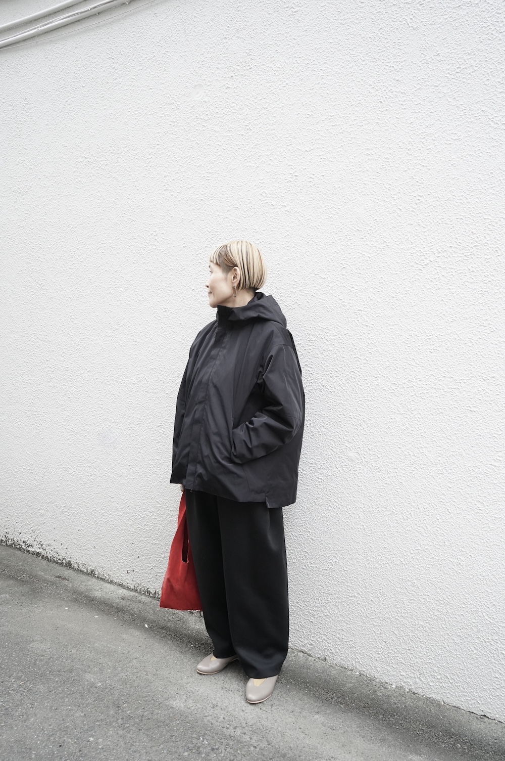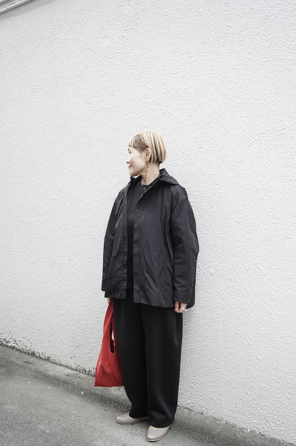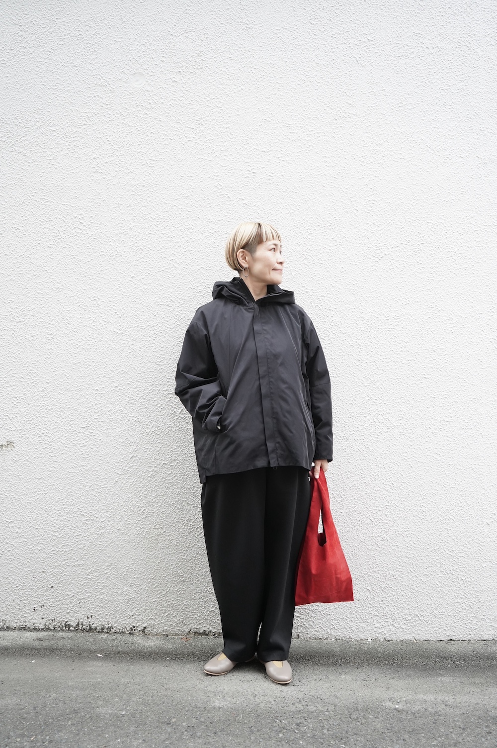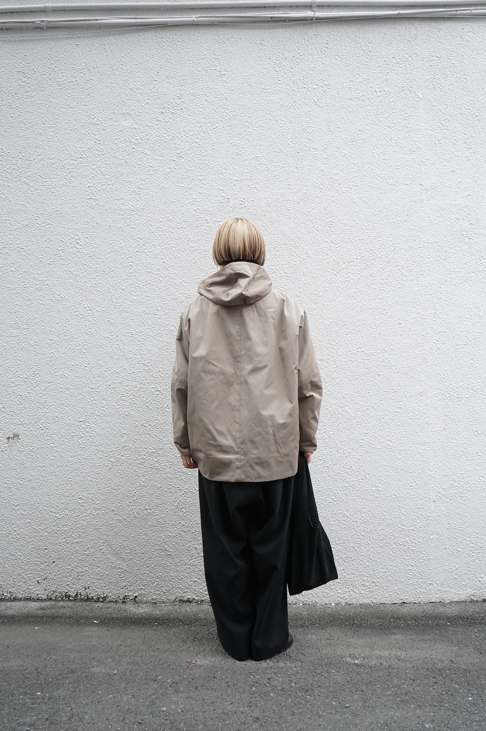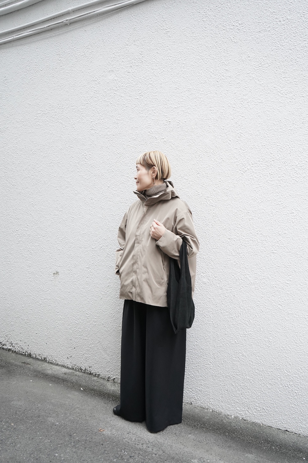 デザインは、フード付きの短い丈のブルゾン。前立てはファスナーで、前身頃の切り替え位置にシームポケットが施されています。身幅はゆとりがあり、肩周りもドロップショルダーのように動きやすいパターンになっています。スポーティーすぎないシンプルなデザインで羽織りやすく、季節も春先や秋口にもぴったりです。長い季節で重宝するフードブルゾンです。