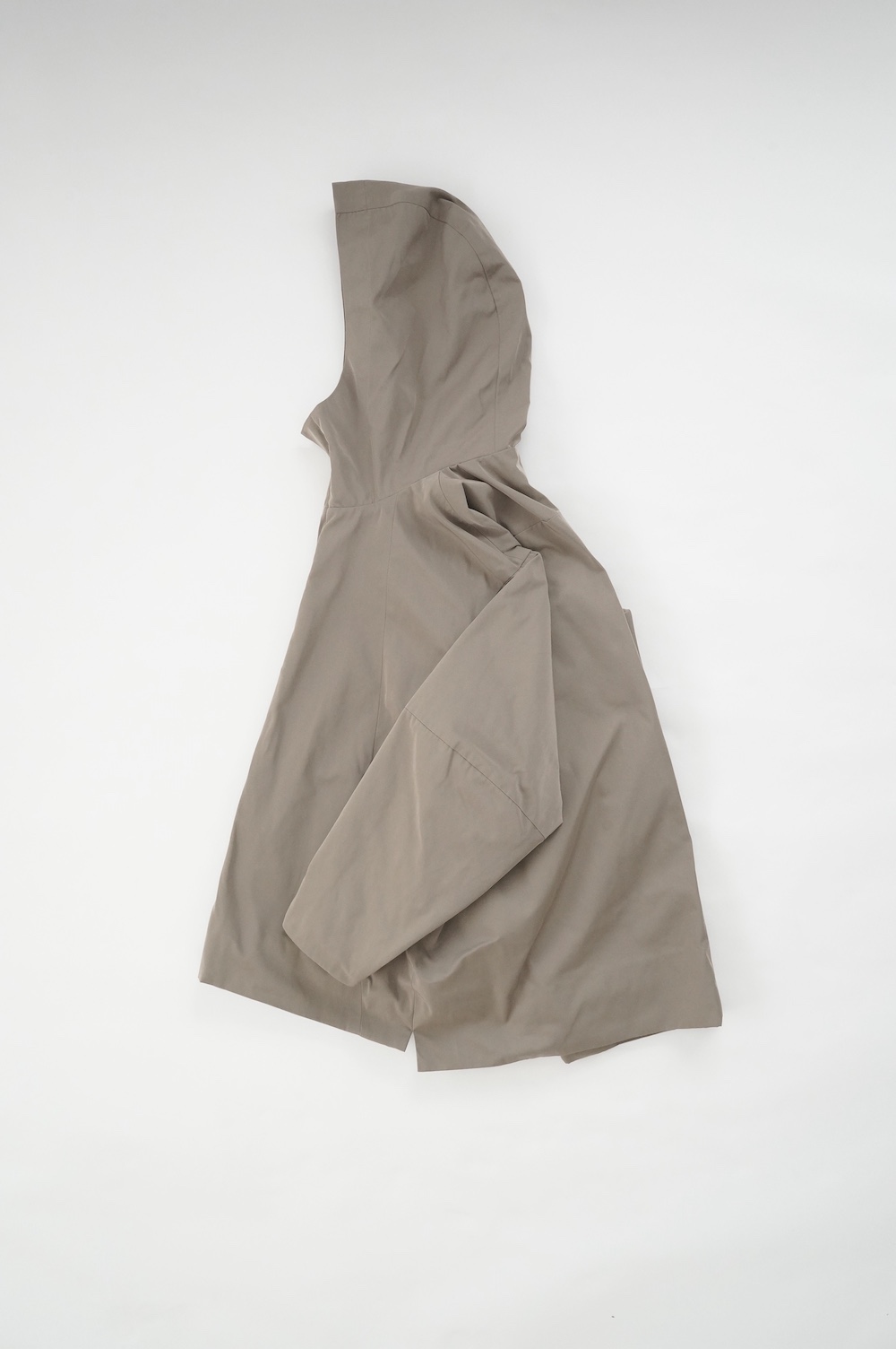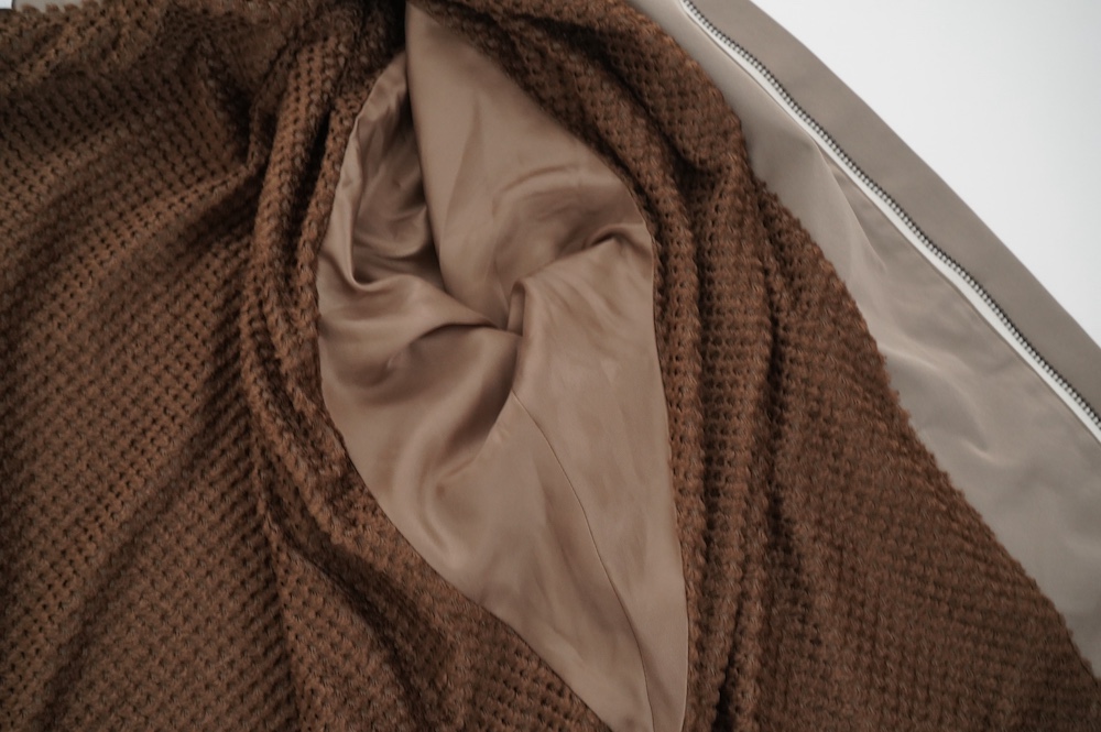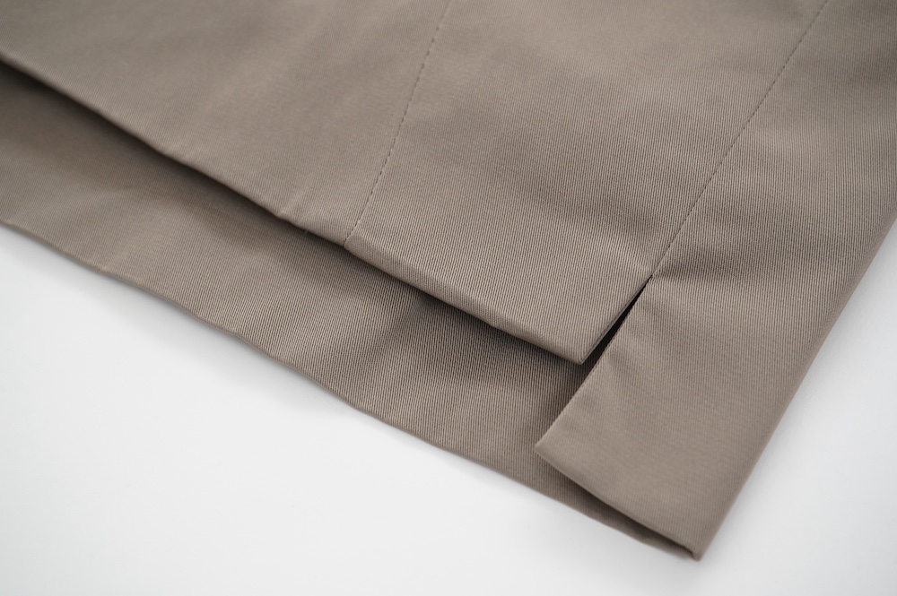 "ノーコントロールエアー"のコート。特殊糸である形状記憶ポリエステル糸を強撚した綾織のギャバジン生地を使用。コシがあり、落ち着いた光沢感のある素材です。糸の特性で軽い撥水効果もあります。裏地には、機能中空糸octa®︎を使用した起毛素材を使用。この糸は、中空部と8本の突起部に断熱効果を高める空気の層(デットエア)をため込むことにより、優れた保温性があります。またとても軽いのもポイント。アウトドア製品などでも使われている、薄手ですが高機能な素材です。