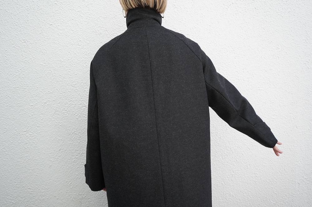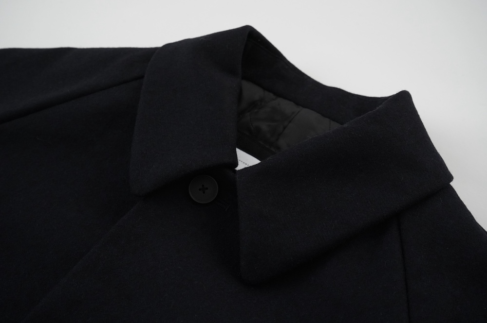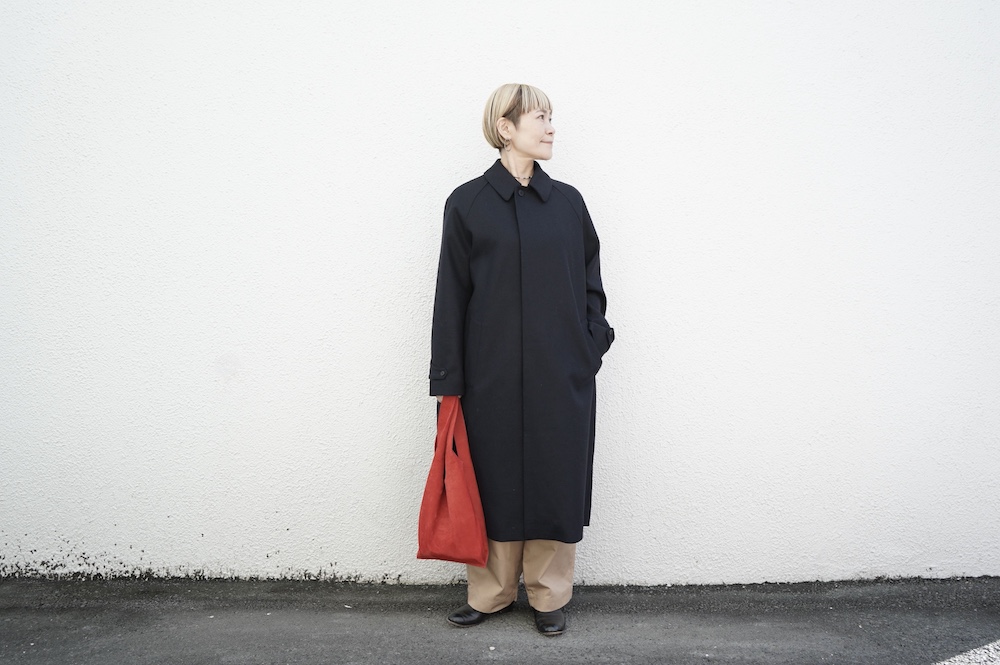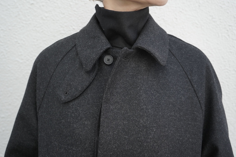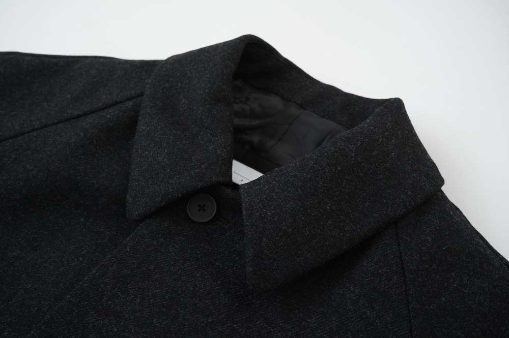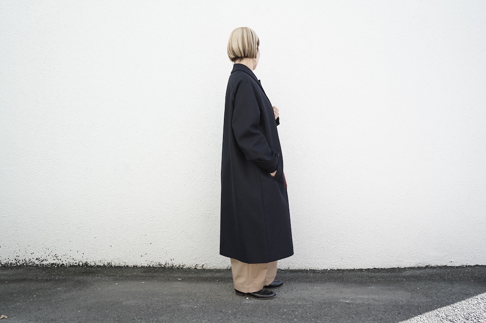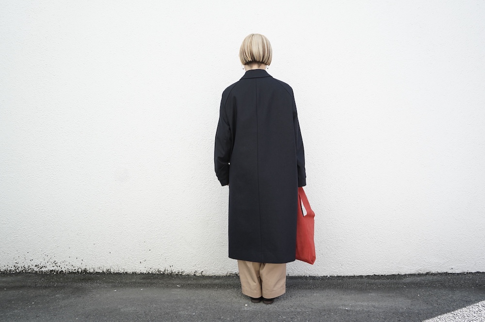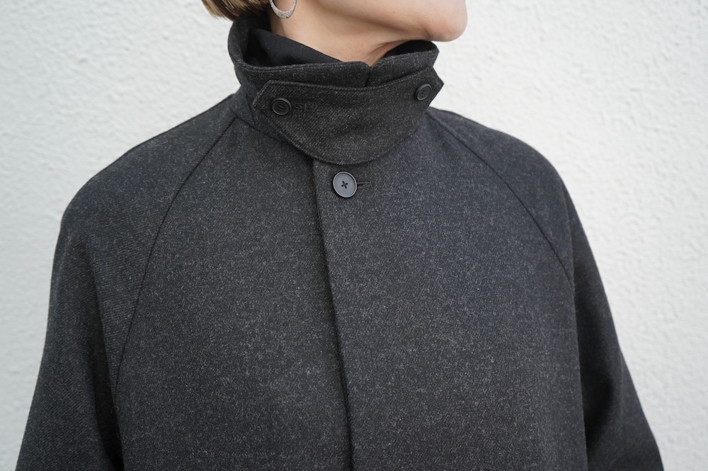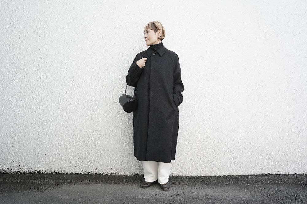 デザインは、スタンダードなデザインのステンカラーコート。身幅に程よくゆとりを持たせたシルエットで、ニットやジャケットの上からもすっと重ねられるバランスです。フロントは比翼仕立てですっきりとミニマルなデザイン。袖はラグランで肩にダーツが入っているので動きやすく、素材の軽さも相まって軽やかな着心地。身頃の内側にチンストラップが装着されています。寒い日にはチンストタップを取り外し