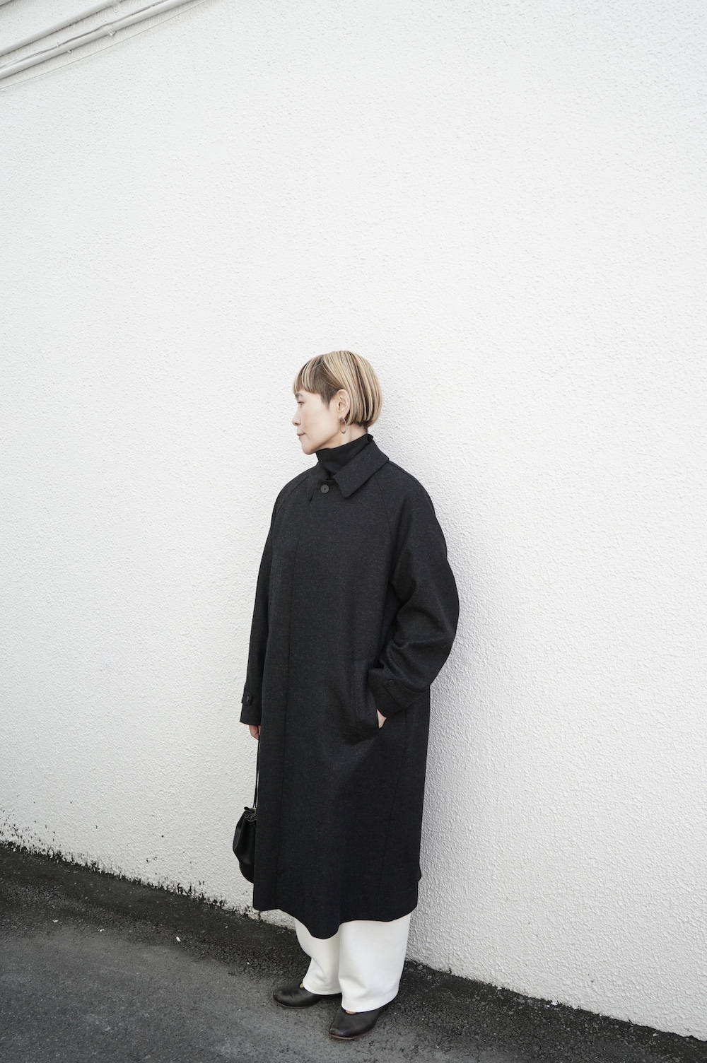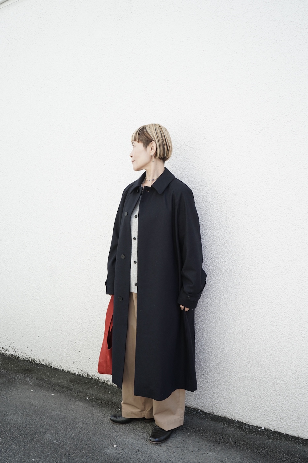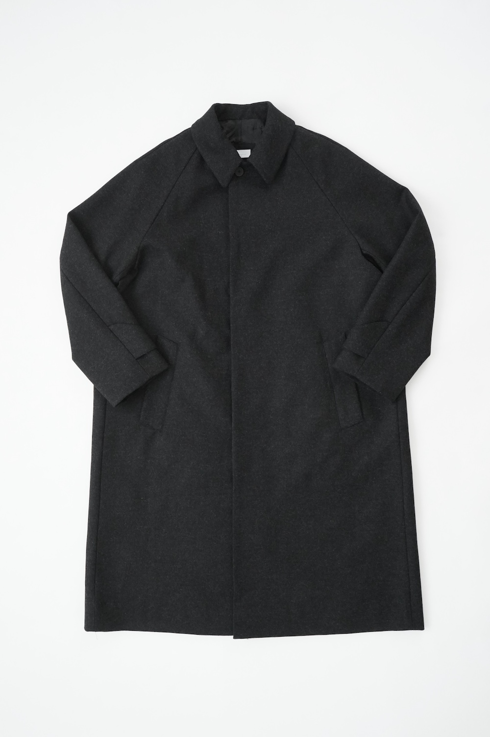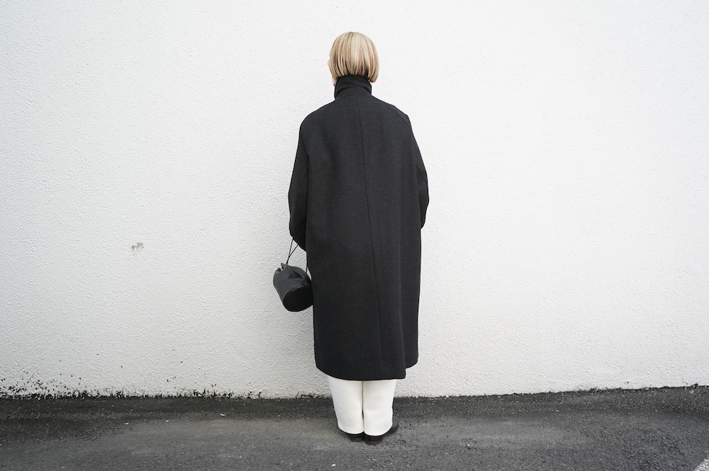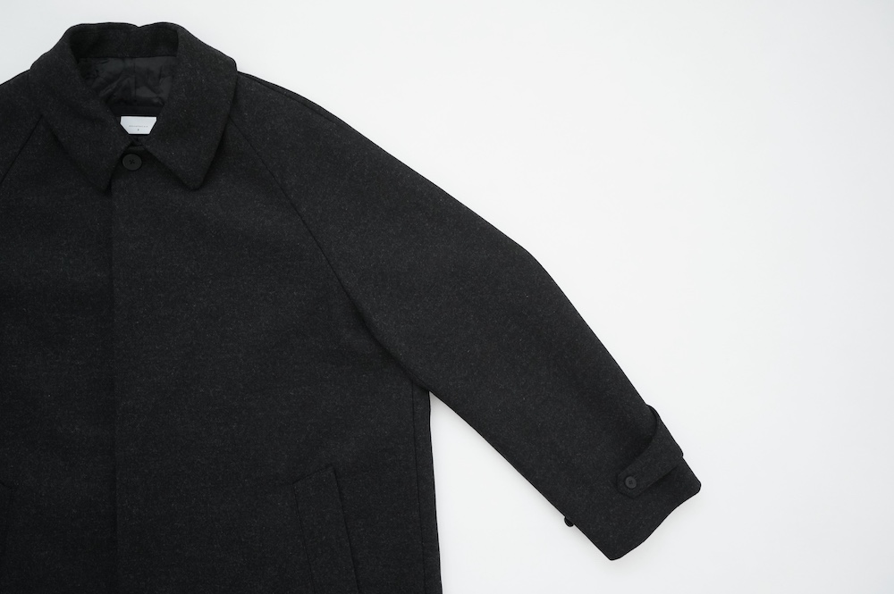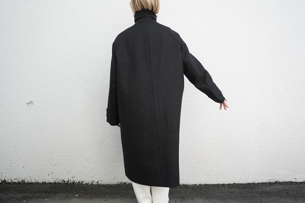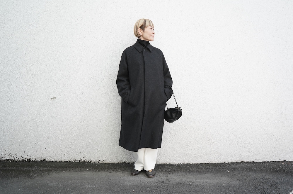 デザインは、スタンダードなデザインのステンカラーコート。身幅に程よくゆとりを持たせたシルエットで、ニットやジャケットの上からもすっと重ねられるバランスです。フロントは比翼仕立てですっきりとミニマルなデザイン。袖はラグランで肩にダーツが入っているので動きやすく、素材の軽さも相まって軽やかな着心地。身頃の内側にチンストラップが装着されています。寒い日にはチンストタップを取り外し