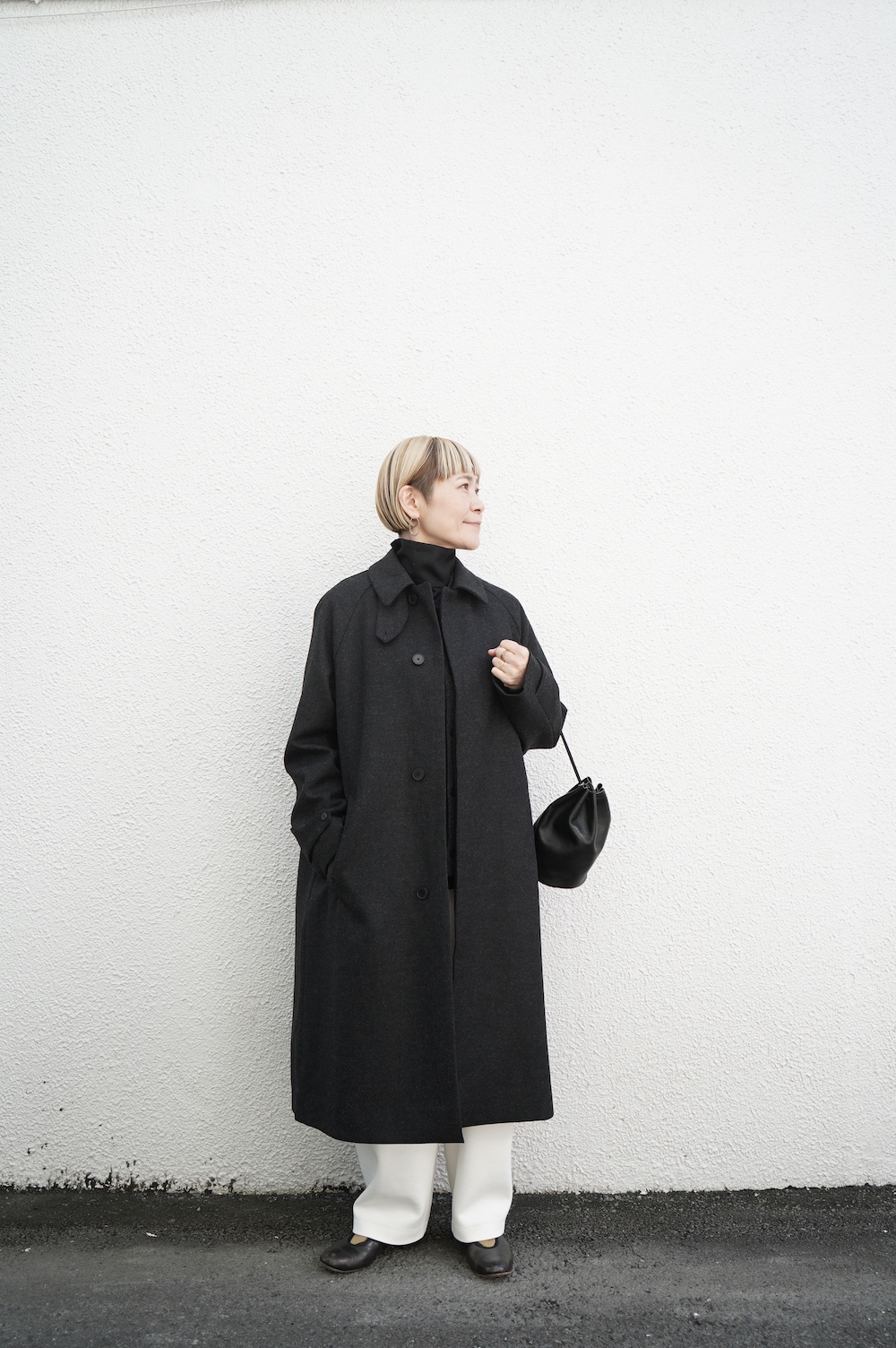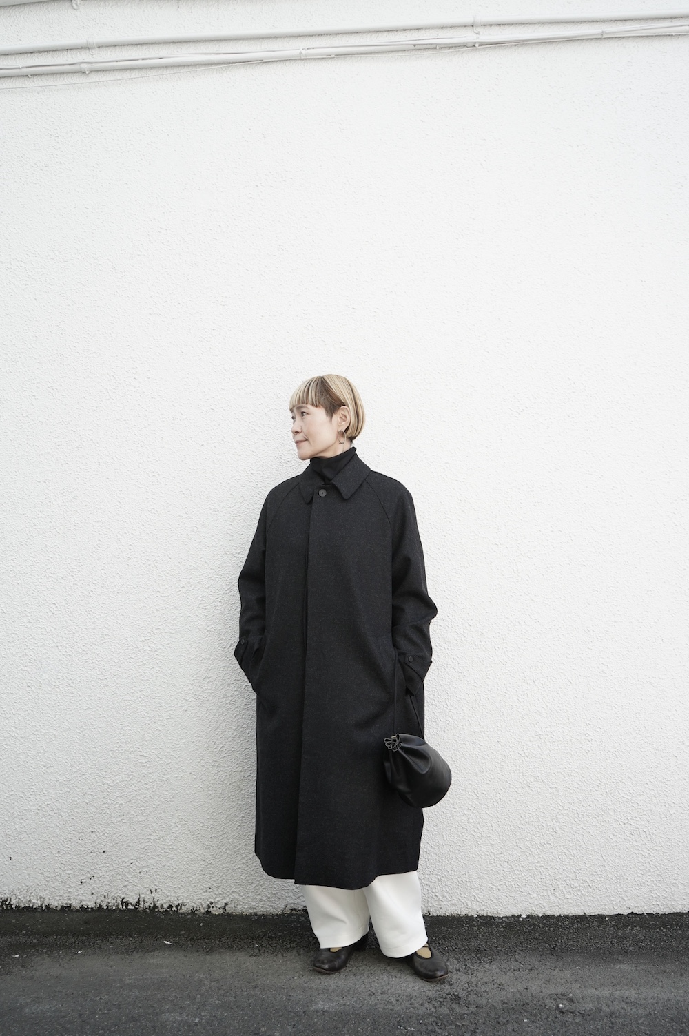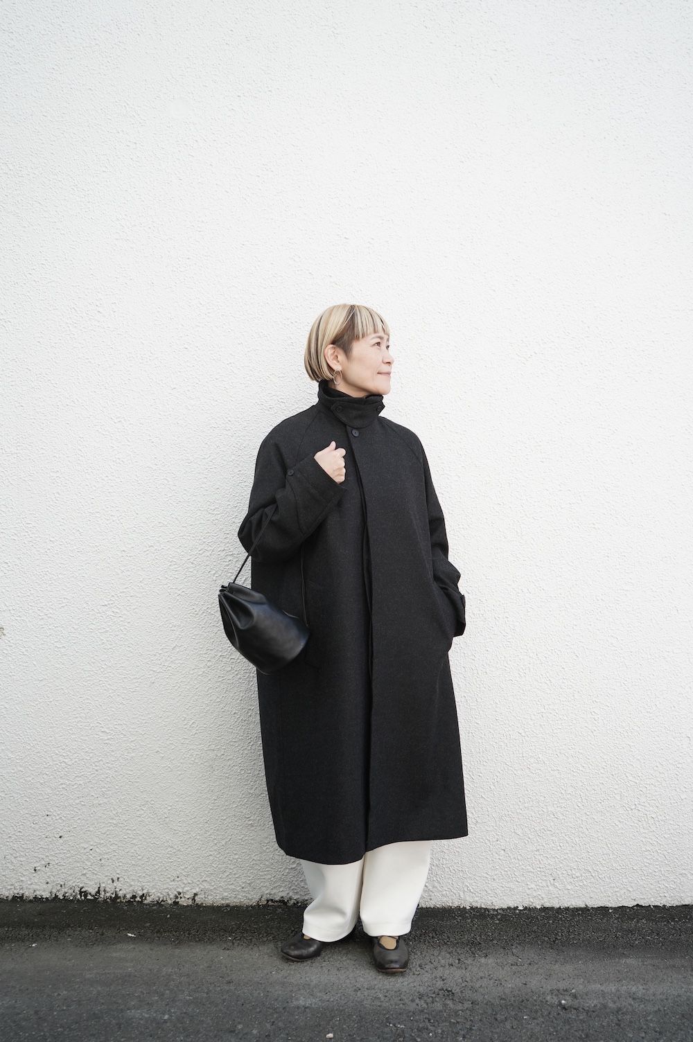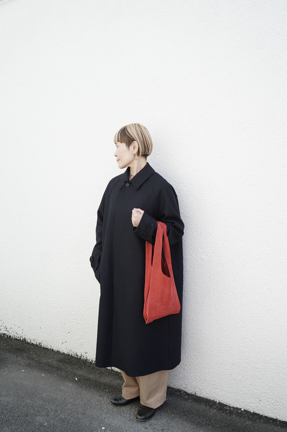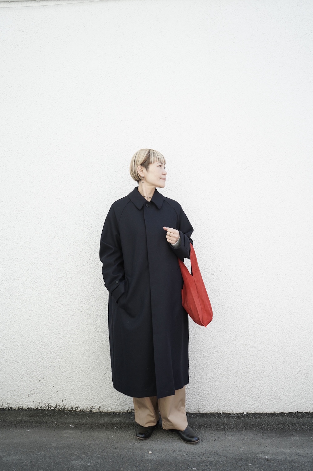 デザインは、スタンダードなデザインのステンカラーコート。身幅に程よくゆとりを持たせたシルエットで、ニットやジャケットの上からもすっと重ねられるバランスです。フロントは比翼仕立てですっきりとミニマルなデザイン。袖はラグランで肩にダーツが入っているので動きやすく、素材の軽さも相まって軽やかな着心地。身頃の内側にチンストラップが装着されています。寒い日にはチンストタップを取り外し