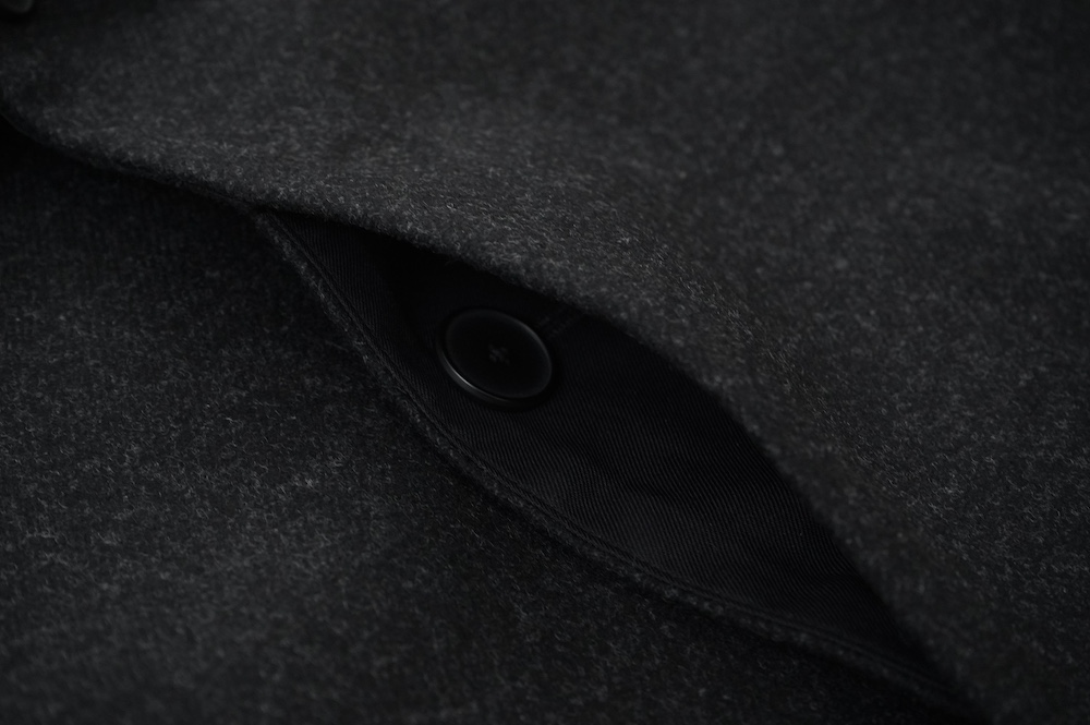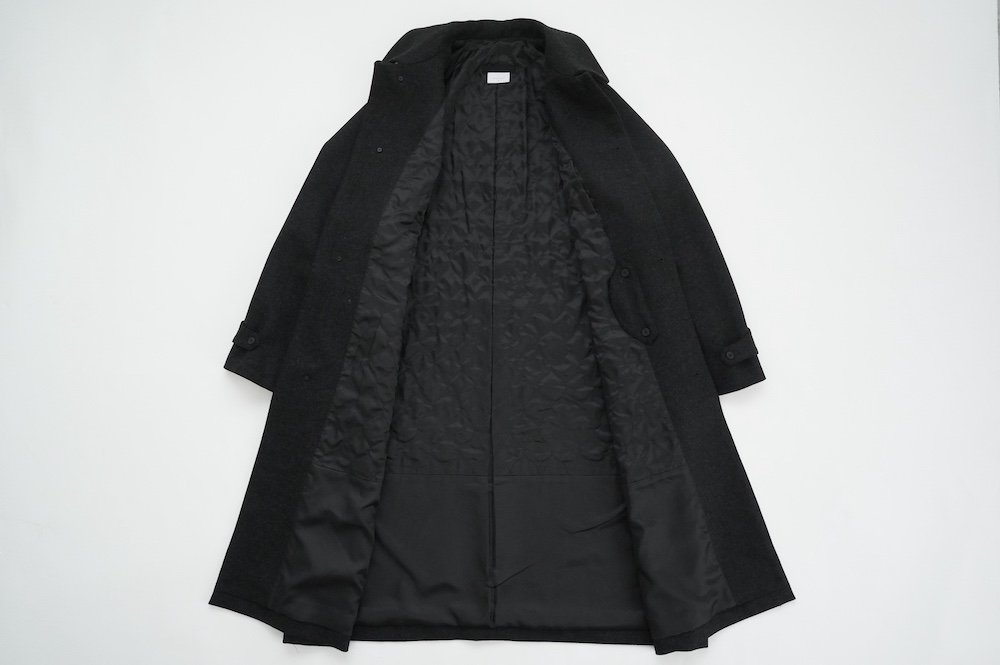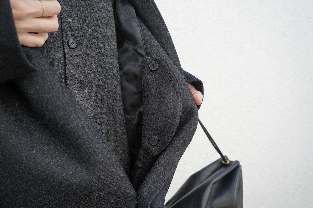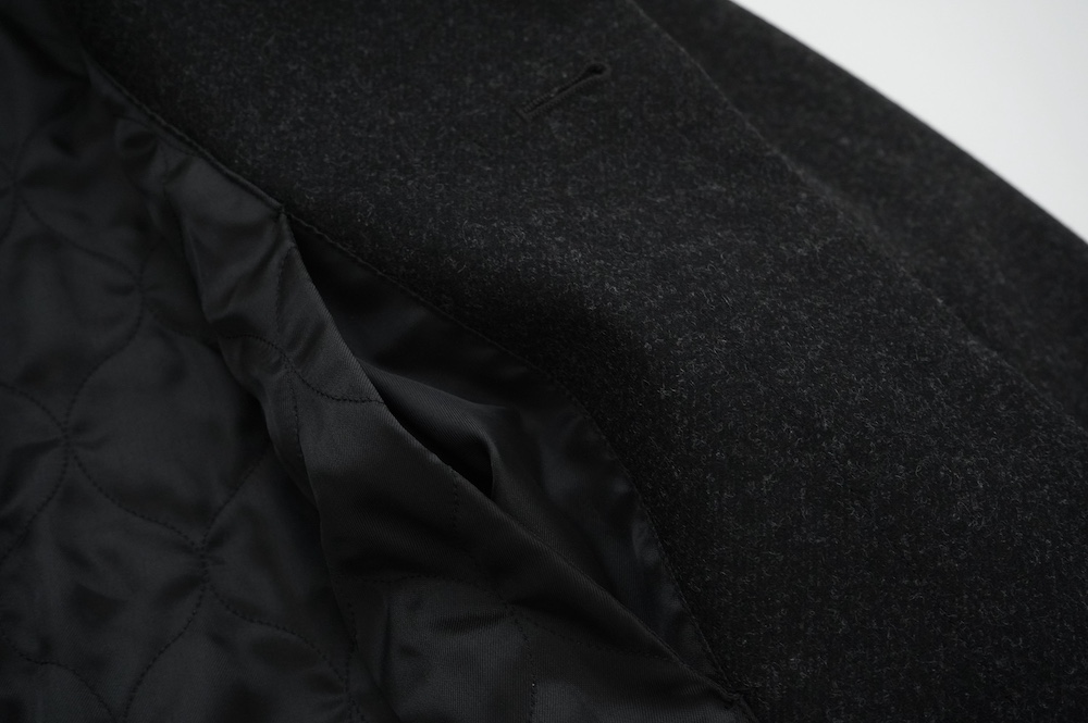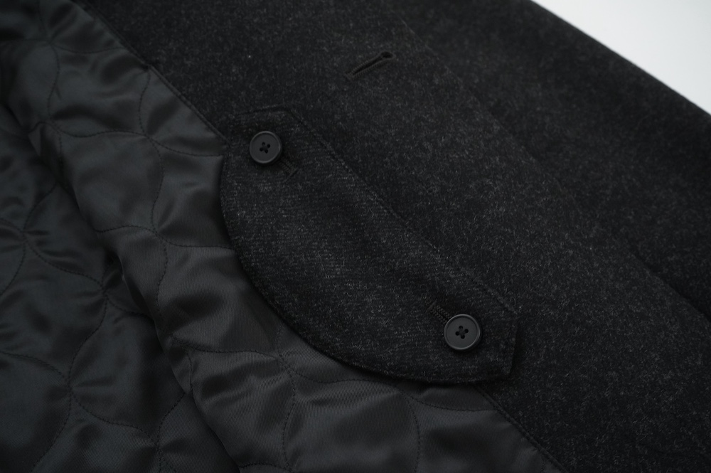 "ノーコントロールエアー"のコート。高密度なウールフラノ生地を使用。メルトン生地などよりも薄手で軽量な生地ですが、裏に芯地を貼ってボンディングしているので、しっかりとしたハリと防風効果を高めています。総裏地仕立てで、中生地に高機能コマサーモをキルティングに使用しているので、吸湿発熱効果と耐久制電性を併せ持つハイテク素材コートに仕上がっています。