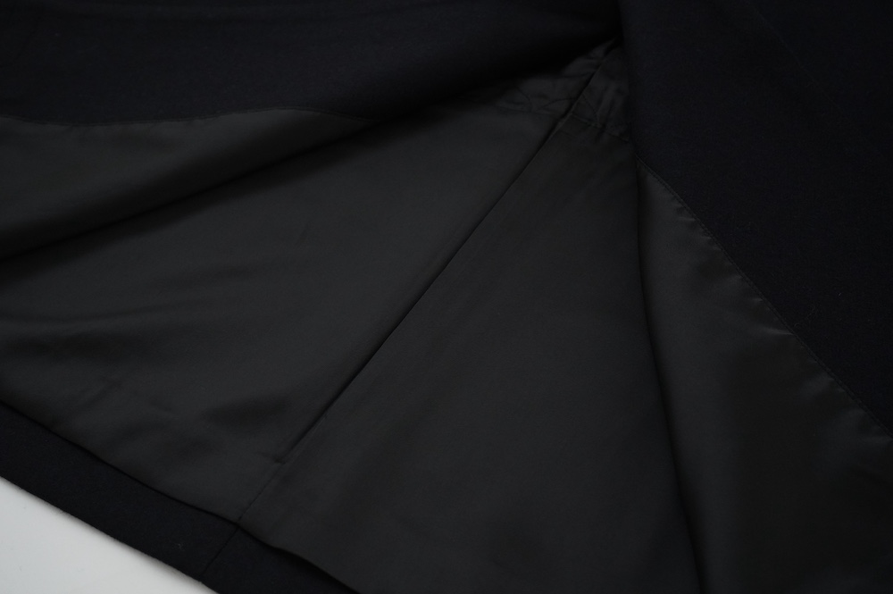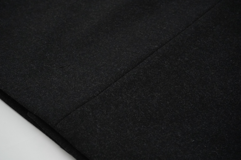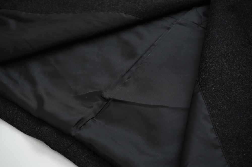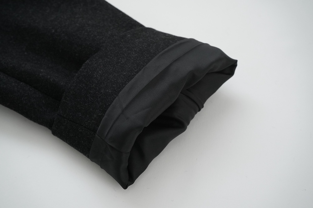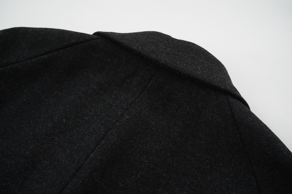 "ノーコントロールエアー"のコート。高密度なウールフラノ生地を使用。メルトン生地などよりも薄手で軽量な生地ですが、裏に芯地を貼ってボンディングしているので、しっかりとしたハリと防風効果を高めています。総裏地仕立てで、中生地に高機能コマサーモをキルティングに使用しているので、吸湿発熱効果と耐久制電性を併せ持つハイテク素材コートに仕上がっています。