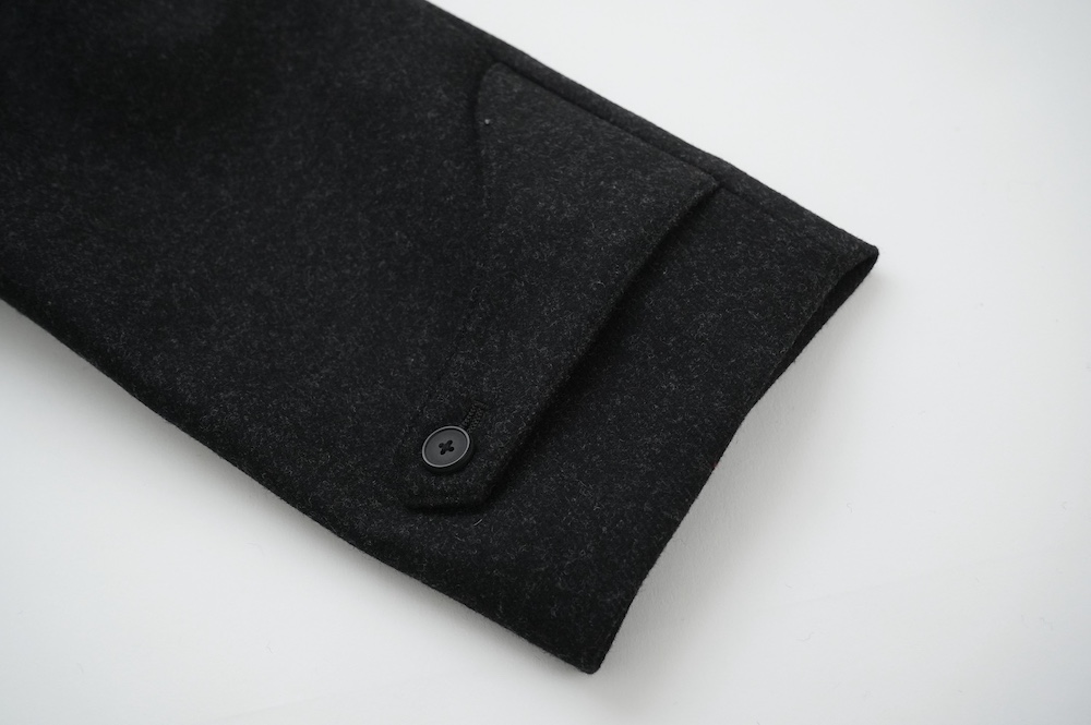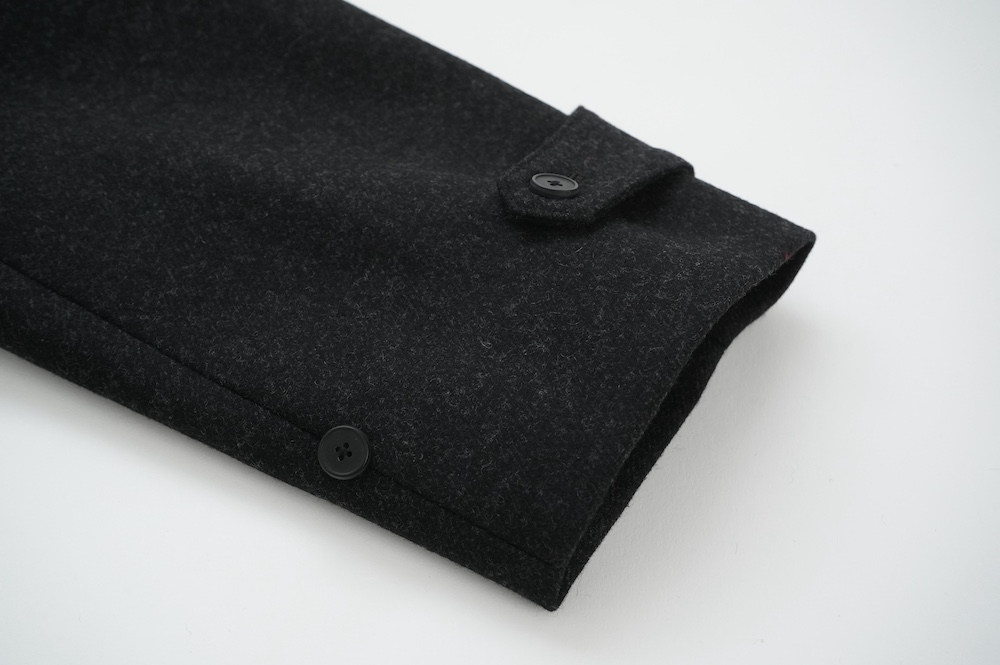 、襟を立てて留めれば防風性もアップ。袖口もタブがついているのでキュッと締めてこちらもが防風性アップ。防寒とともに見た目の印象の変化を楽しめます。カジュアルにも綺麗めなスタイルにも使える万能なコートです。