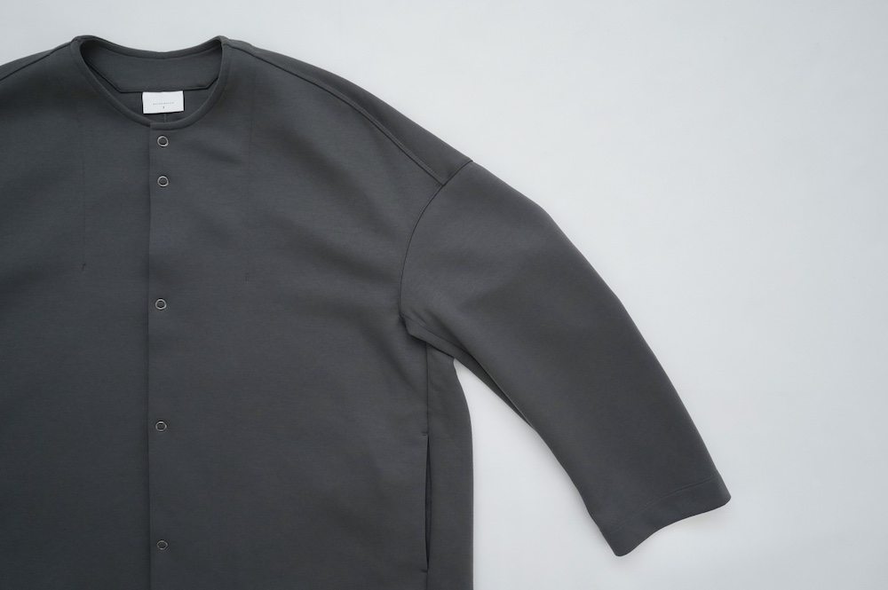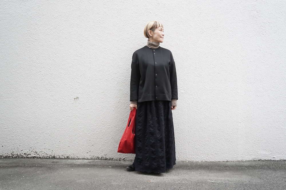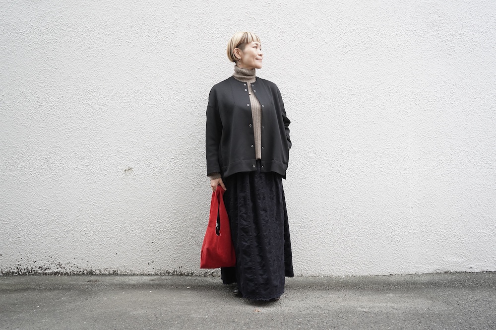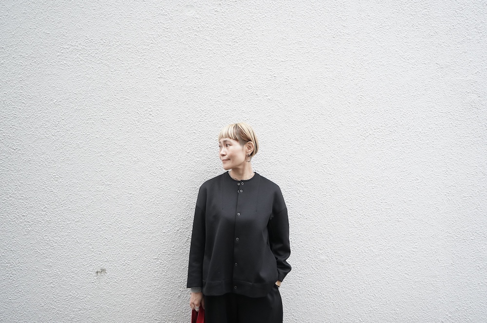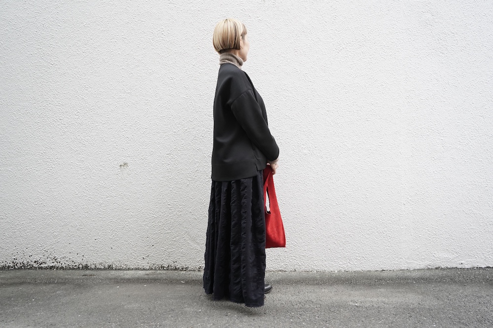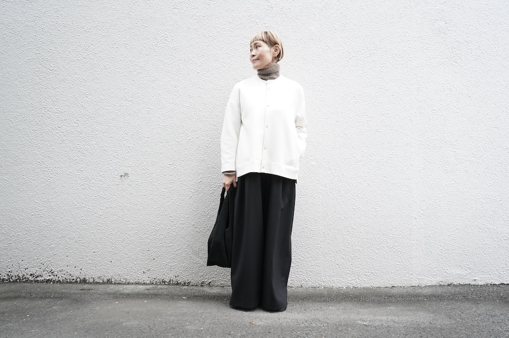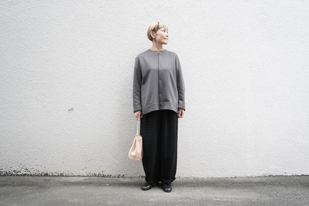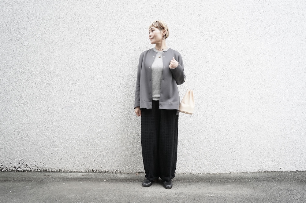 デザインはオーバーサイズのクルーネックのカーディガン。身幅にゆとりのあるオーバーサイズで、ドロップショルダーに袖は二枚袖になっているので立体感があります。脇にはシームポケットもついており、ジャケットのようにも着ていただけます。着丈は前後差があり、後ろが少し長くなっていますが脇にスリットもありバランスが取りやすい。同素材のパンツと合わせてセットアップも素敵です。ニットの代わりに、またジャケットのようにお使いもいただける、シンプルさが魅力です。