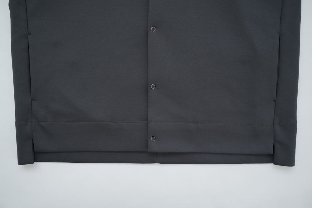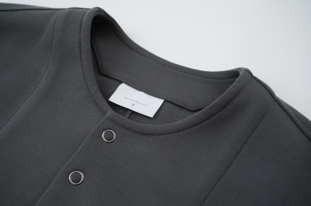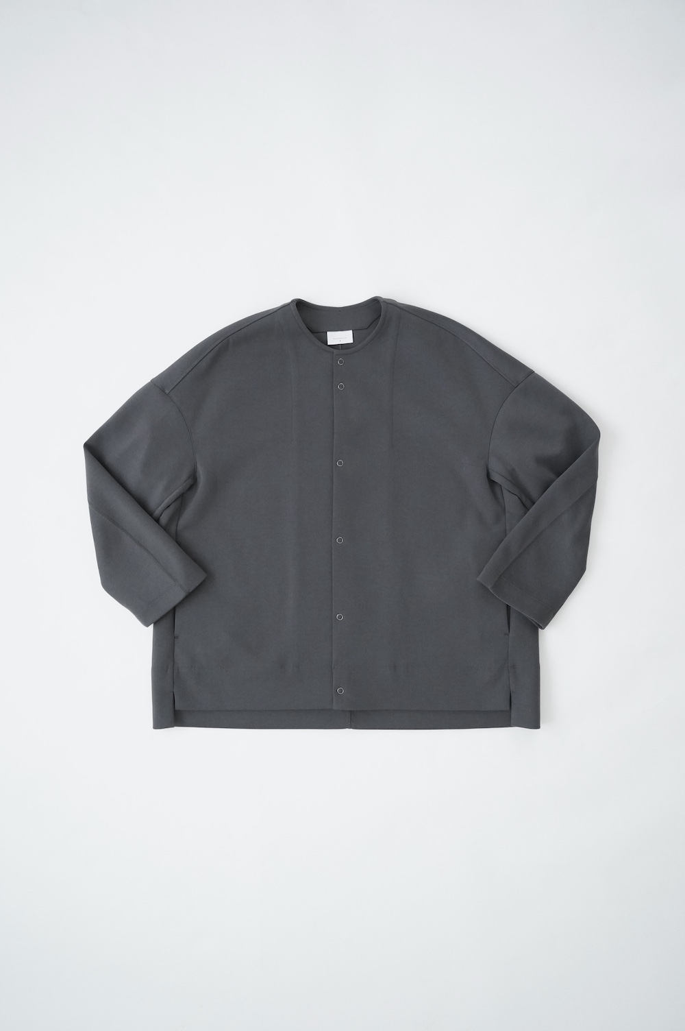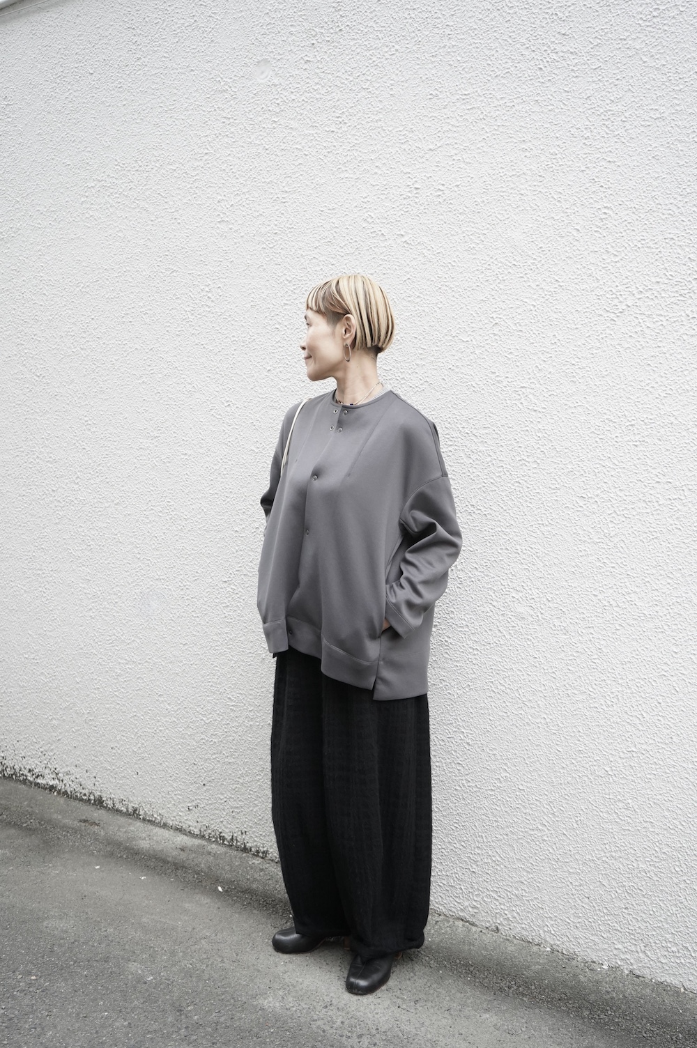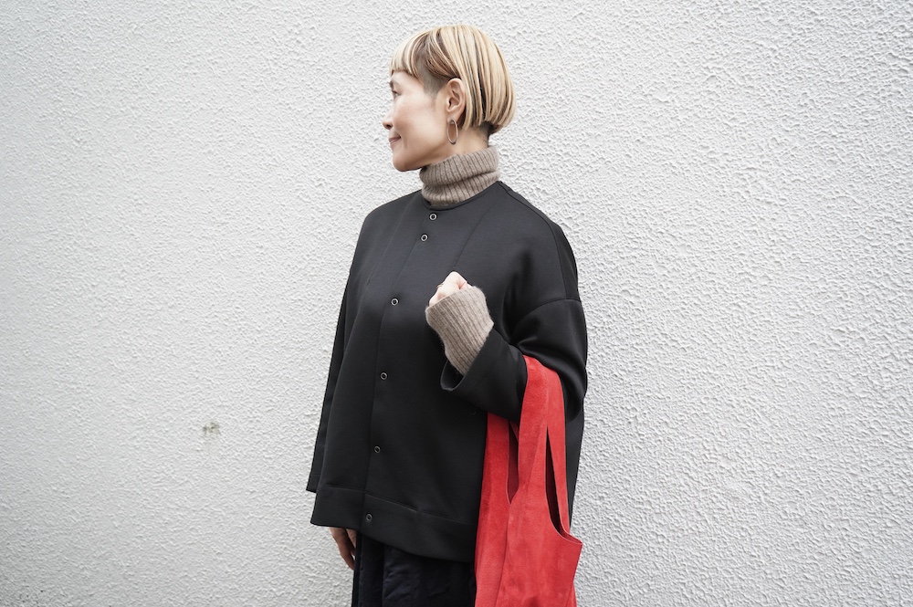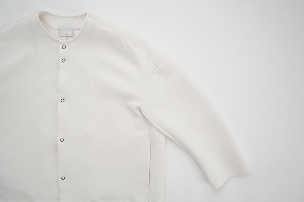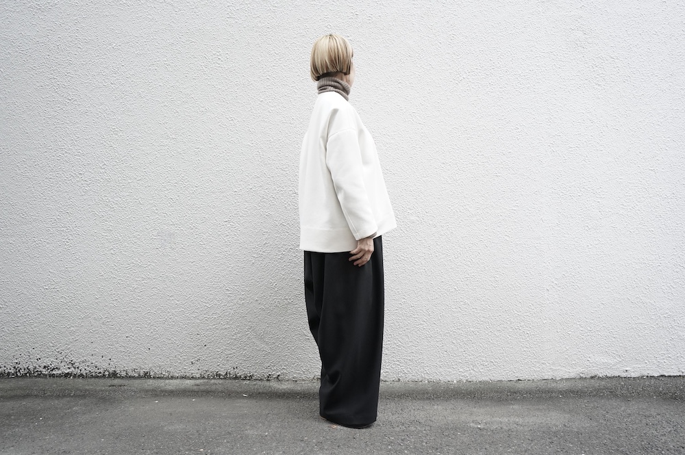 デザインはオーバーサイズのクルーネックのカーディガン。身幅にゆとりのあるオーバーサイズで、ドロップショルダーに袖は二枚袖になっているので立体感があります。脇にはシームポケットもついており、ジャケットのようにも着ていただけます。着丈は前後差があり、後ろが少し長くなっていますが脇にスリットもありバランスが取りやすい。同素材のパンツと合わせてセットアップも素敵です。ニットの代わりに、またジャケットのようにお使いもいただける、シンプルさが魅力です。