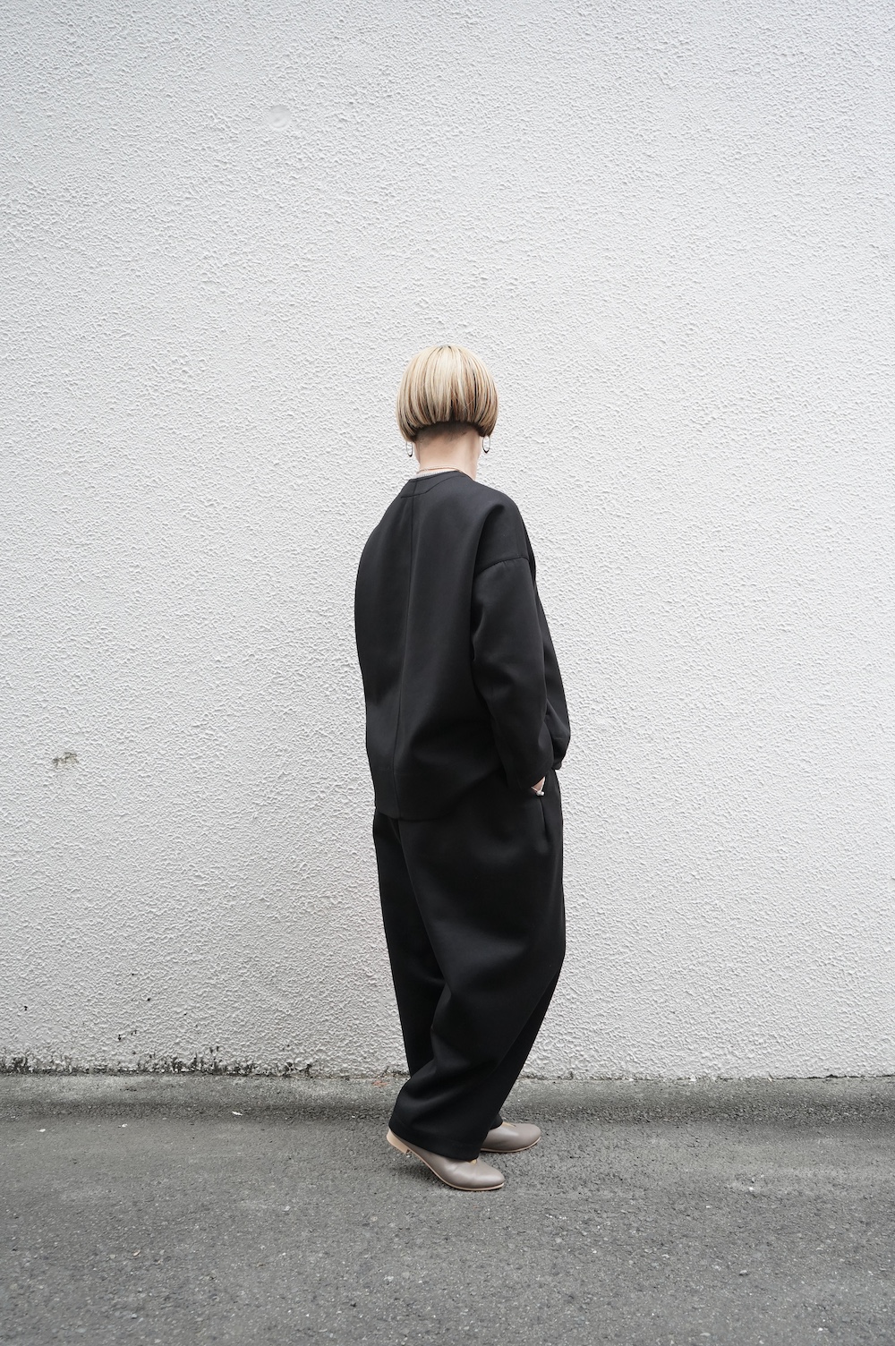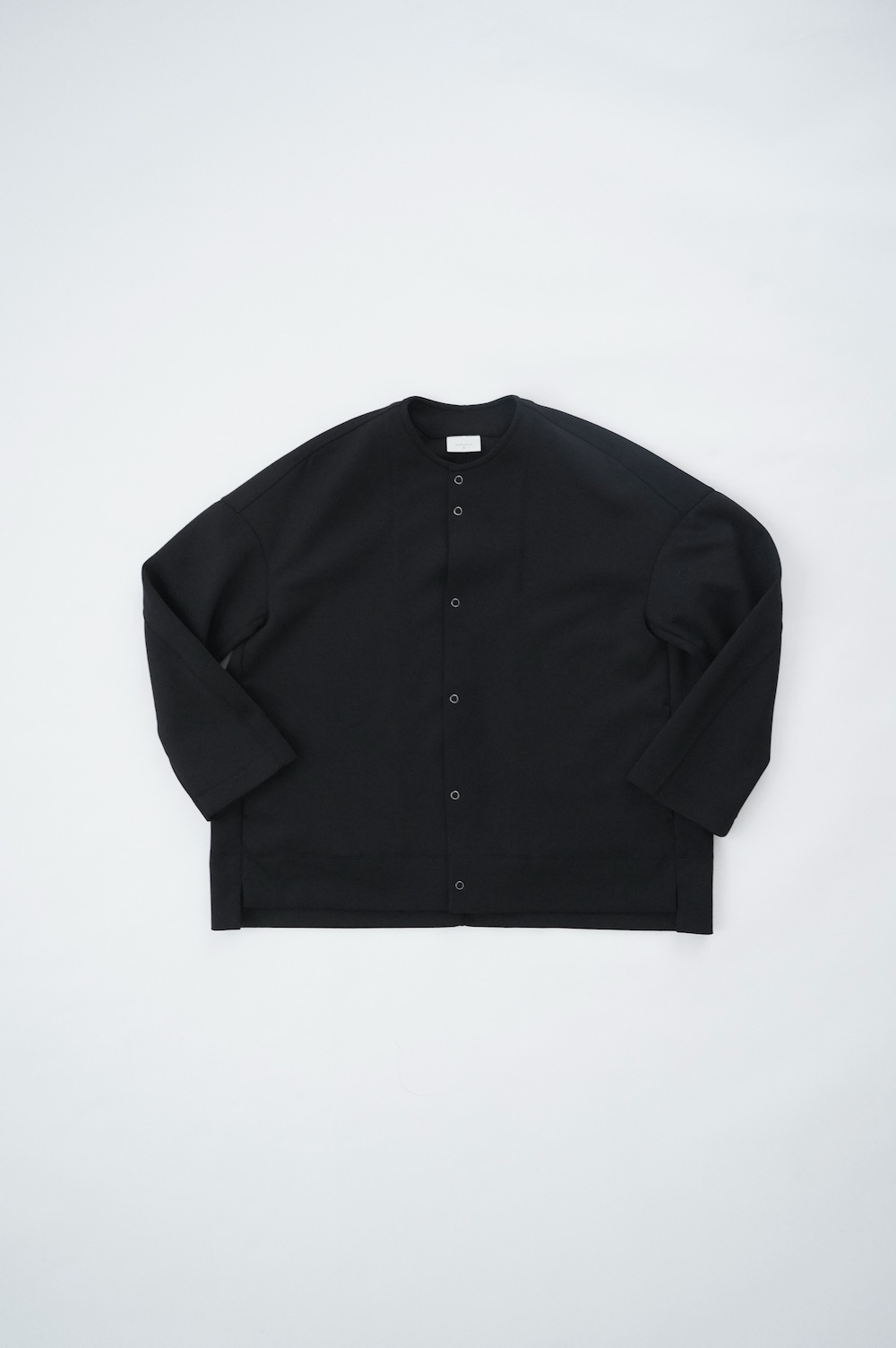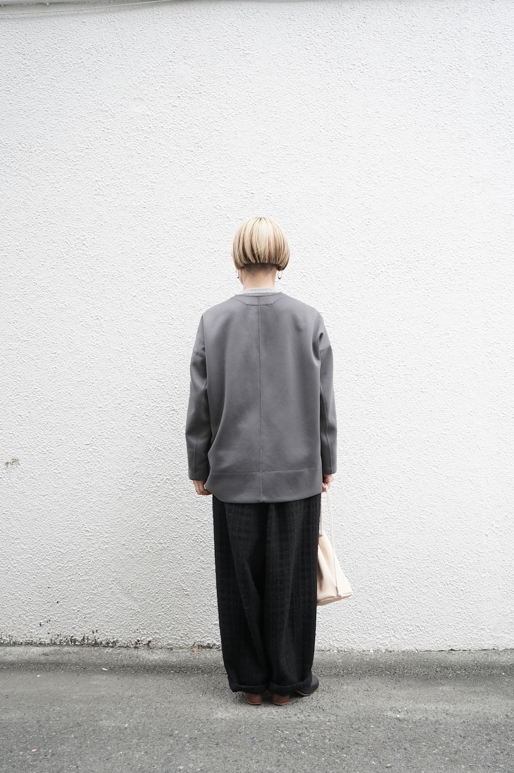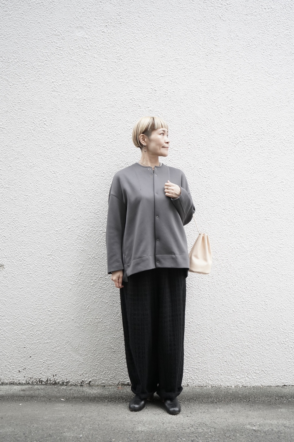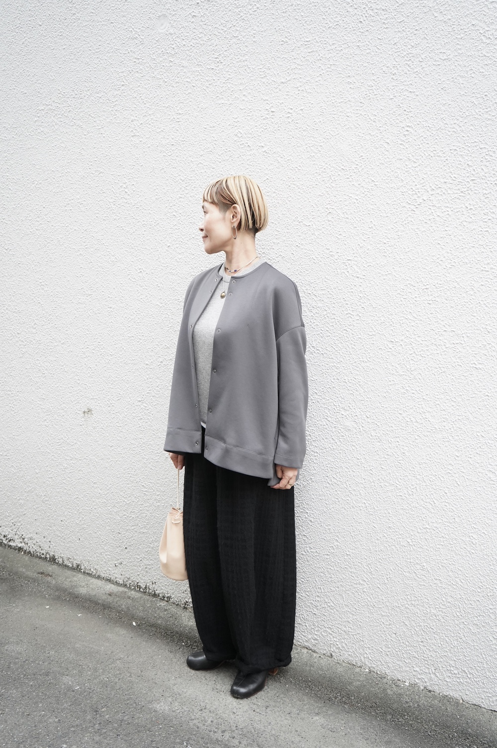 デザインはオーバーサイズのクルーネックのカーディガン。身幅にゆとりのあるオーバーサイズで、ドロップショルダーに袖は二枚袖になっているので立体感があります。脇にはシームポケットもついており、ジャケットのようにも着ていただけます。着丈は前後差があり、後ろが少し長くなっていますが脇にスリットもありバランスが取りやすい。同素材のパンツと合わせてセットアップも素敵です。ニットの代わりに、またジャケットのようにお使いもいただける、シンプルさが魅力です。