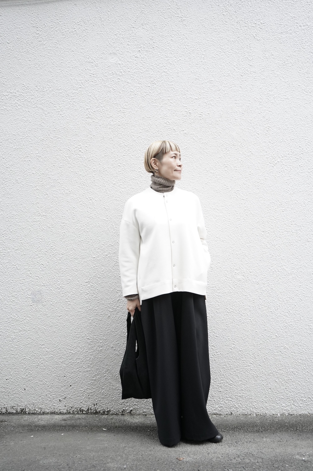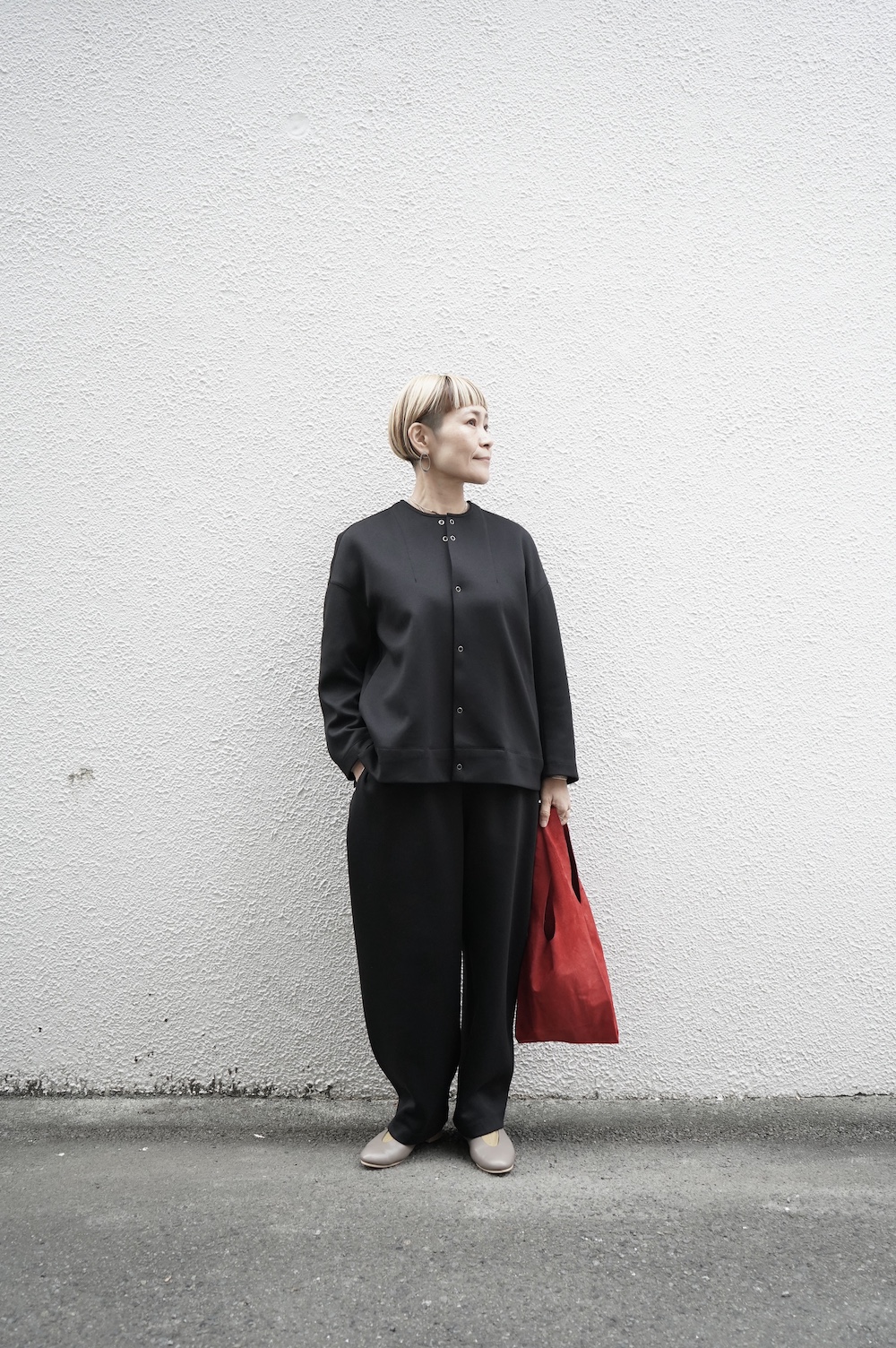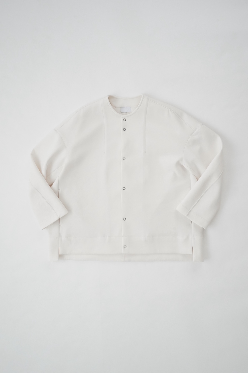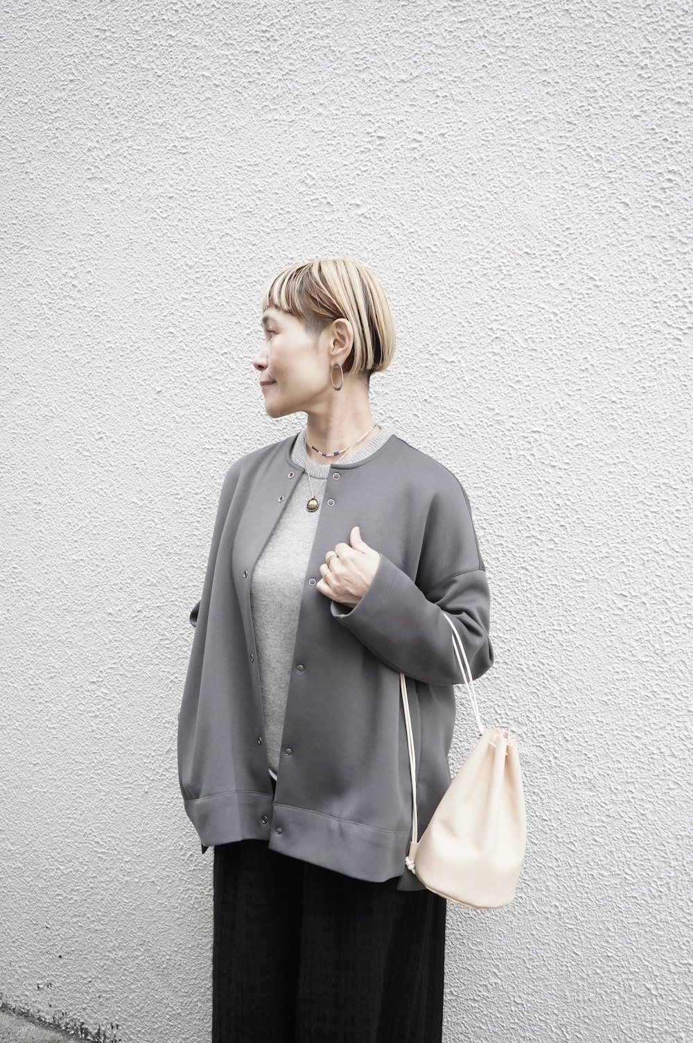 デザインはオーバーサイズのクルーネックのカーディガン。身幅にゆとりのあるオーバーサイズで、ドロップショルダーに袖は二枚袖になっているので立体感があります。脇にはシームポケットもついており、ジャケットのようにも着ていただけます。着丈は前後差があり、後ろが少し長くなっていますが脇にスリットもありバランスが取りやすい。同素材のパンツと合わせてセットアップも素敵です。ニットの代わりに、またジャケットのようにお使いもいただける、シンプルさが魅力です。