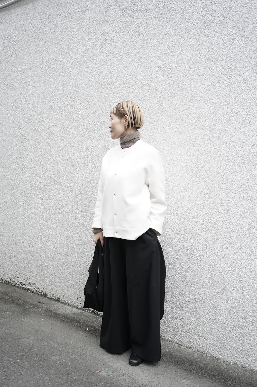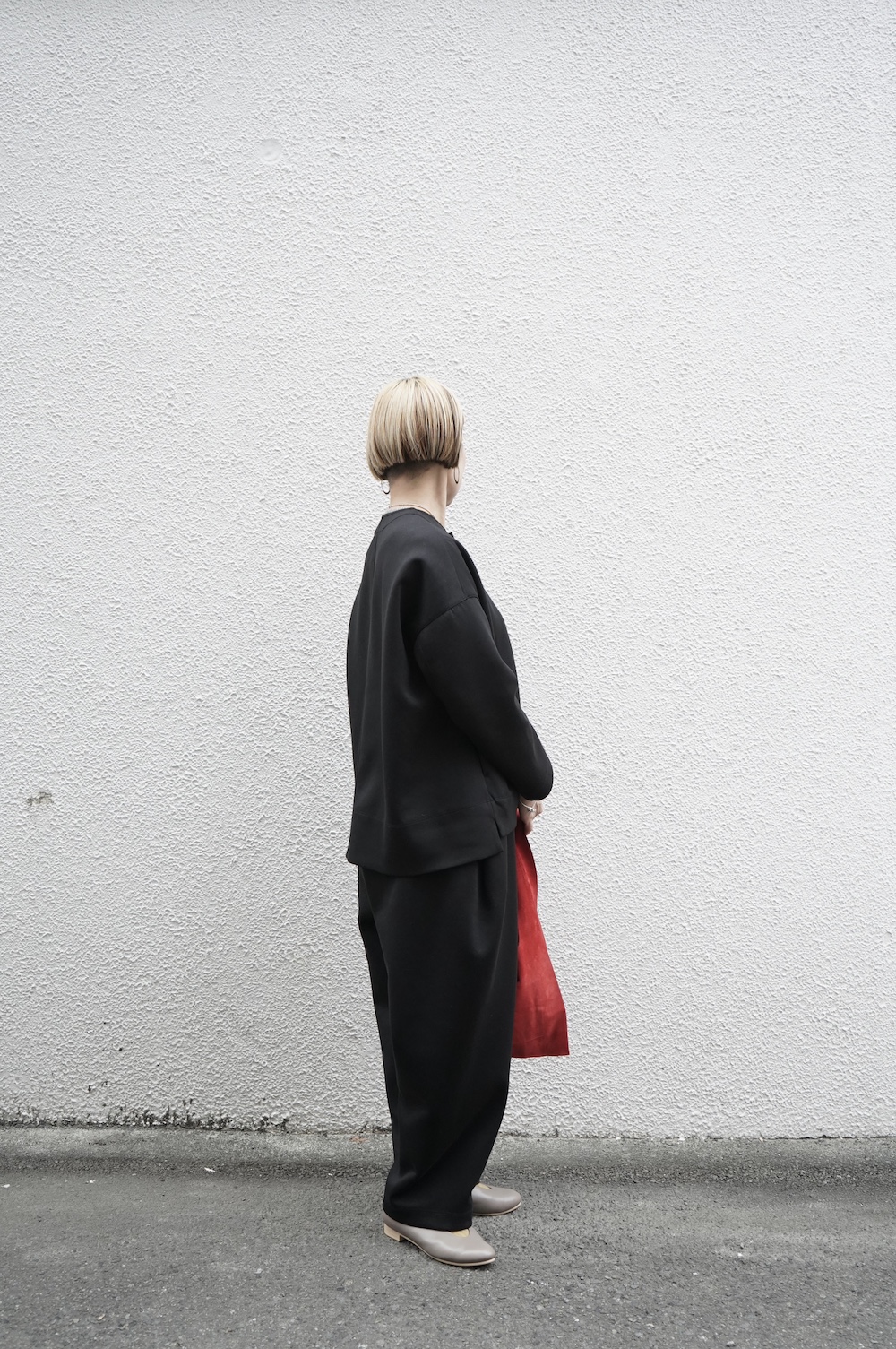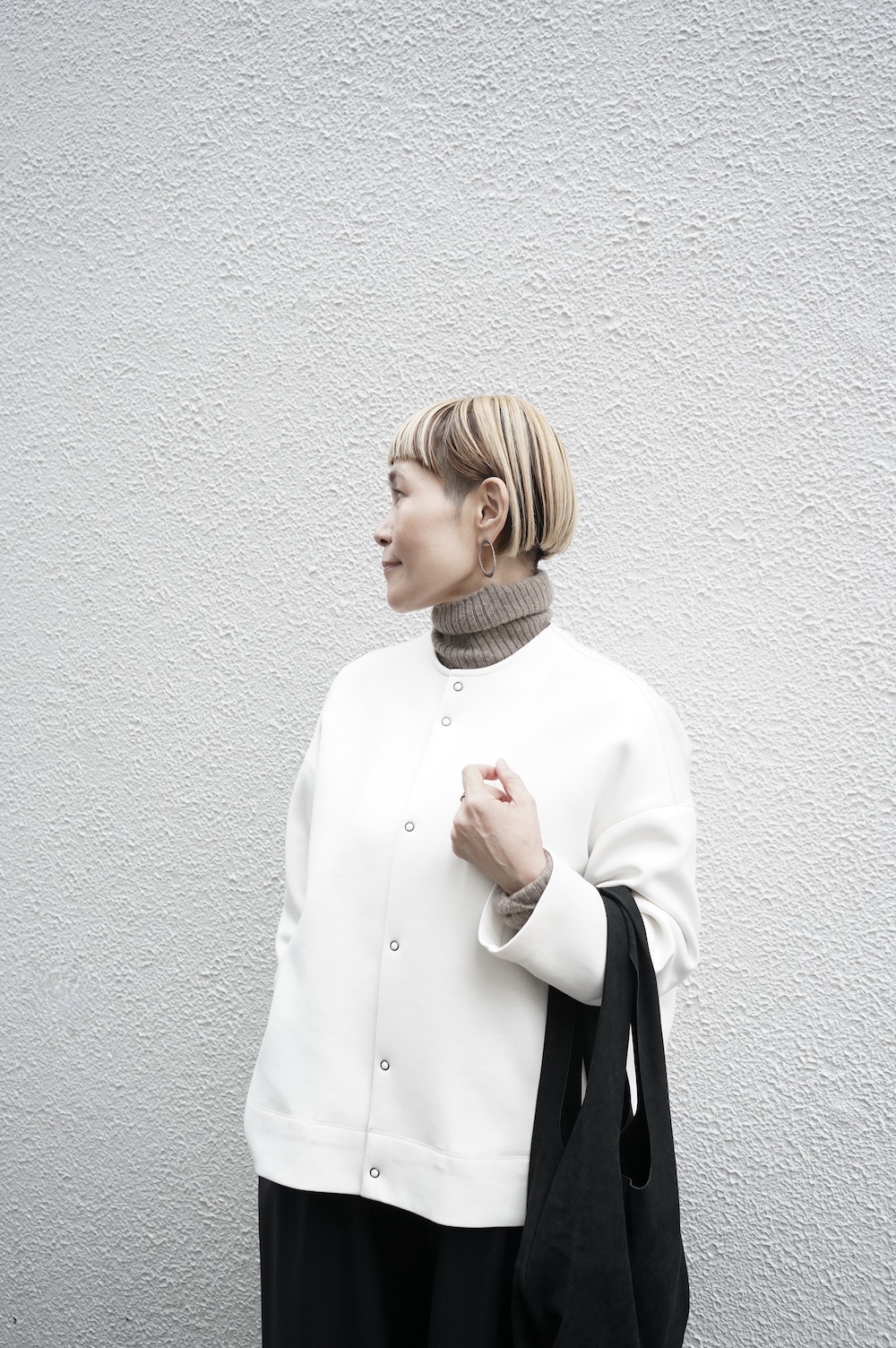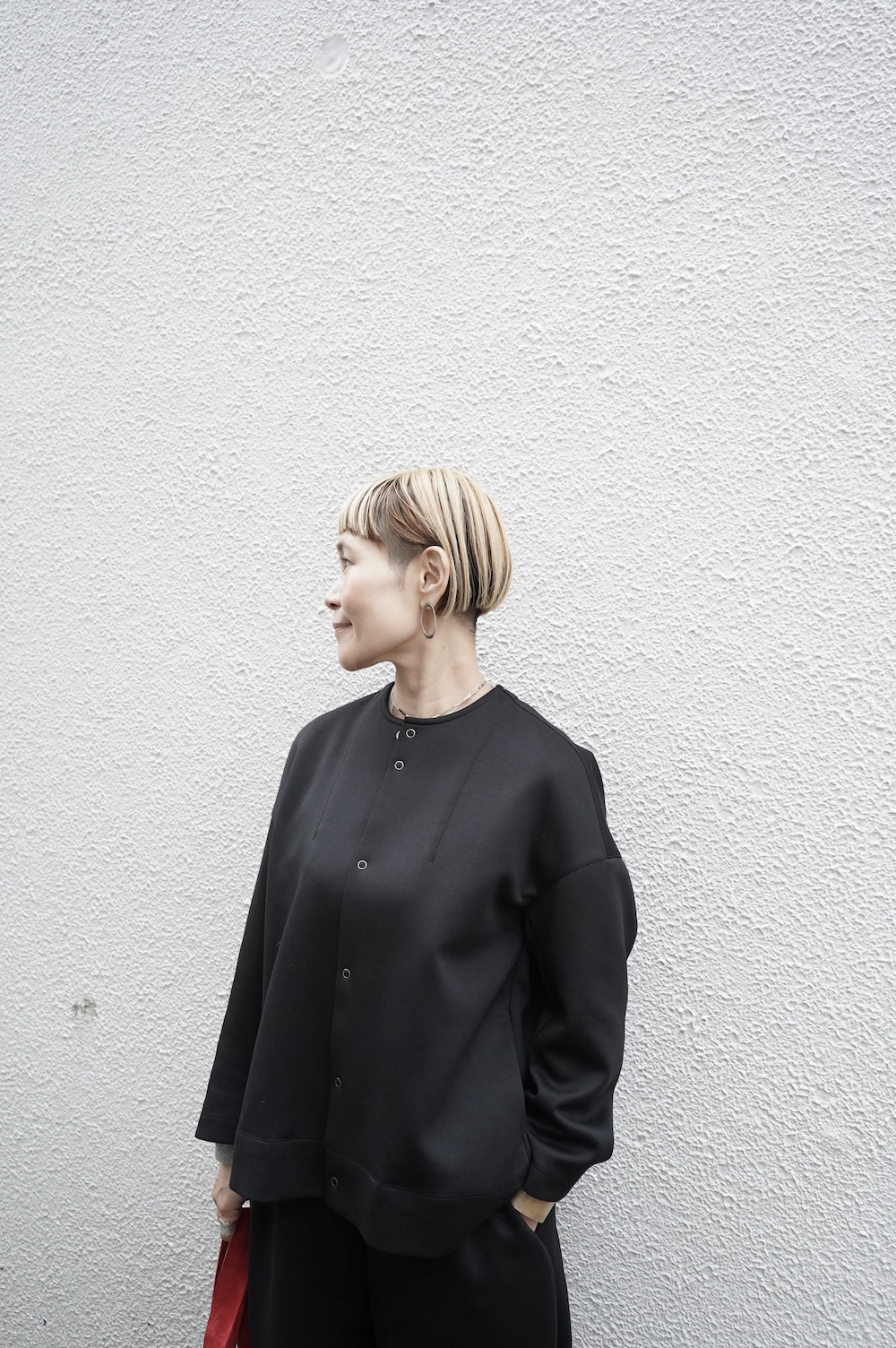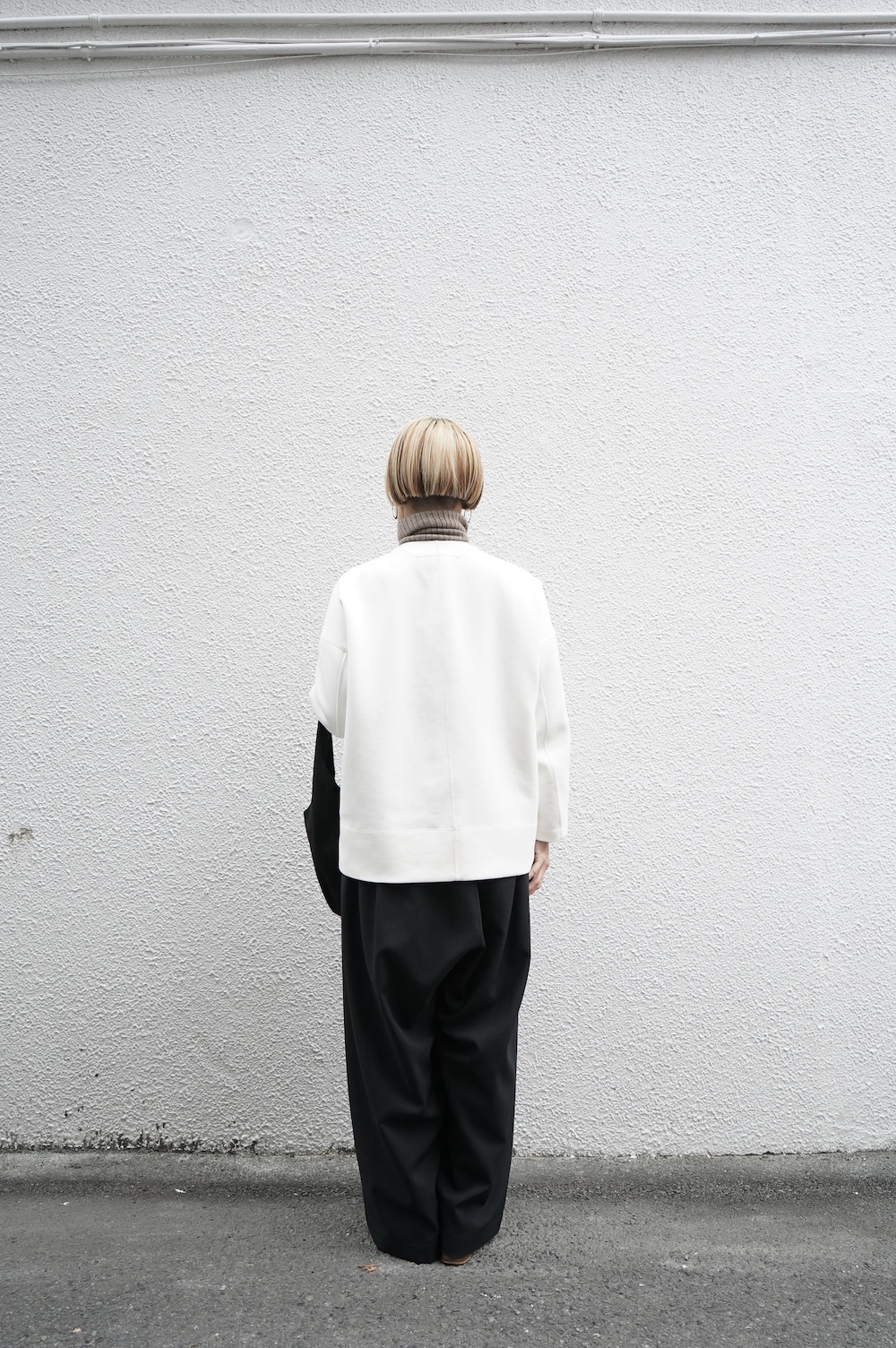 デザインはオーバーサイズのクルーネックのカーディガン。身幅にゆとりのあるオーバーサイズで、ドロップショルダーに袖は二枚袖になっているので立体感があります。脇にはシームポケットもついており、ジャケットのようにも着ていただけます。着丈は前後差があり、後ろが少し長くなっていますが脇にスリットもありバランスが取りやすい。同素材のパンツと合わせてセットアップも素敵です。ニットの代わりに、またジャケットのようにお使いもいただける、シンプルさが魅力です。