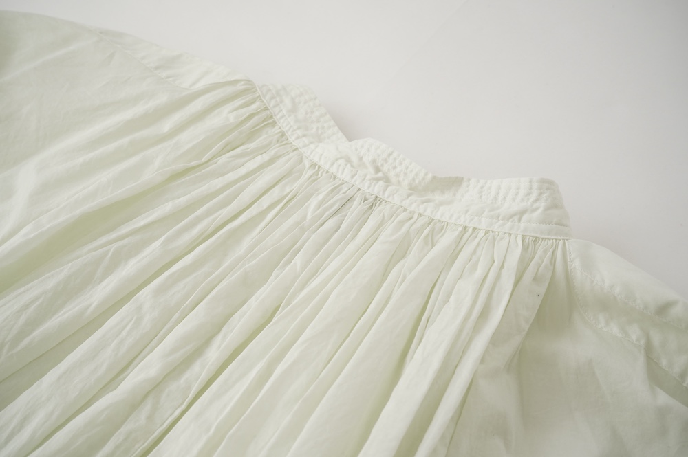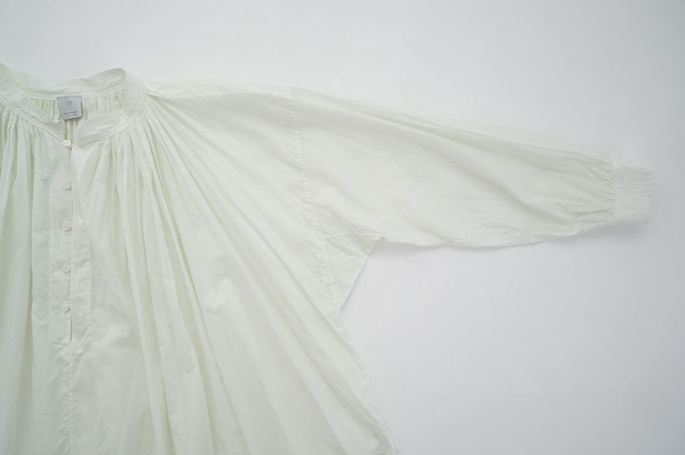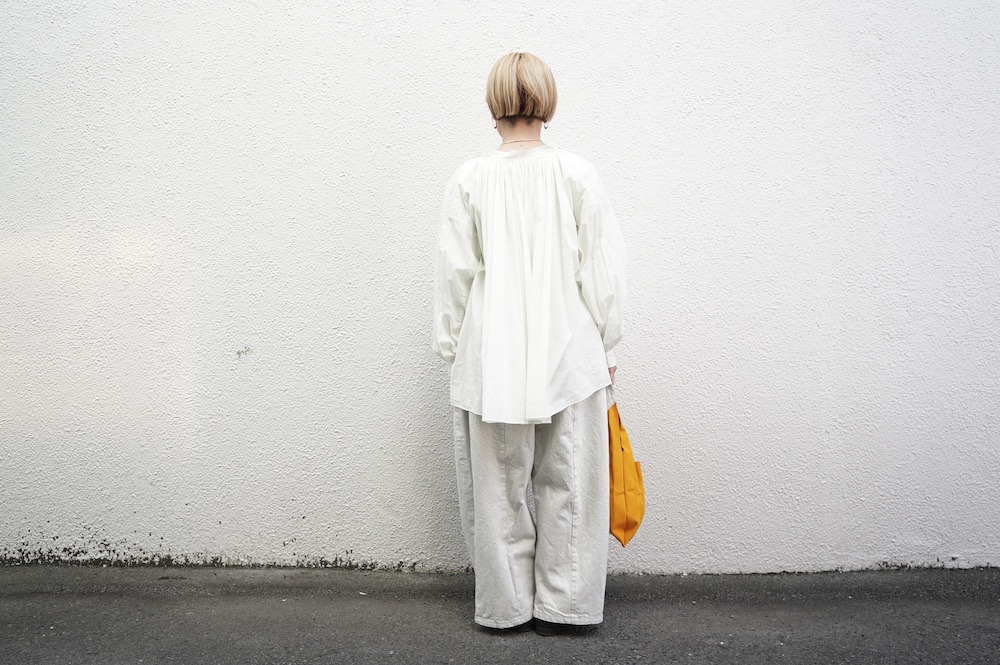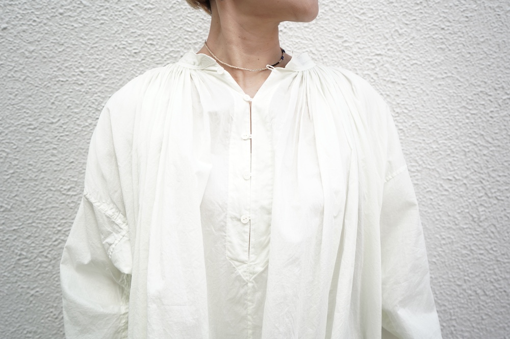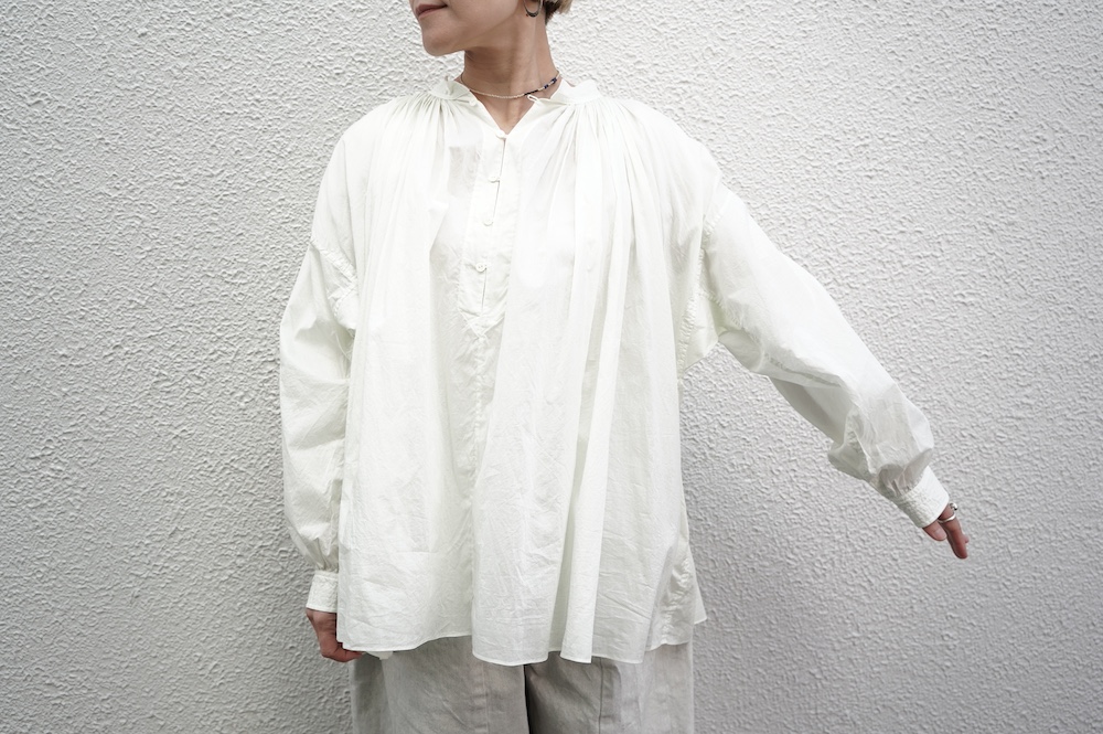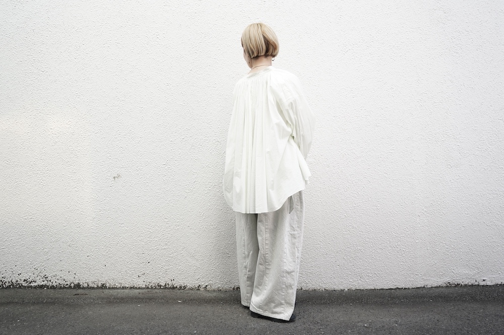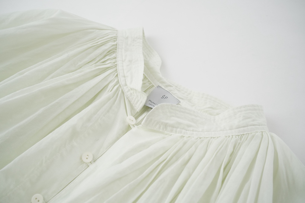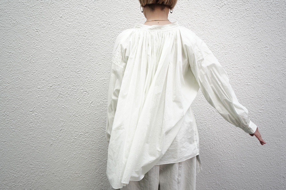 デザインはエッシュペーの繊細な縫製の指標になった定番シリーズ。19世紀の教会のスモックを基に現代でも着やすく生活に馴染むように設計されたブラウスです。たっぷりとした身幅にネック周りや袖、背中の細やかなギャザーは生地の上質さを際立たせてくれます。ふんわりとしたシルエットですが、生地感も相まって甘くなりすぎない。思わずクルッと回りたくなってしまう日常がランクアップするような気分の上がるブラウスです。