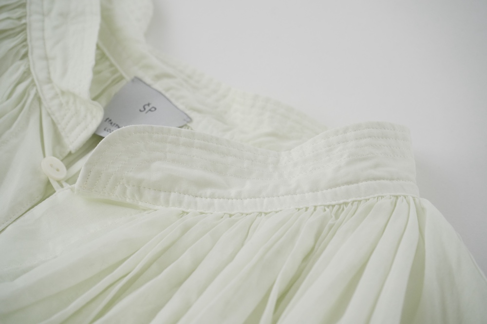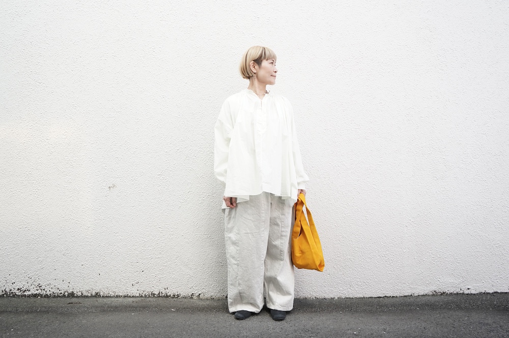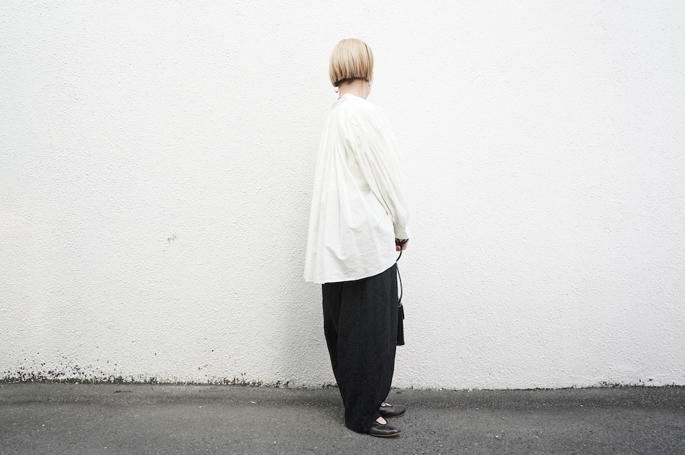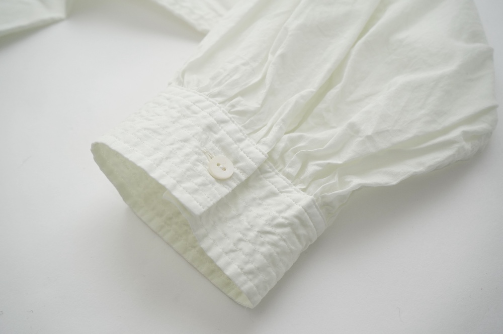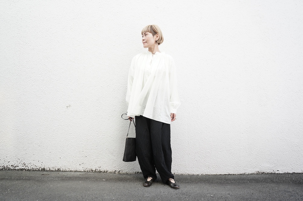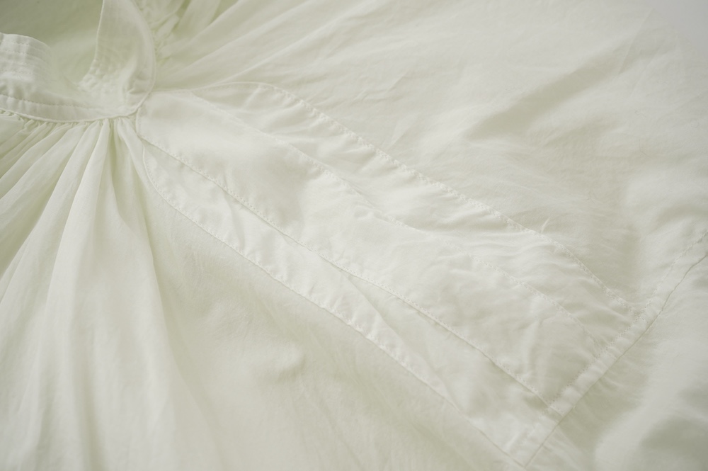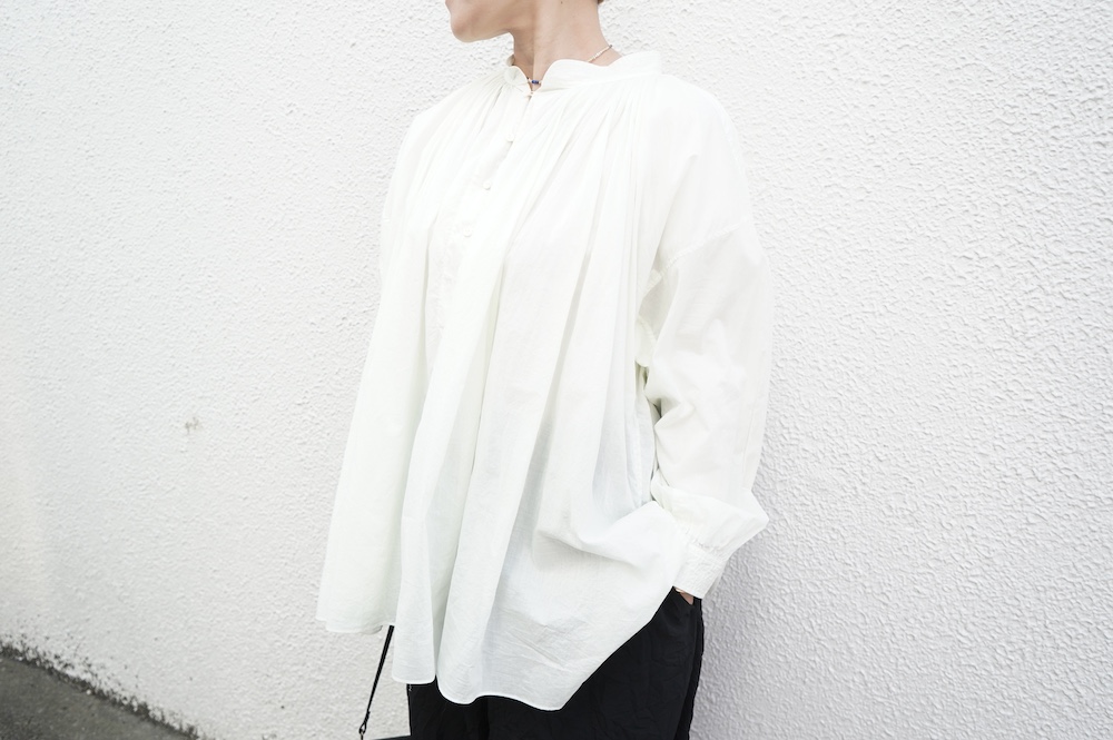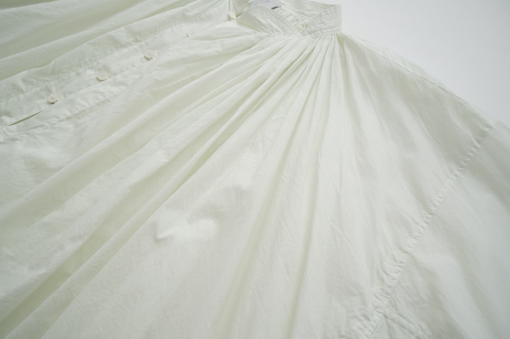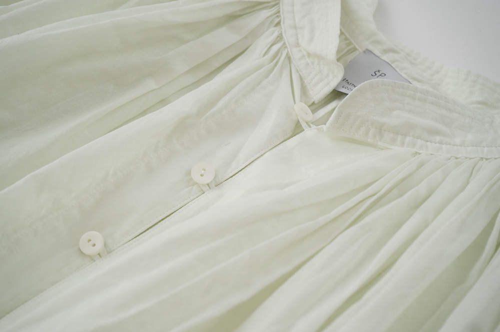デザインはエッシュペーの繊細な縫製の指標になった定番シリーズ。19世紀の教会のスモックを基に現代でも着やすく生活に馴染むように設計されたブラウスです。たっぷりとした身幅にネック周りや袖、背中の細やかなギャザーは生地の上質さを際立たせてくれます。ふんわりとしたシルエットですが、生地感も相まって甘くなりすぎない。思わずクルッと回りたくなってしまう日常がランクアップするような気分の上がるブラウスです。