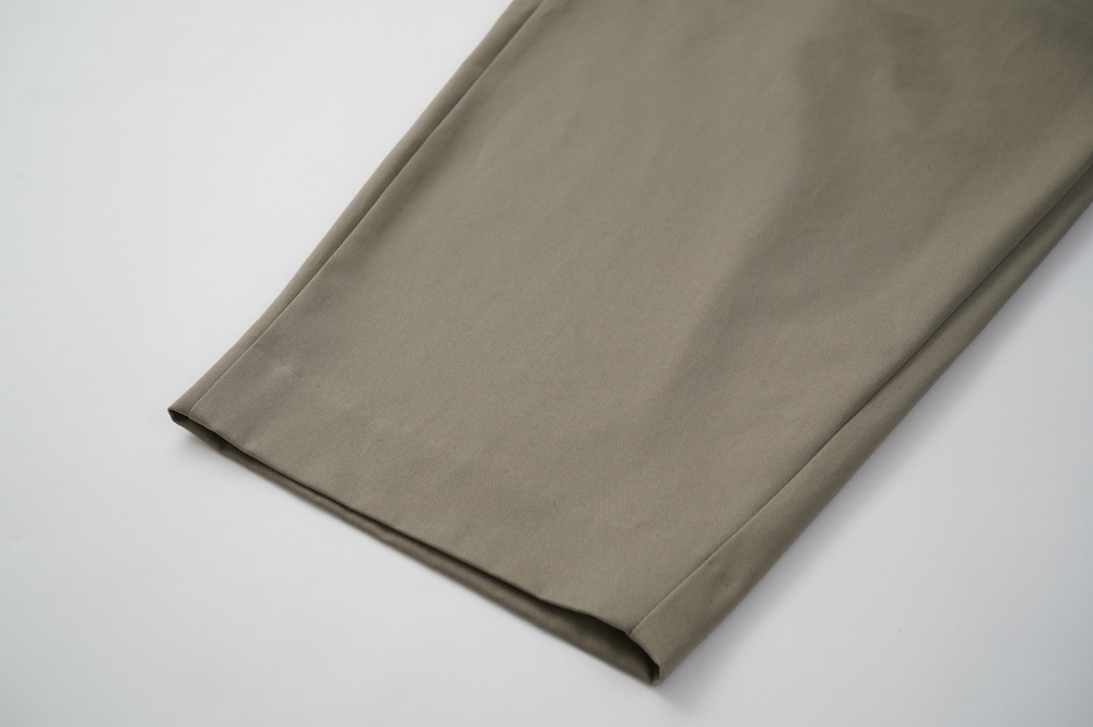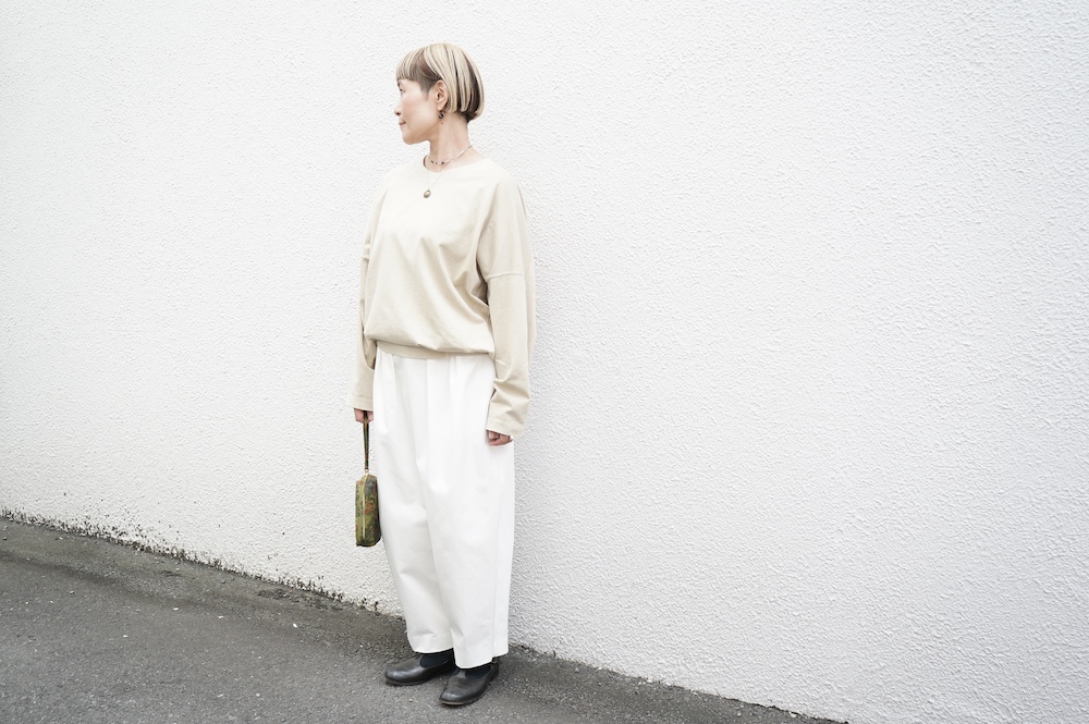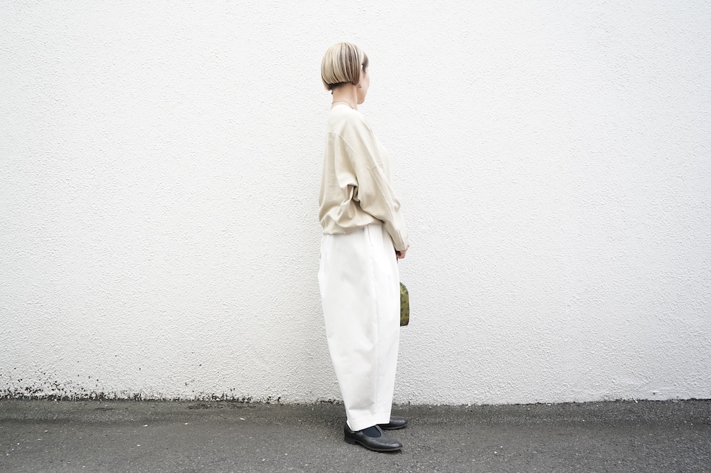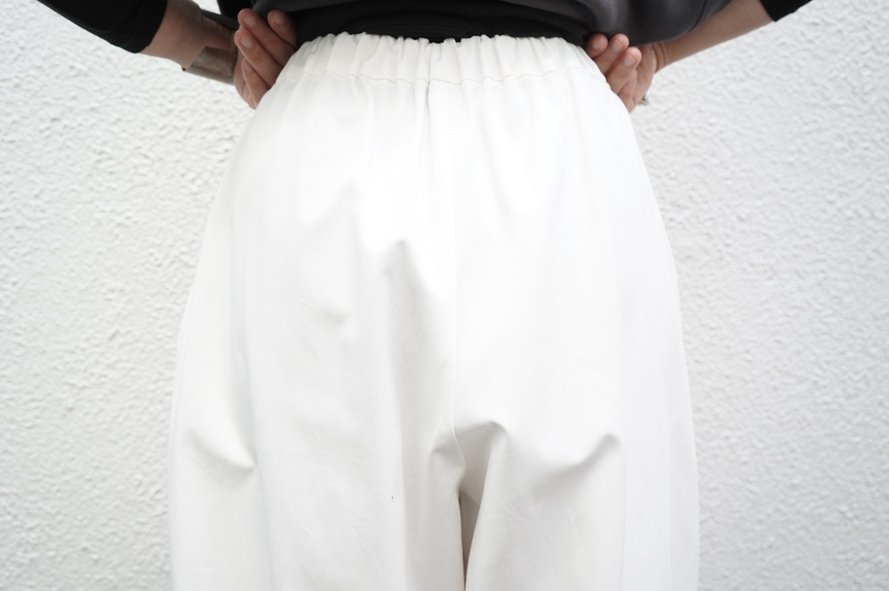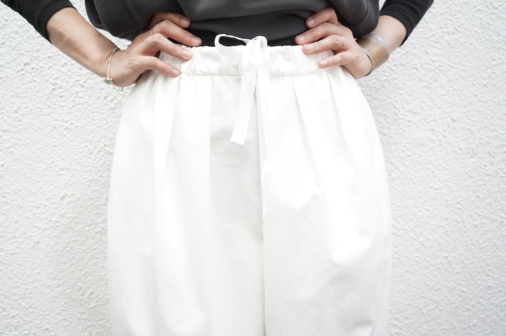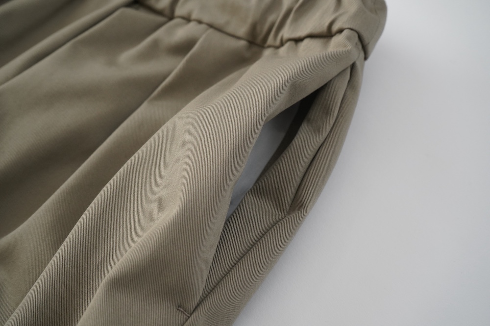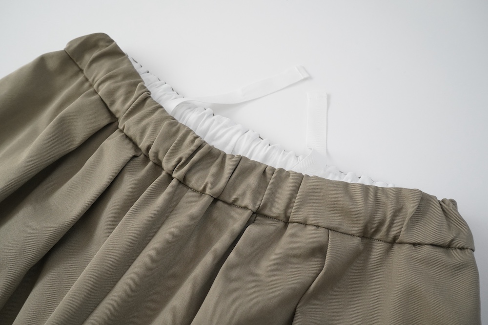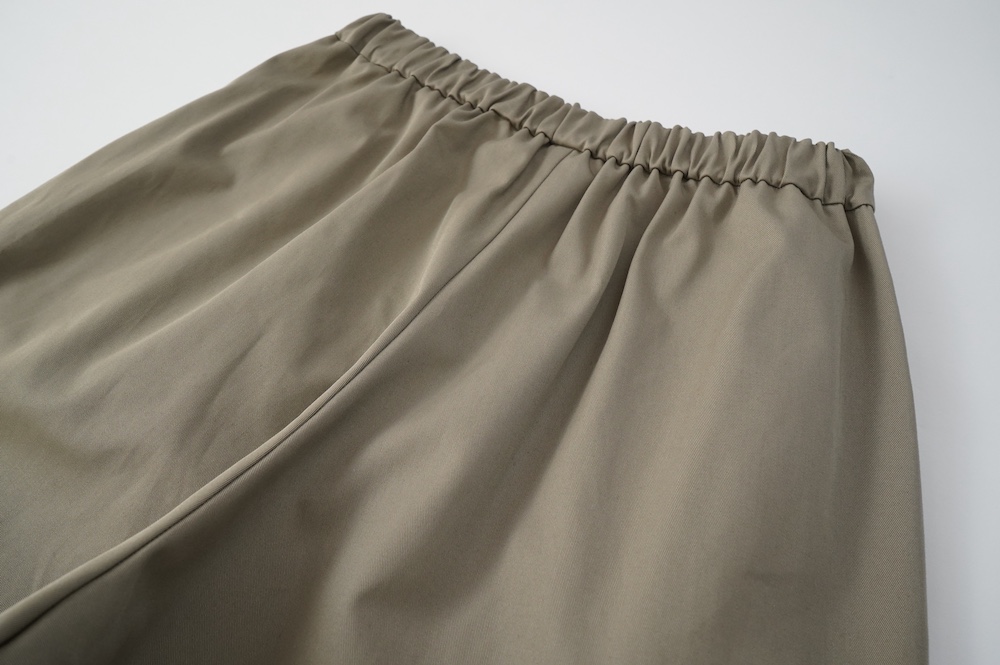 デザインはフロントに2タックが入ったテーパードシルエットのデザイン。脇に少しカーブをつけて、尖りすぎていない丸みのあるシルエットです。ウエストはゴムと紐で、イージーパンツということを感じさせない、すっきりとしたウエスト周りです。