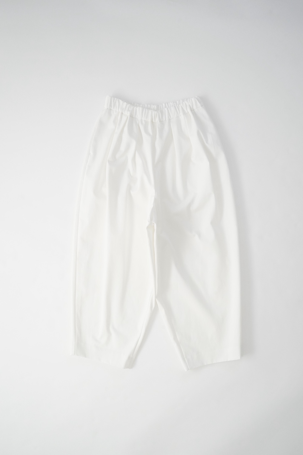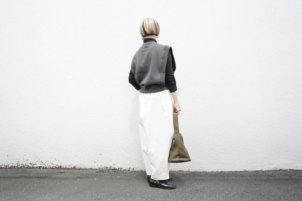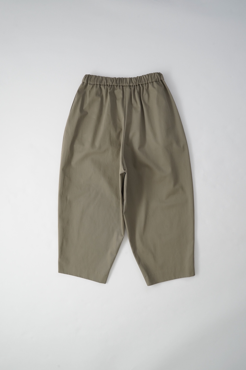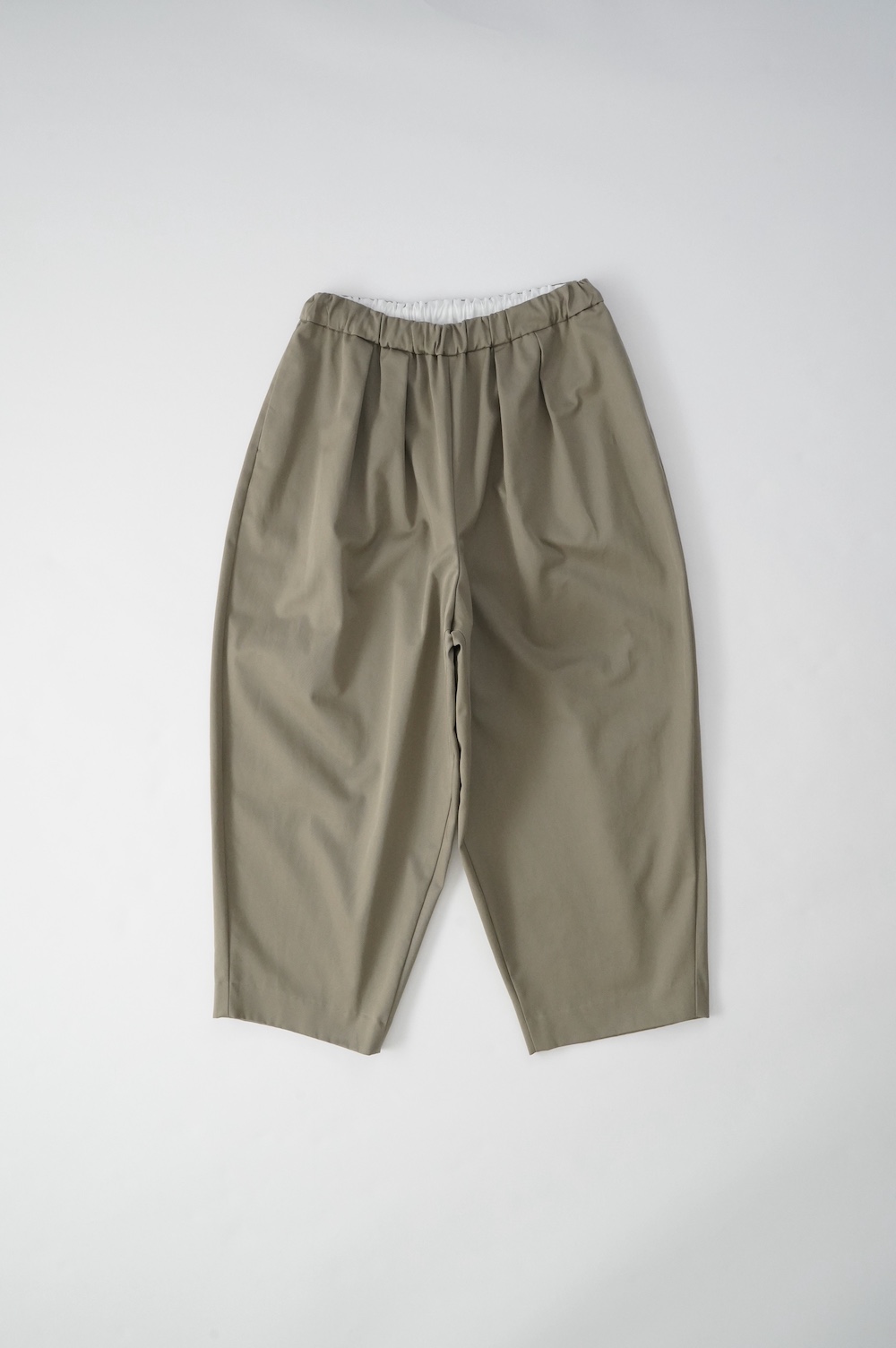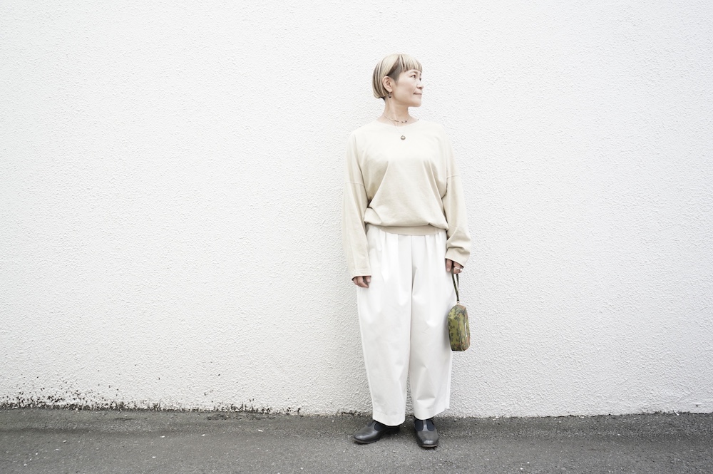 デザインはフロントに2タックが入ったテーパードシルエットのデザイン。脇に少しカーブをつけて、尖りすぎていない丸みのあるシルエットです。ウエストはゴムと紐で、イージーパンツということを感じさせない、すっきりとしたウエスト周りです。