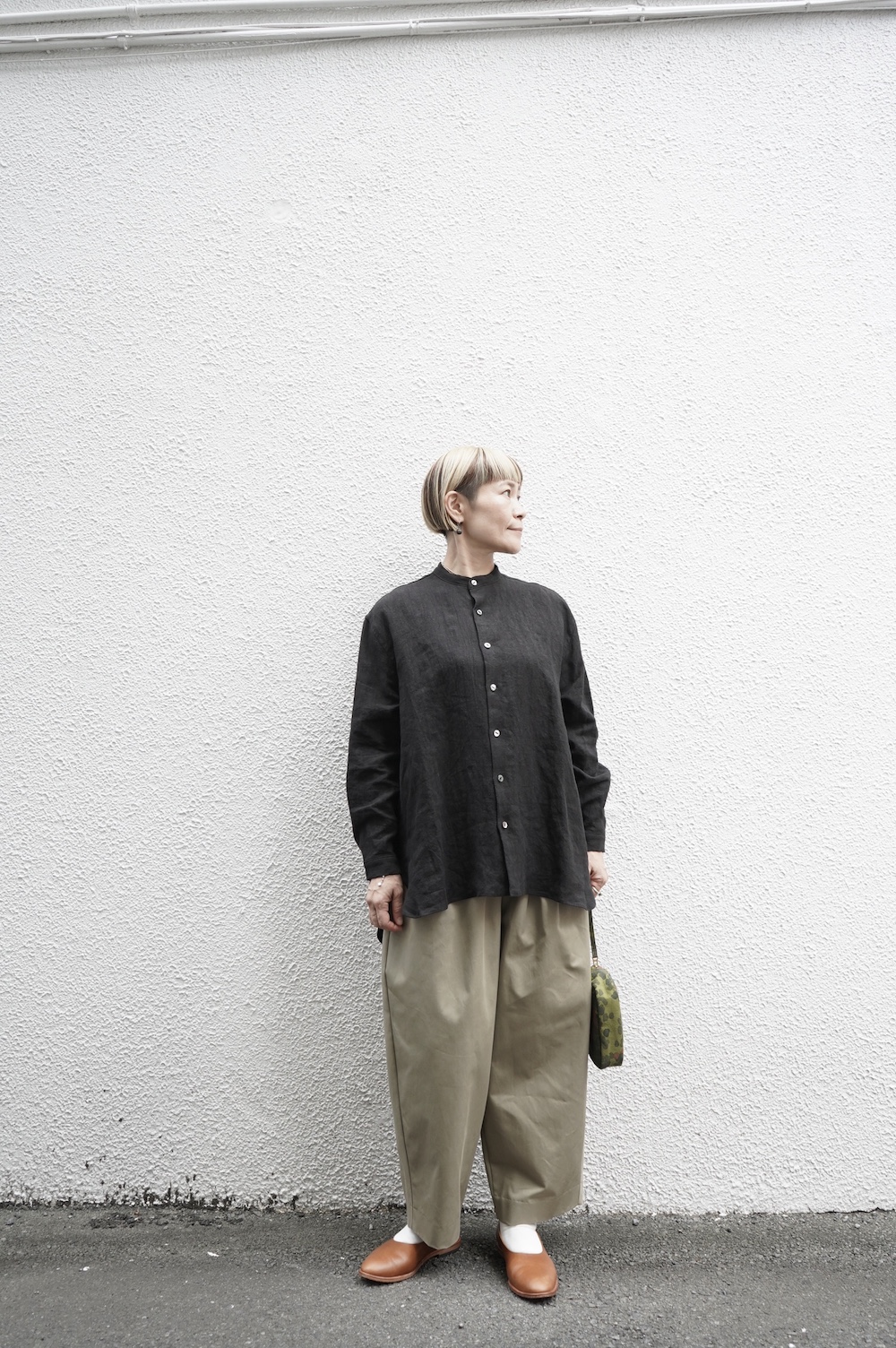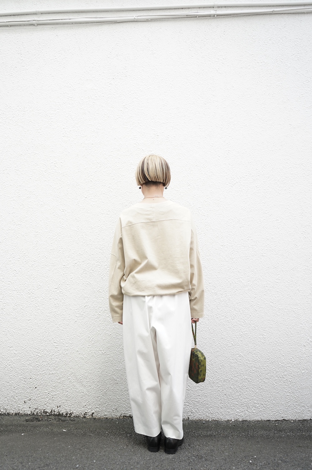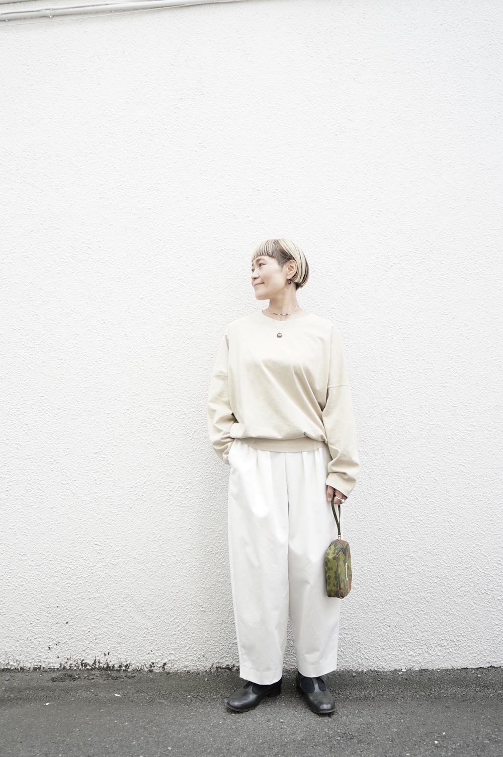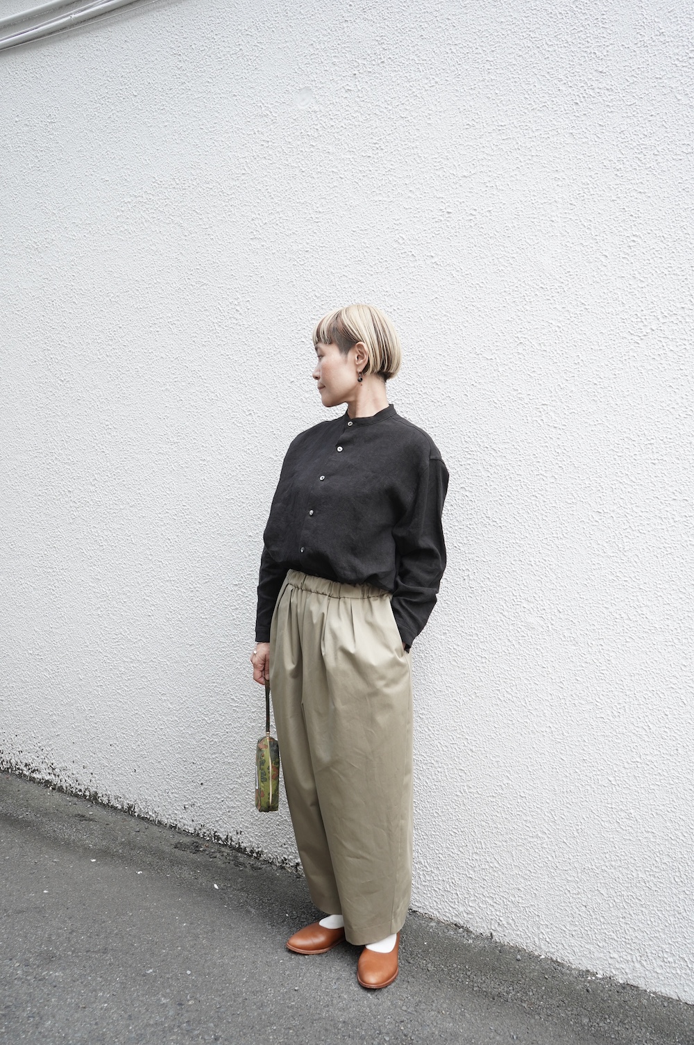 デザインはフロントに2タックが入ったテーパードシルエットのデザイン。脇に少しカーブをつけて、尖りすぎていない丸みのあるシルエットです。ウエストはゴムと紐で、イージーパンツということを感じさせない、すっきりとしたウエスト周りです。
