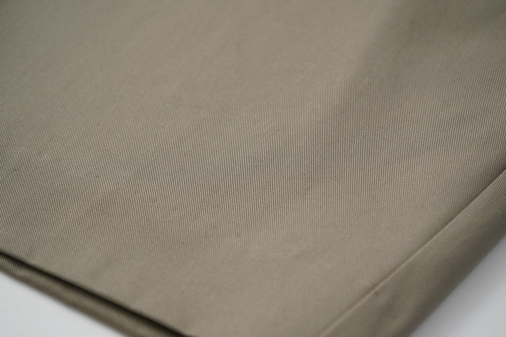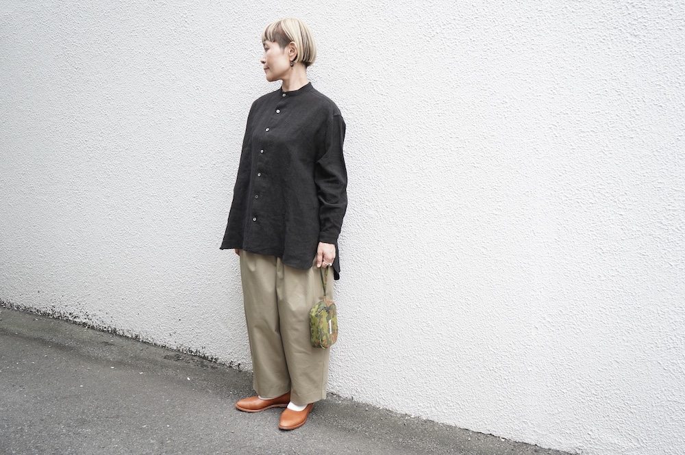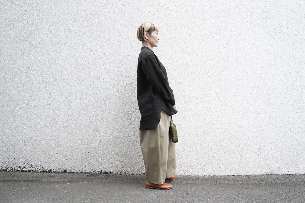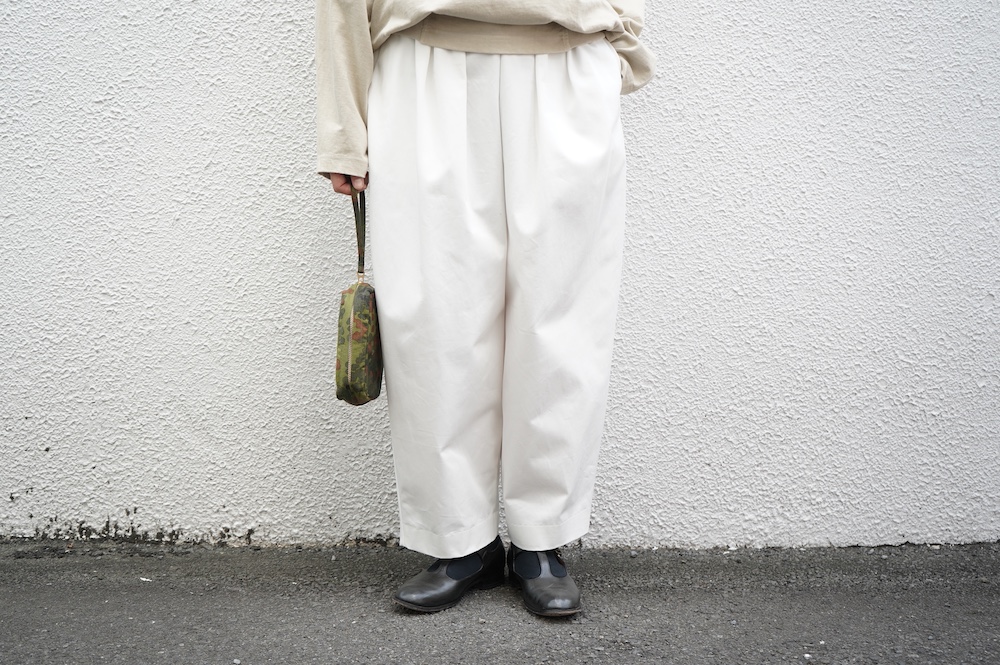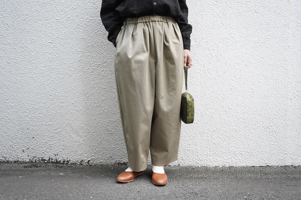 "エシュぺー"のパンツ。今シーズンから生地がリニューアルしたトラウザーパンツ。細番手のオーガニックコットンを高密度に織り上げたチノクロスは、軽くてしなやかな落ち感のある生地に仕上がっています。日常的でありながら、光沢感が程よく少し上品な雰囲気に穿いていただけます。