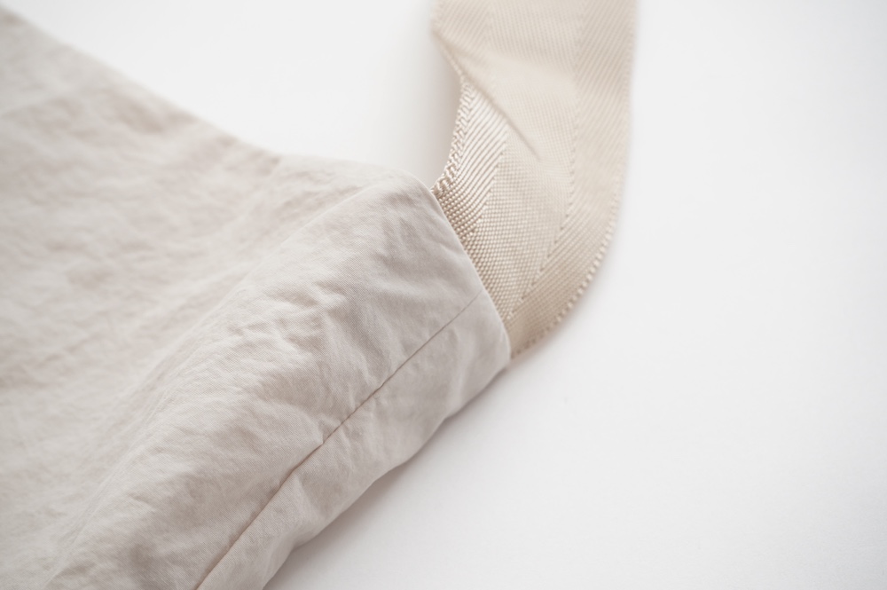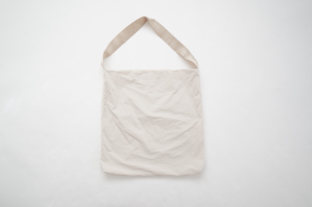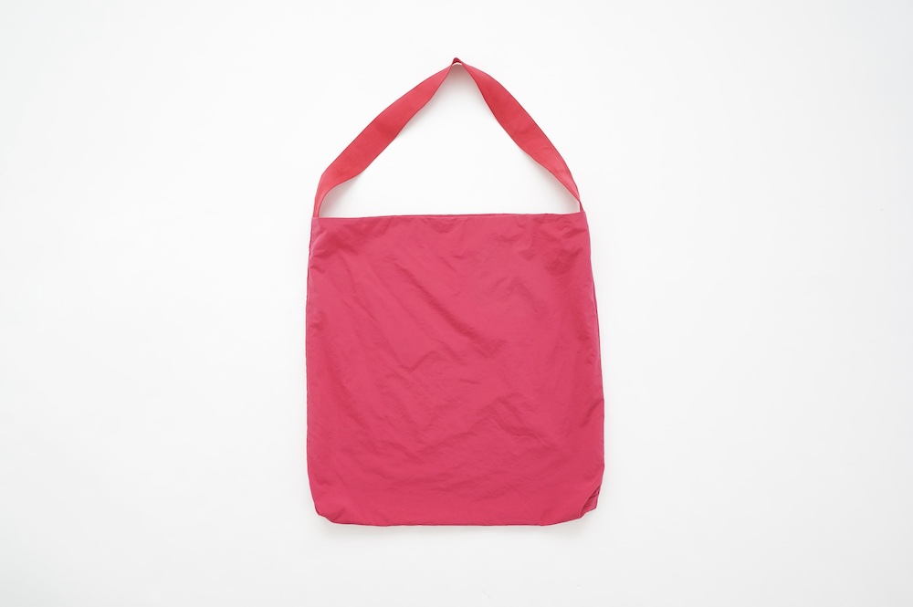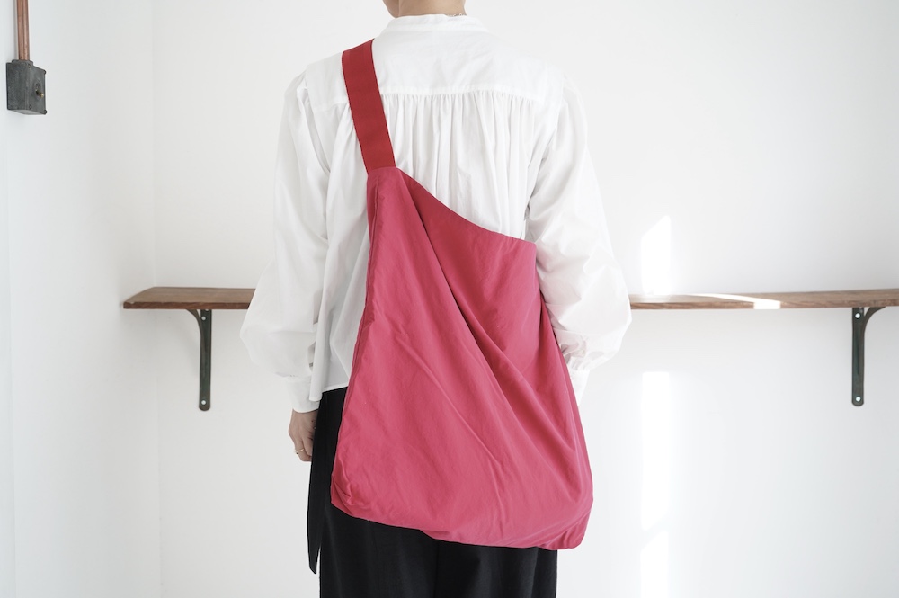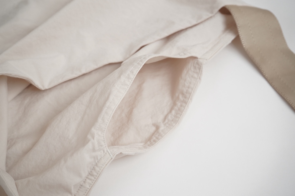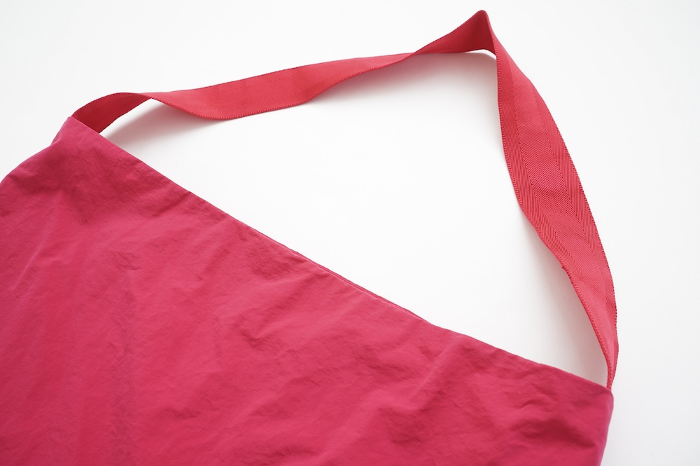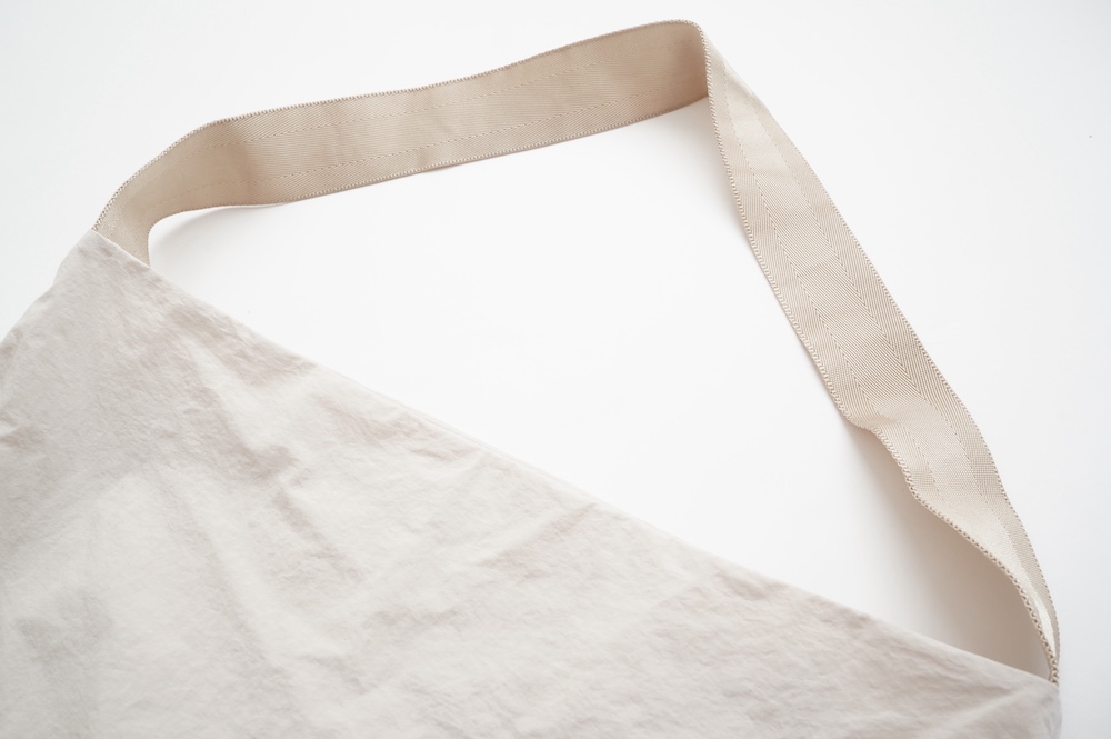 よこ糸にやや太めの糸を用いるタッサーナイロン素材は、「コットンじゃないの?」と思えるくらいの素材感と軽さです。本体は共布が二重になっており、裏地は埃が溜まりにくいように裏地使いしています。また携帯などが入る内ポケットもあり、収納量もかなりございます。ベルト部分は同じナイロンですが、ベルトのナイロンは滑りの良い、誰もがナイロンだと思えるベルトです。丈夫で滑りがよいので持ち手としては最良です。色が鮮やかに出るナイロンだからこその発色や独特の風合いをお楽しみください。また、斜め掛け、ワンショルダーで持つバッグは、男女どちらにもお勧めです。