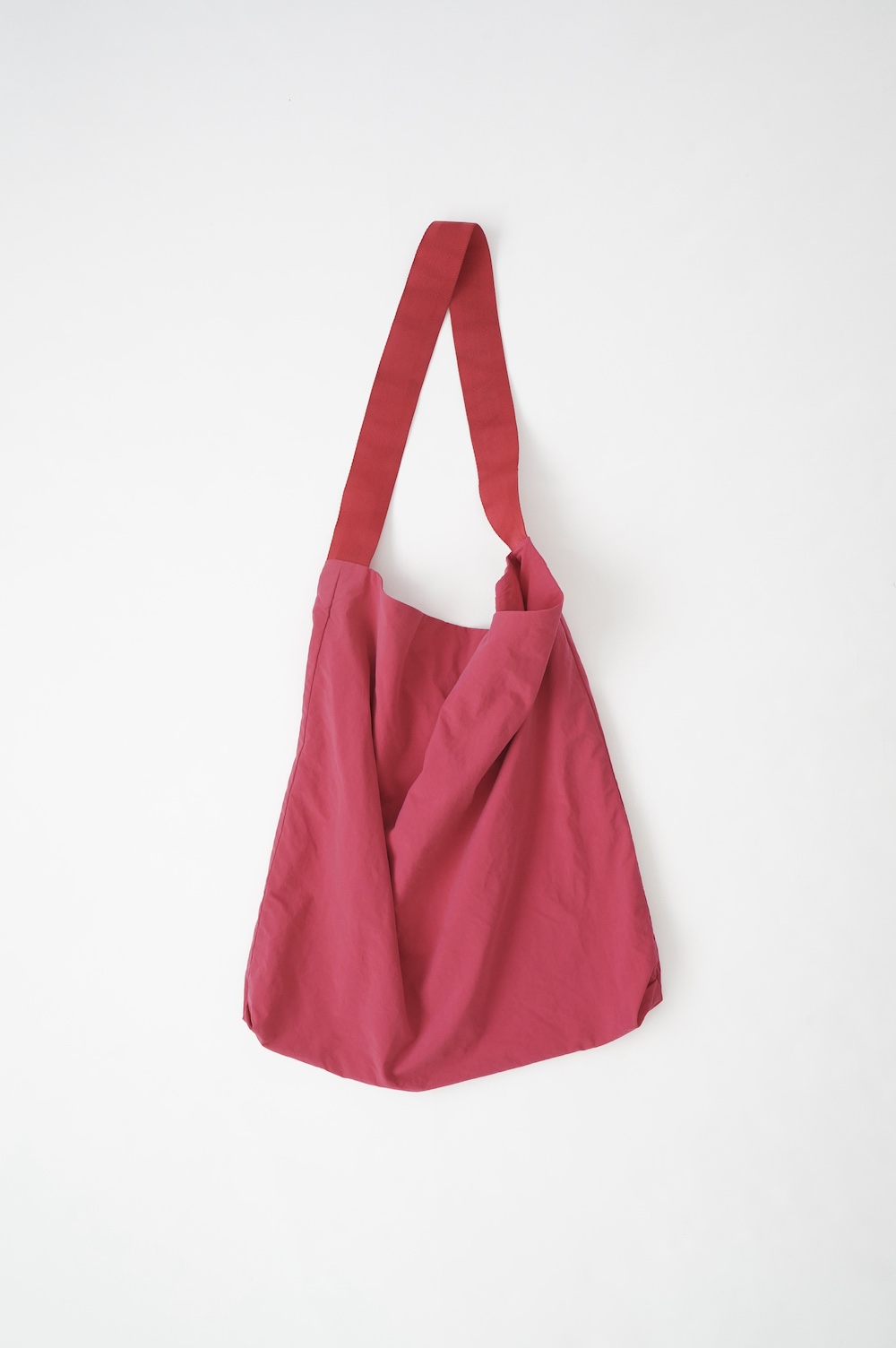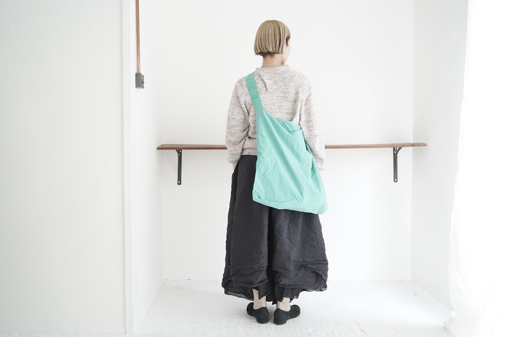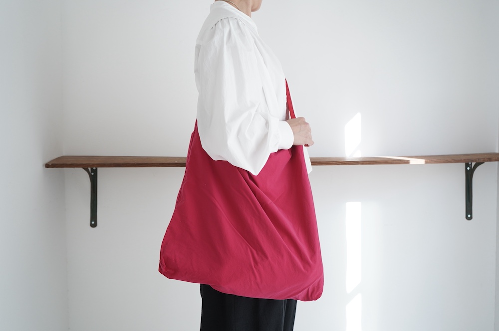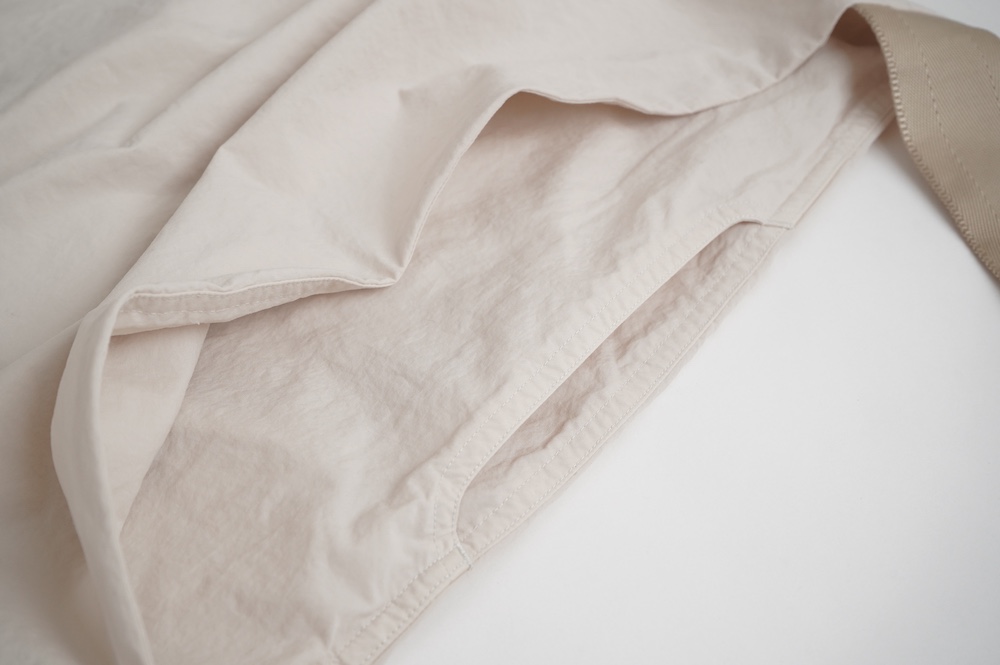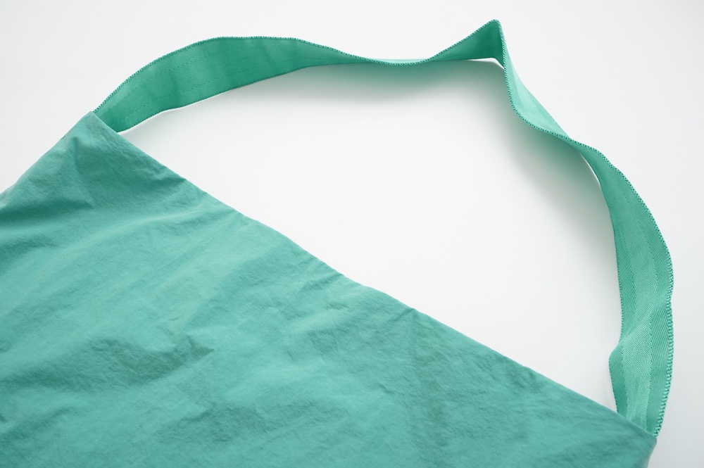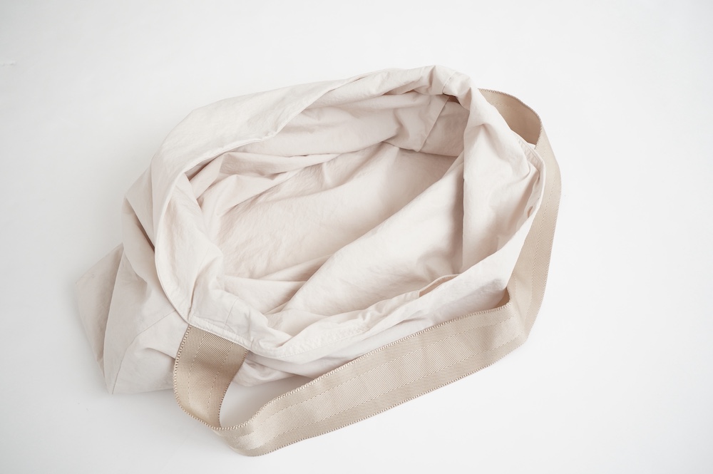 よこ糸にやや太めの糸を用いるタッサーナイロン素材は、「コットンじゃないの?」と思えるくらいの素材感と軽さです。本体は共布が二重になっており、裏地は埃が溜まりにくいように裏地使いしています。また携帯などが入る内ポケットもあり、収納量もかなりございます。ベルト部分は同じナイロンですが、ベルトのナイロンは滑りの良い、誰もがナイロンだと思えるベルトです。丈夫で滑りがよいので持ち手としては最良です。色が鮮やかに出るナイロンだからこその発色や独特の風合いをお楽しみください。また、斜め掛け、ワンショルダーで持つバッグは、男女どちらにもお勧めです。